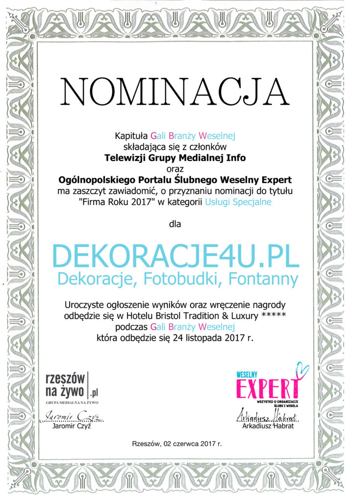 Po ubiegłorocznym sukcesie i zdobyciu tytułu FIRMY ROKU 2016 w kategorii DEKORACJE już dzisiaj chcemy się pochwalic kolejna nominacja na tytuł FIRMY ROKU w kategorii USŁUGI SPECJALNE - FotoBudka. Kapituła Gali Branzy Weselnej uznała ze firma Dekoracje4u.pl, która posiada w swojej ofercie Fotobudka4u.eu była jedna z najlepszych firm w naszym regionie oferując takie usługi.