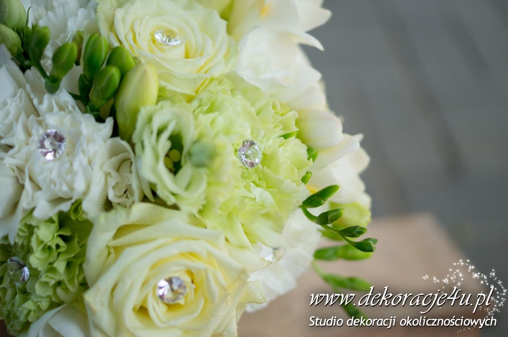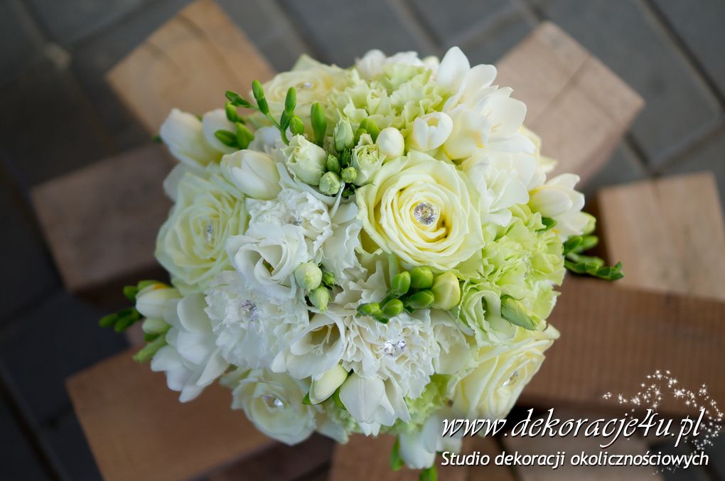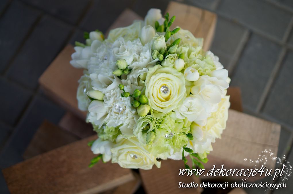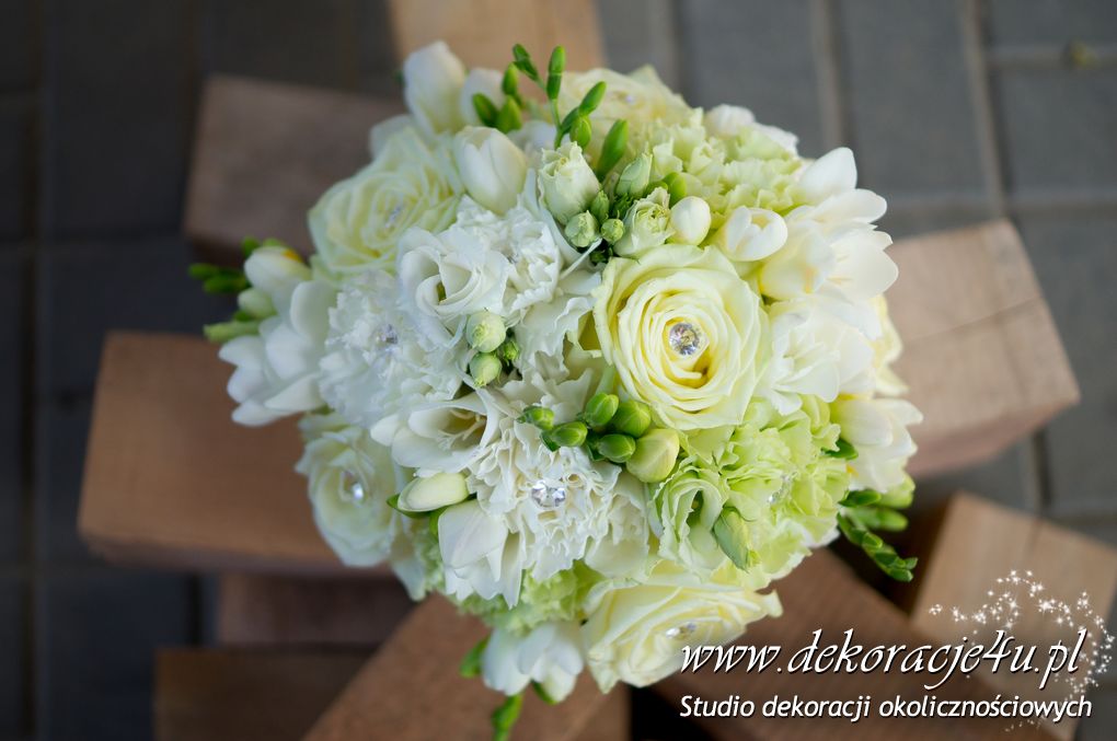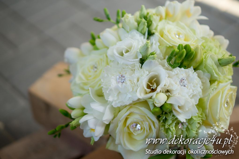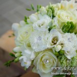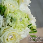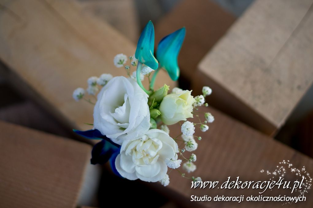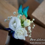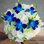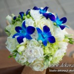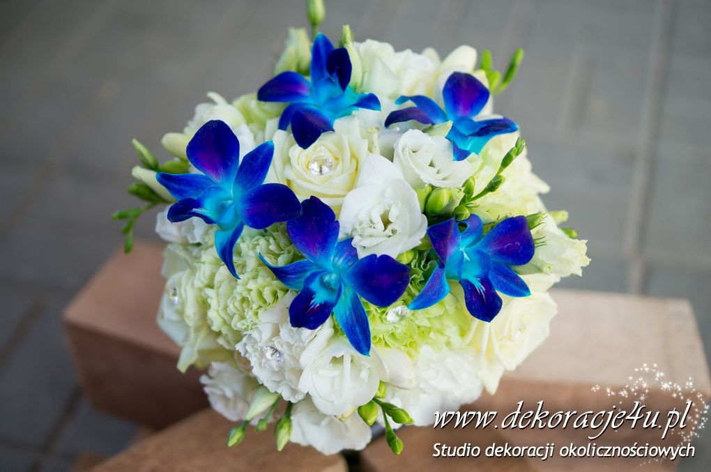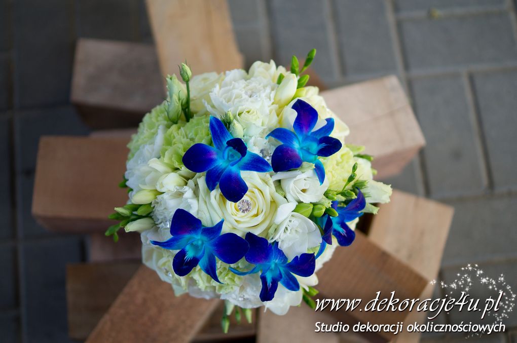 Bukiety ślubne pod kolor dekoracji. Jeden biały a drugi z dodatkiem niebieskiego storczyka wszystko to pod kolor dekoracji. W bukietach dodatkowo kryształki w kwiatach.