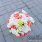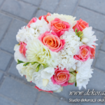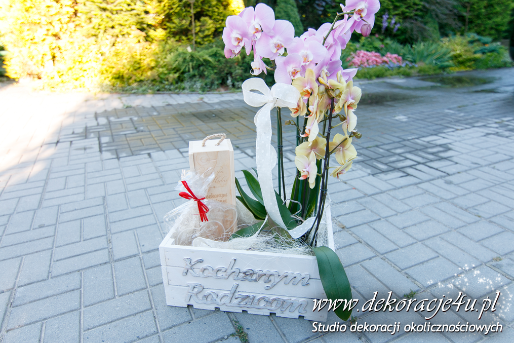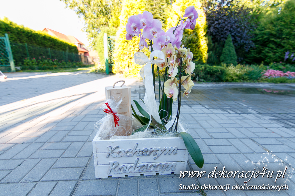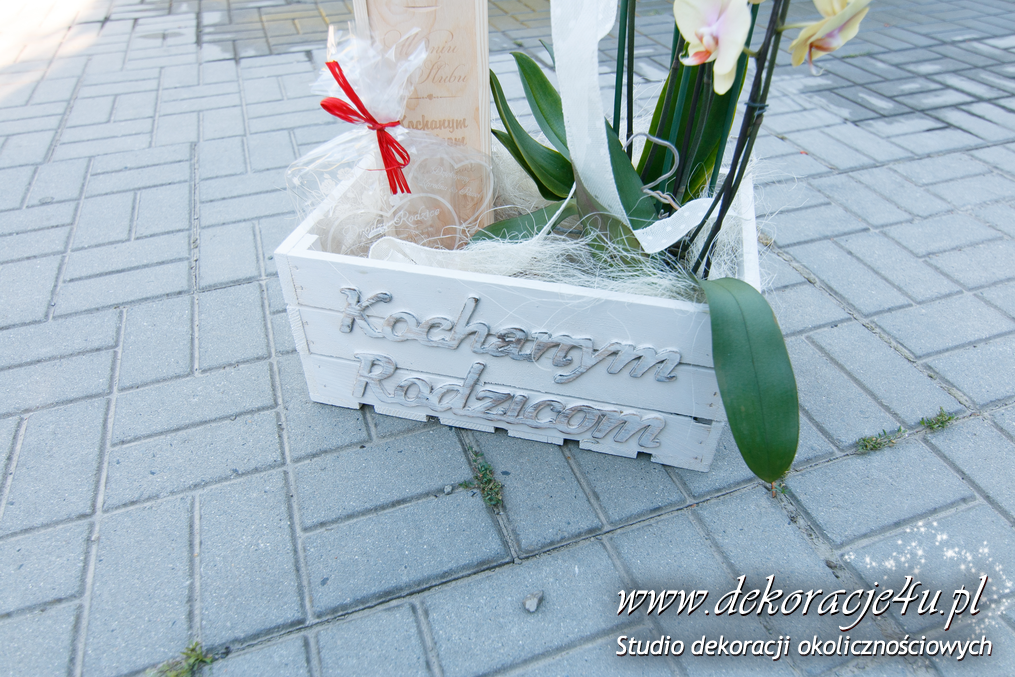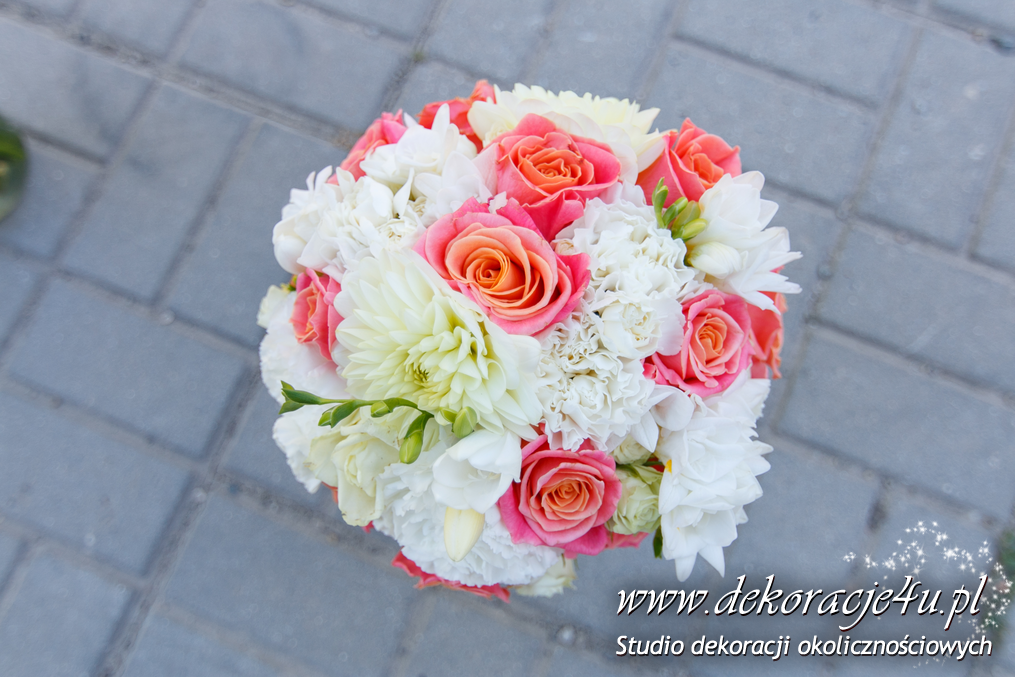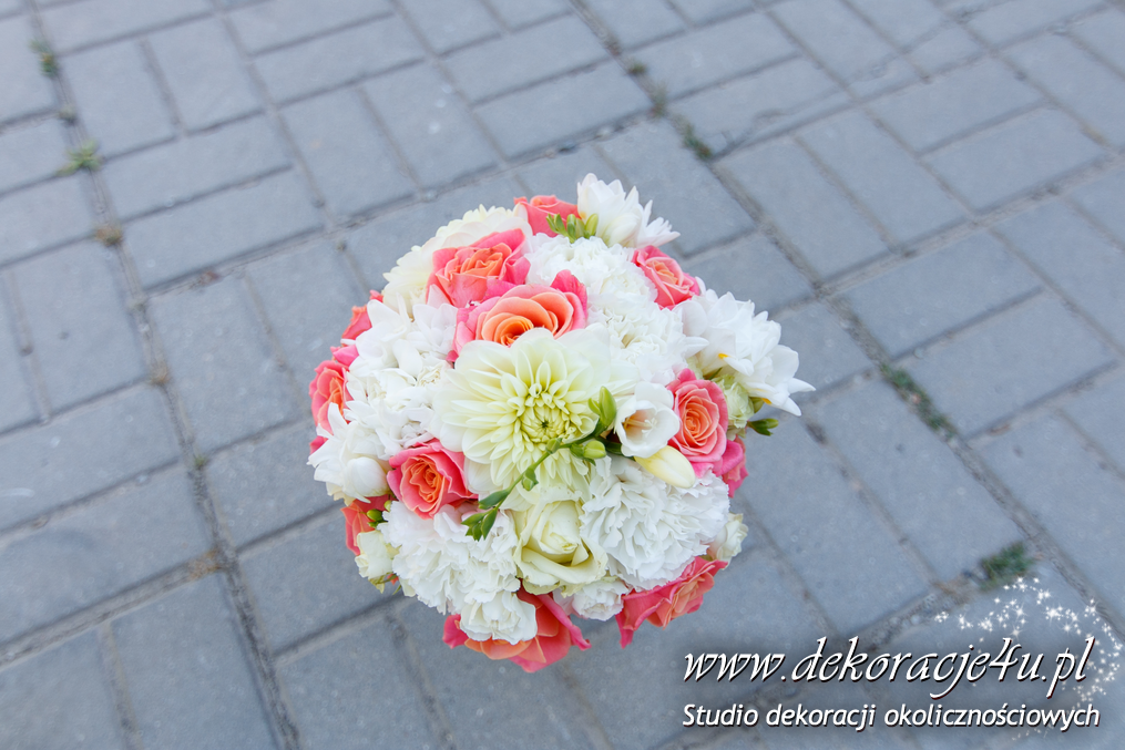 Wyjątkowe bukiety ślubne w tonacji brzoskwinki i bieli. Skrzyneczki z grawerem "Kochanym Rodzicom" dodały już totalnego uroku do całości na sali weselnej jak i w ręku Pani Młodej.