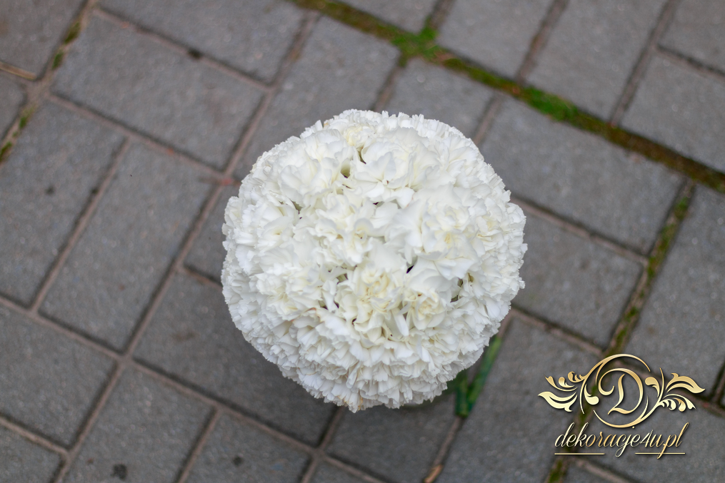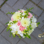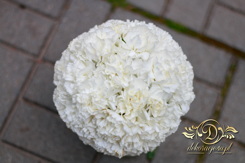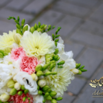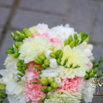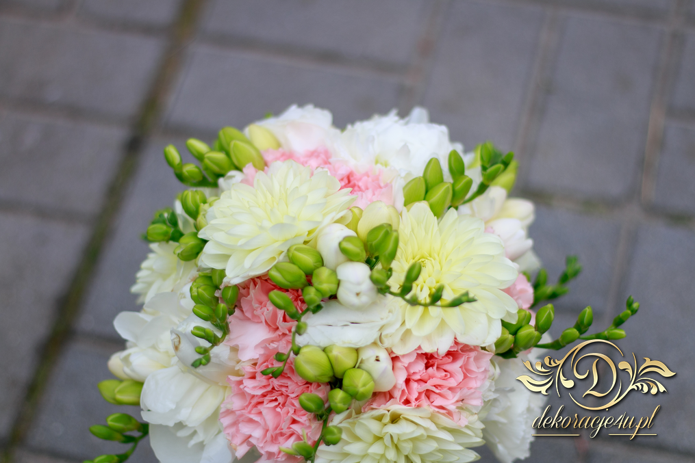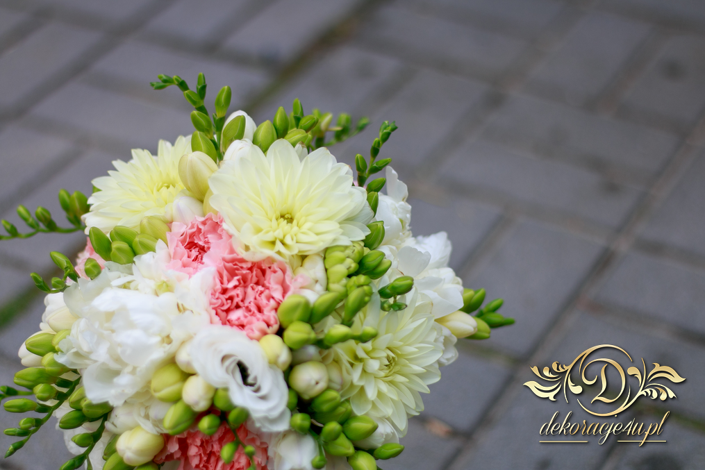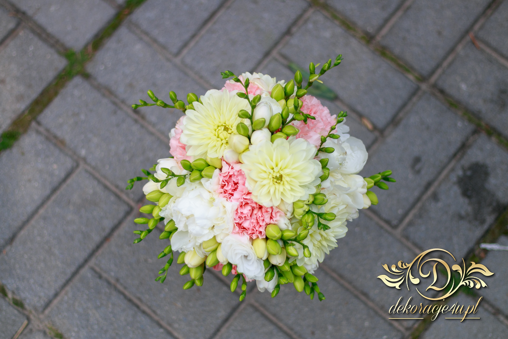 Bukiet składający się z frezji, goździk i dalii robi wrażenie. Drugi bukiet, który wybrała sobie w tym wyjątkowym dniu Pani Młoda to biały goździk.