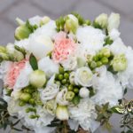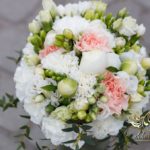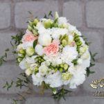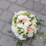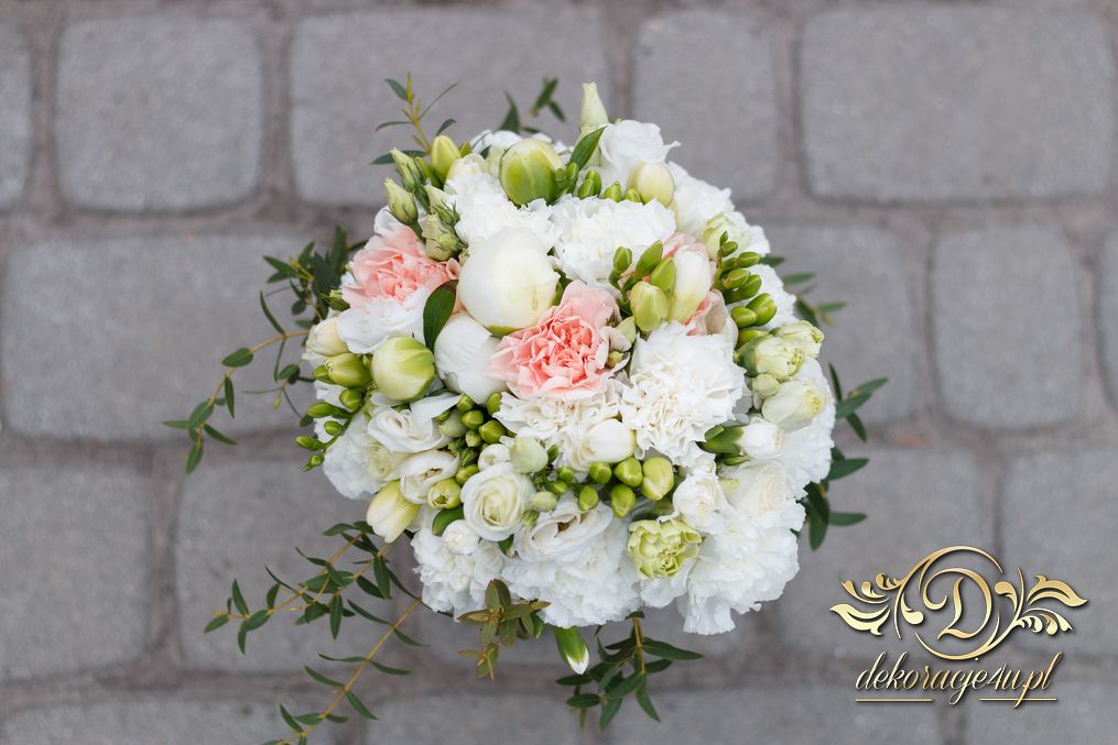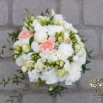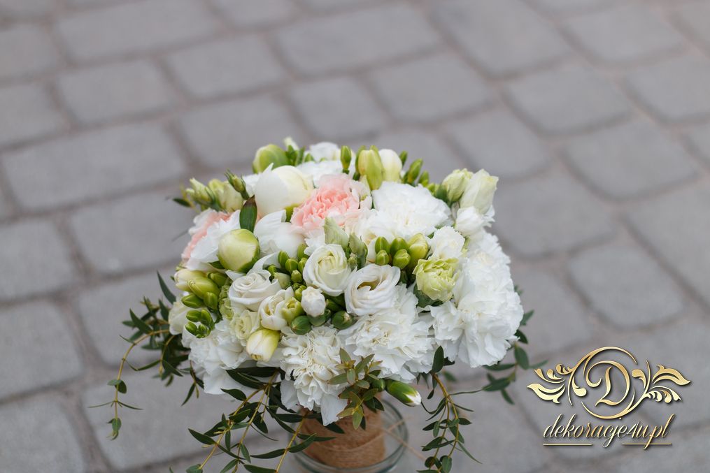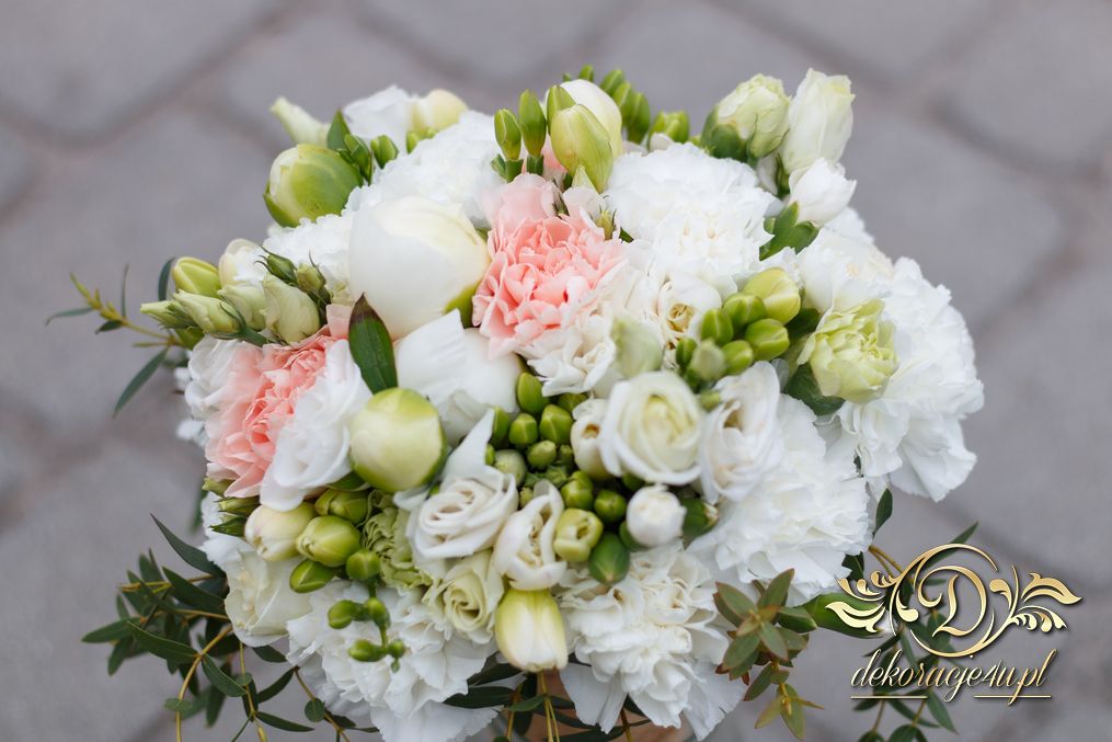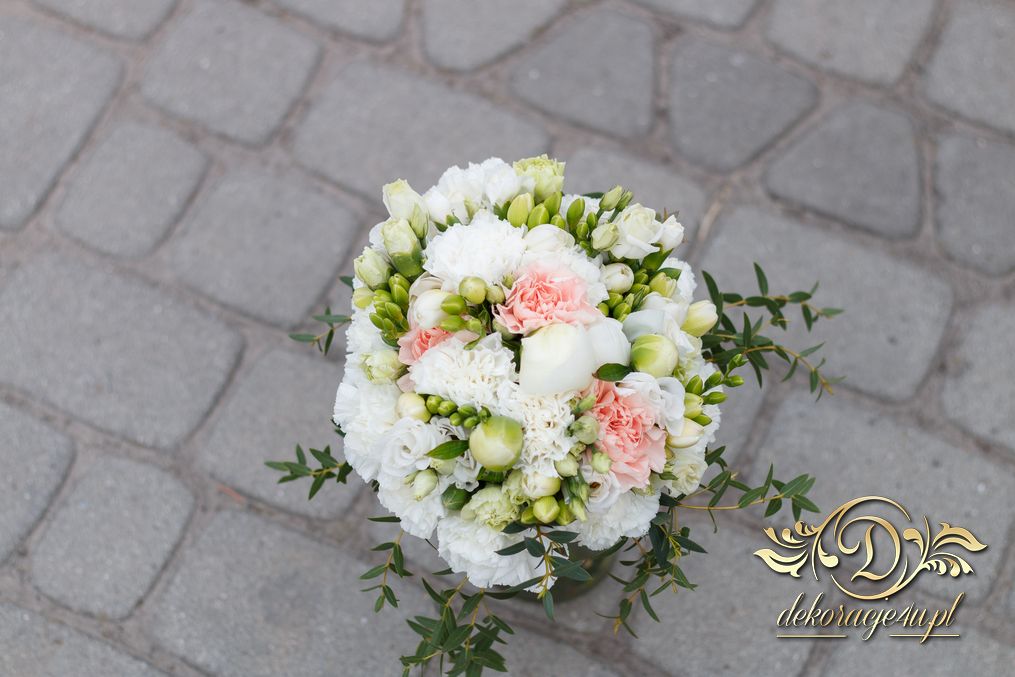 Piękny i delikatny bukiet ślubny w tonacji bieli i zieleni z akcentem brzoskwini. Kwiaty wykorzystane w projekcie to eustoma, goździk, frezja i liście eukaliptusa.