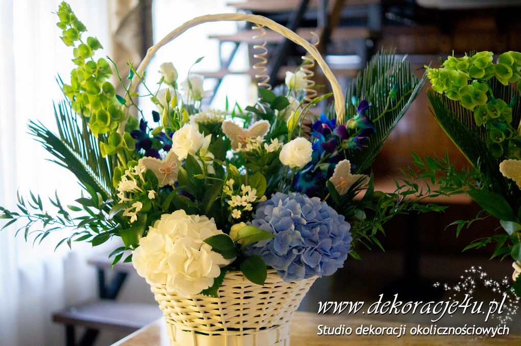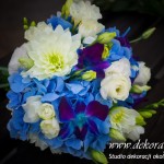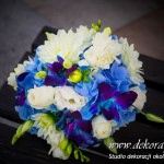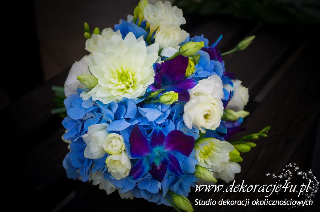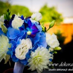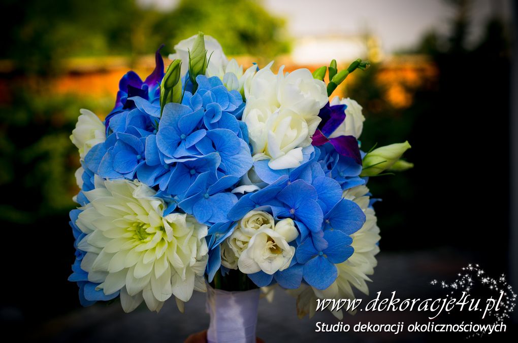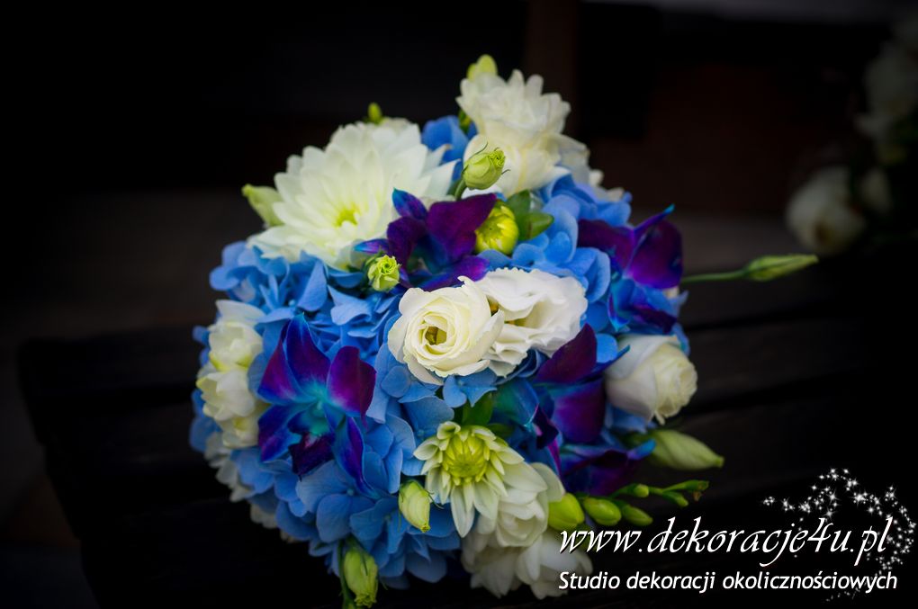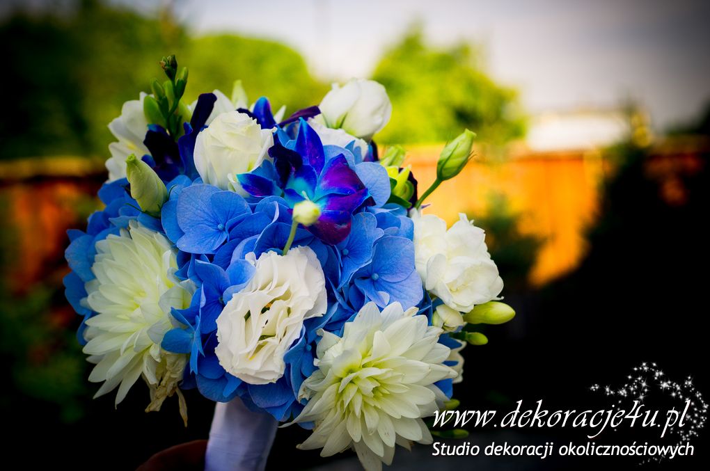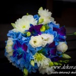 Bukiety ślubne w kolorach bieli a drugi w kolorach bieli z dodatkiem niebieskiego - wszystko pod kolor dekoracji - galeria pod linkiem.