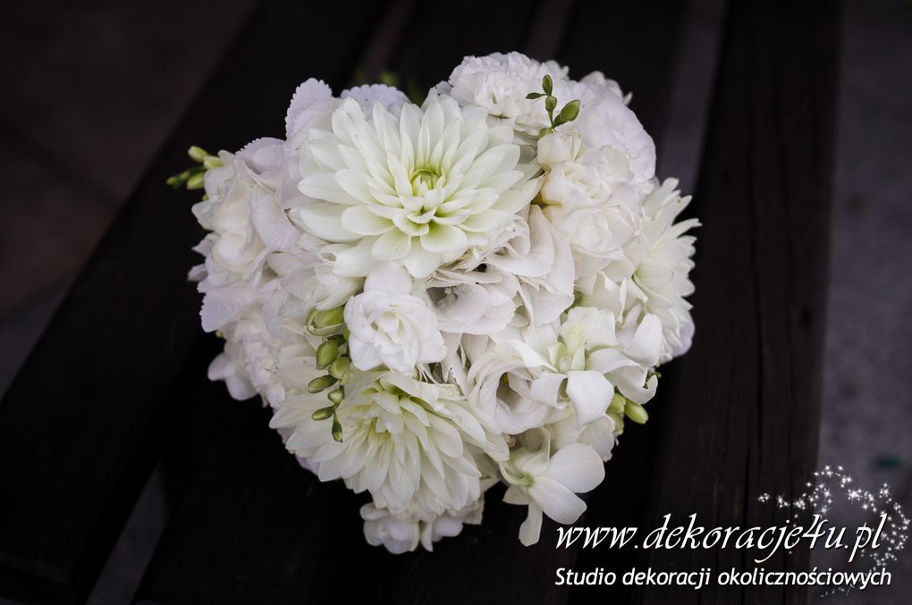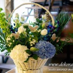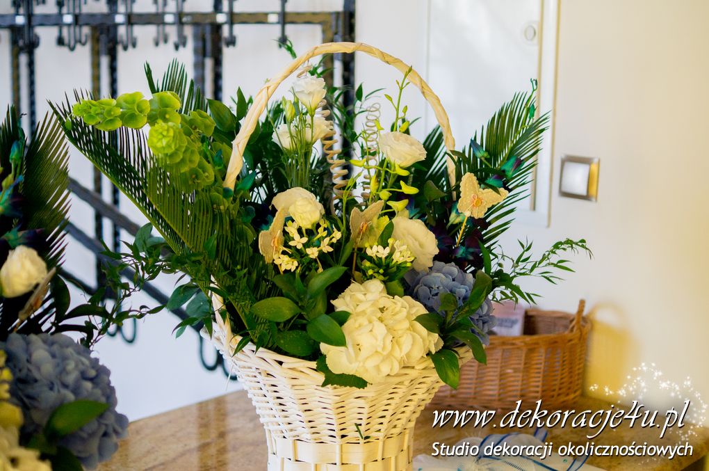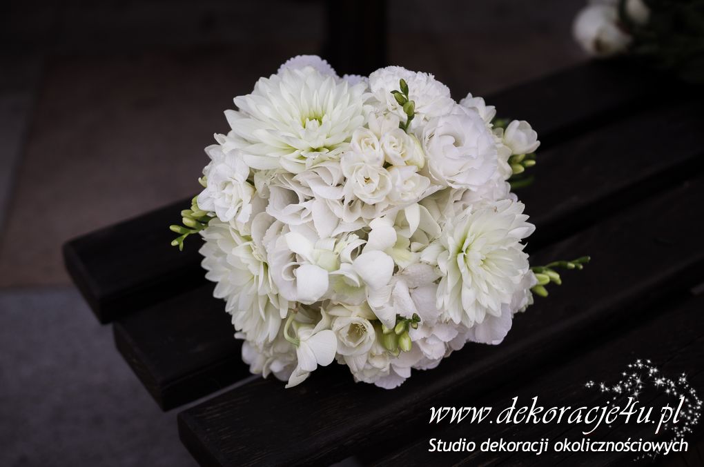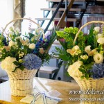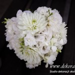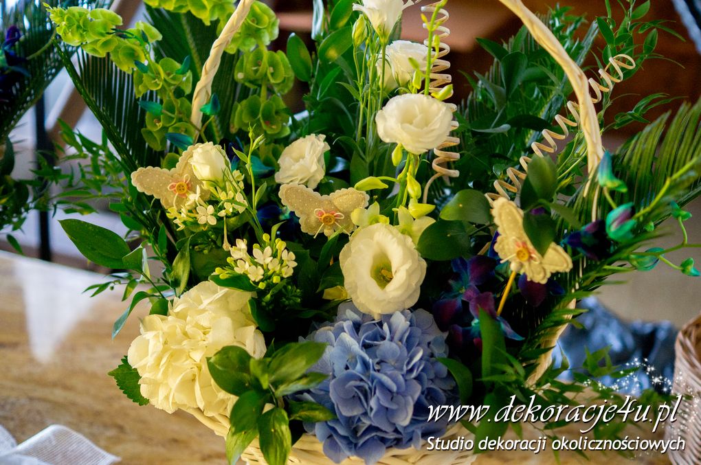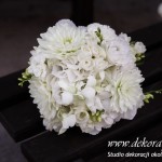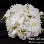 Bukiety ślubne w kolorach bieli a drugi w kolorach bieli z dodatkiem niebieskiego - wszystko pod kolor dekoracji - galeria pod linkiem.