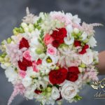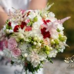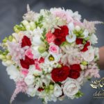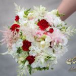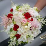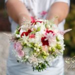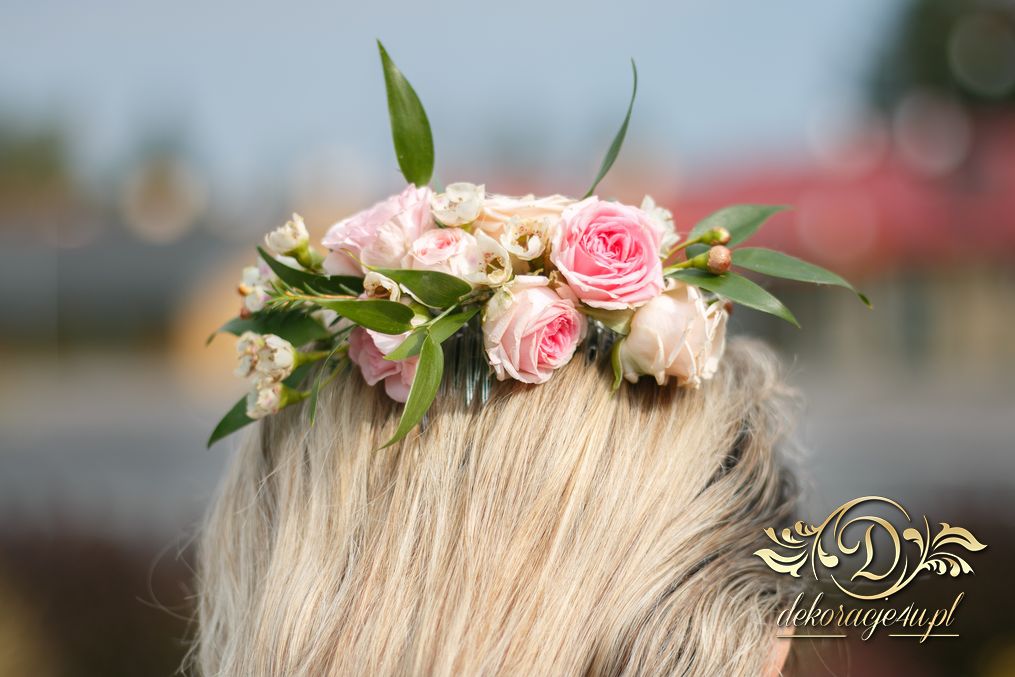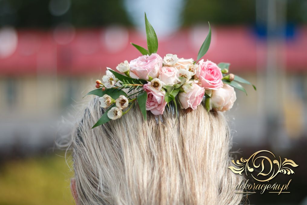 Piękne bukiety ślubne wykonane dla Bardzo Miłej Pani Młodej. Dodatkowo spinka na włosy, aby dopełnić dekorację na sali weselnej i bukiet w ręce.