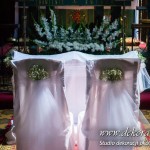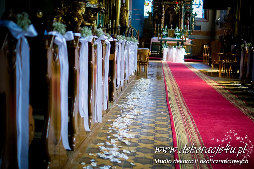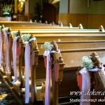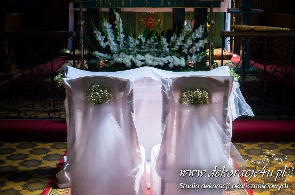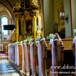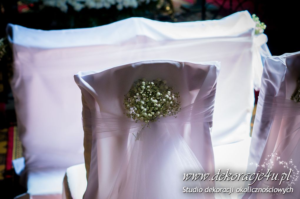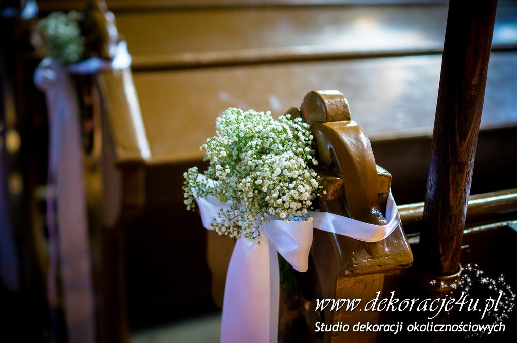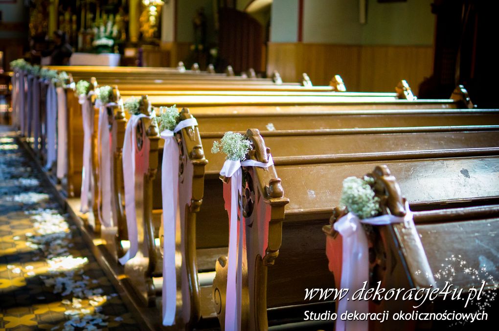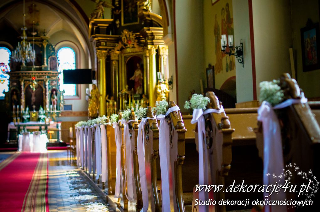 Delikatna dekoracja kościoła w Albigowej - gipsówka motywem przewodnim. Na ławeczkach bukiecik ze wstążką, delikatna dekoracja krzeseł młodych. Bukiety na ołtarze w delikatnej bieli.