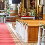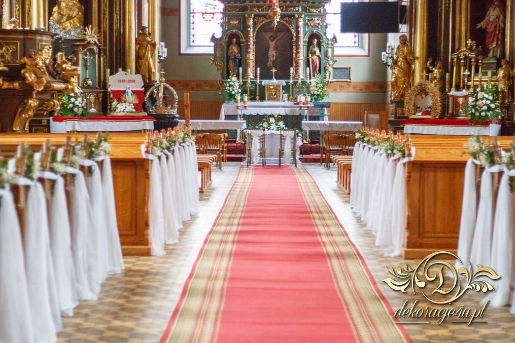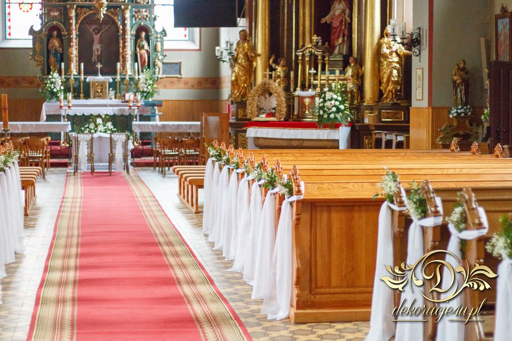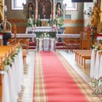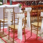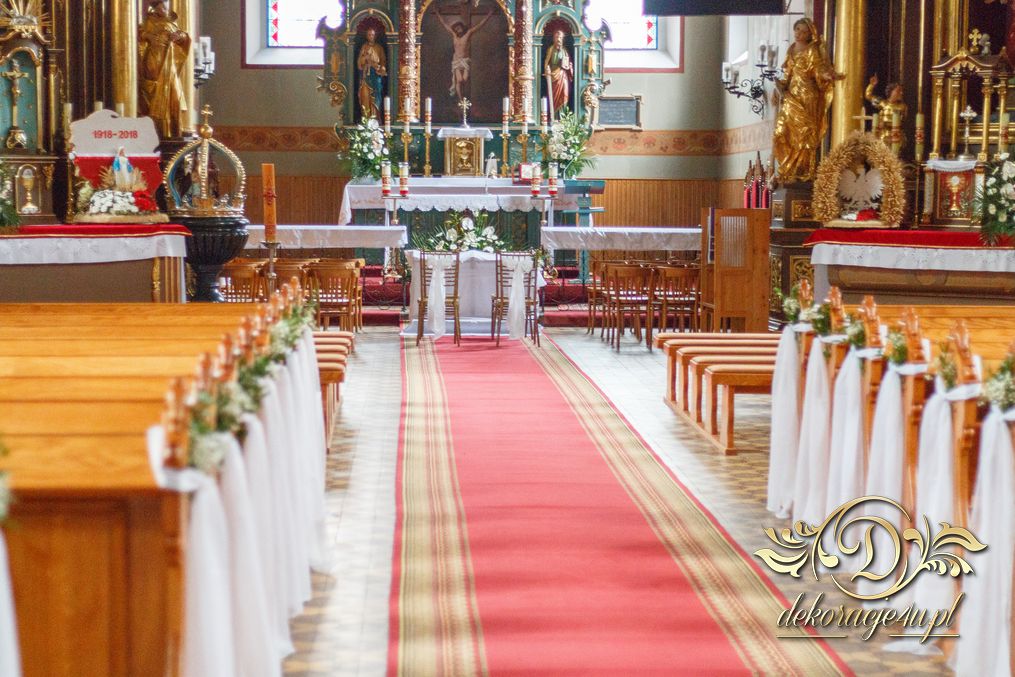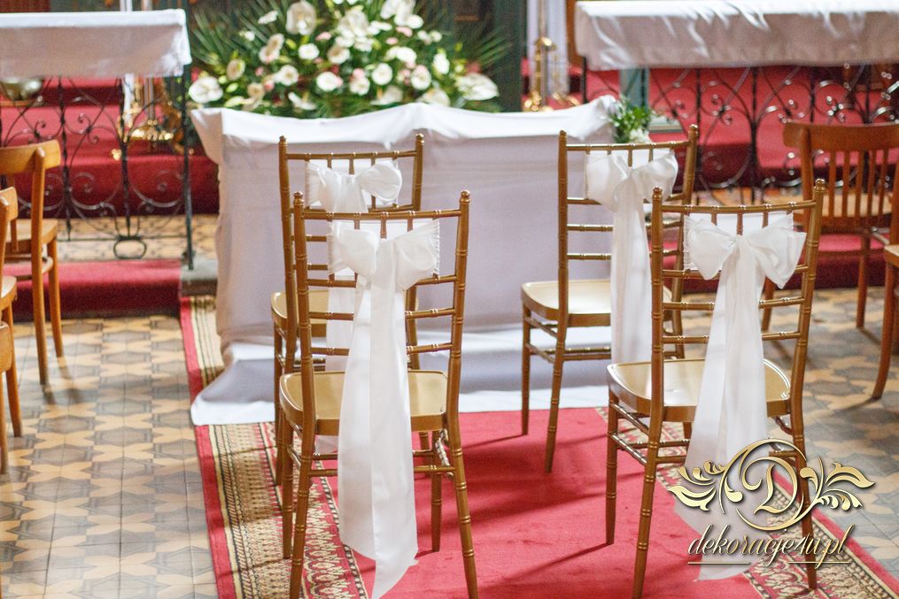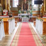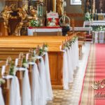 W naszej ofercie pojawiły się krzesła w kilku możliwych opcjach. Tym razem mamy do czynienia Chiavari. Pięknie wkomponowały się w kościół Albigowej. Przez całą alejkę na ławkach bukiecik z kokardą.