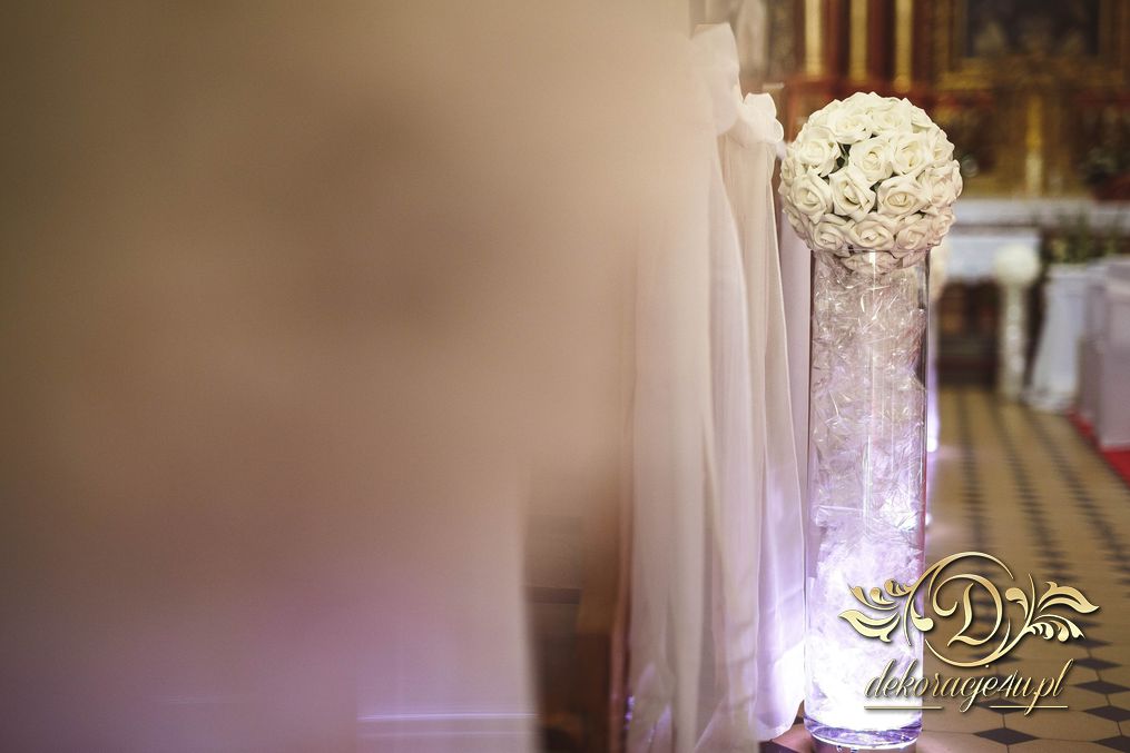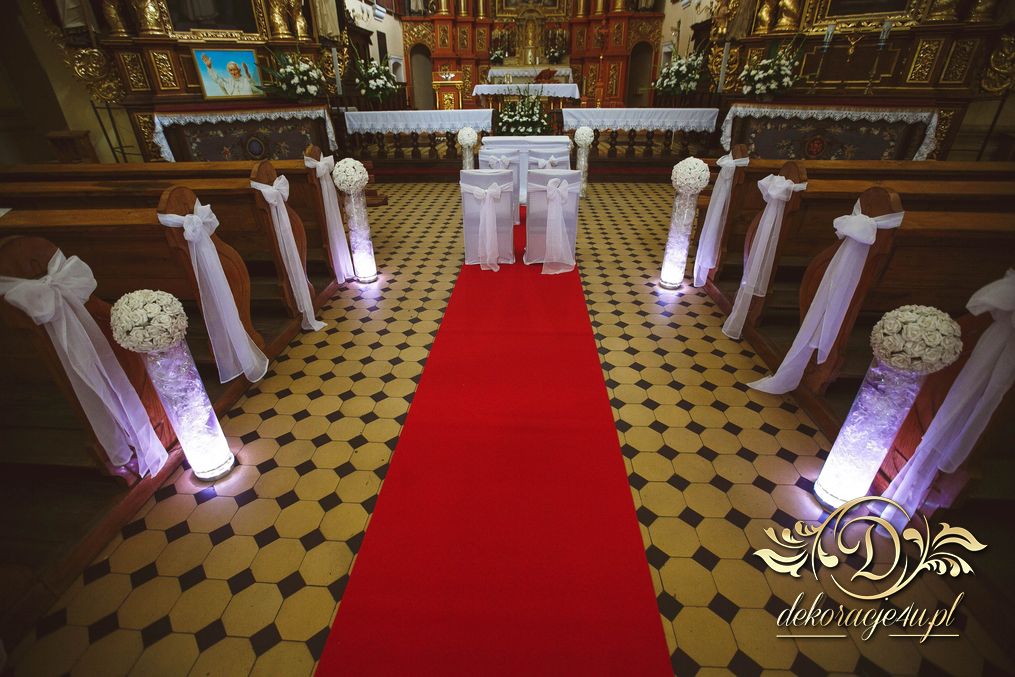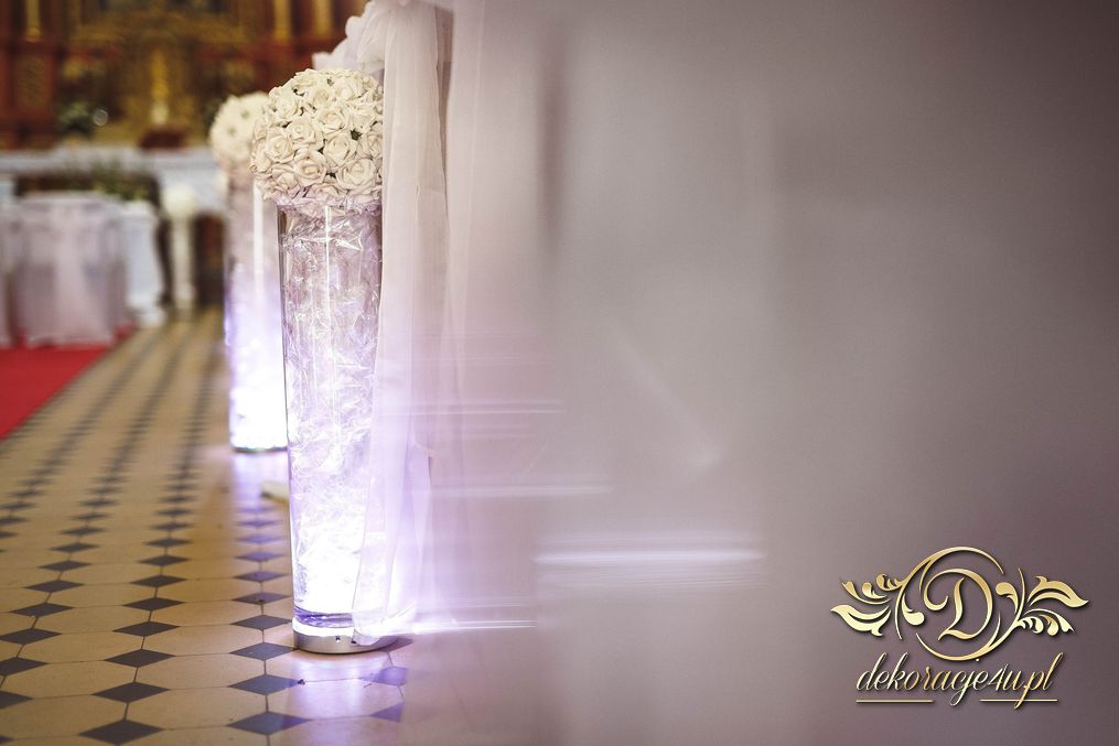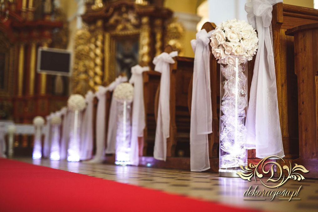 W dekoracji kościoła można także użyć (zależności od zezwolenia osoby decyzyjnej w danym kościele) małych lampek ledowych, aby podświetlić wazony przy ławeczkach. Efekt końcowy wyszedł niesamowicie.