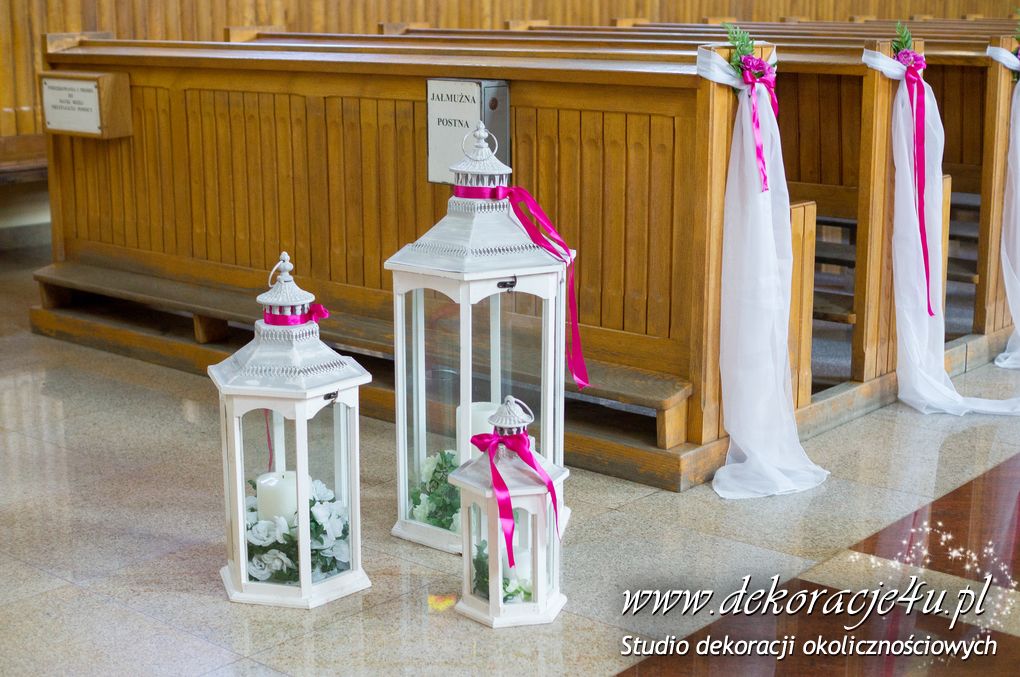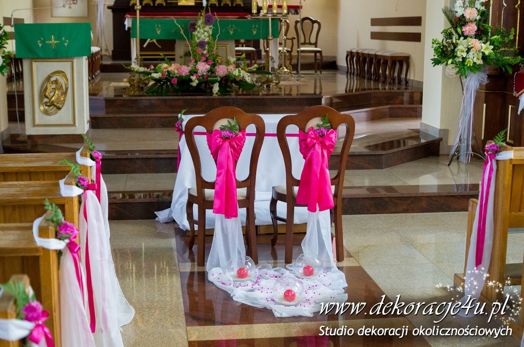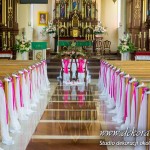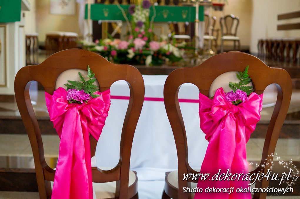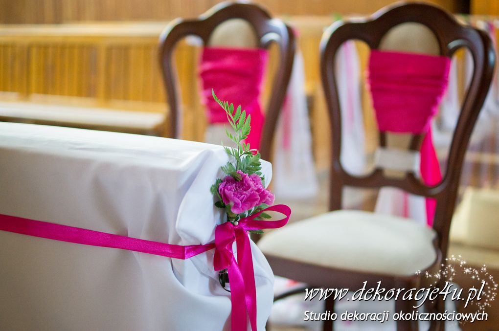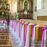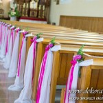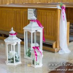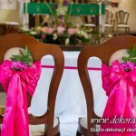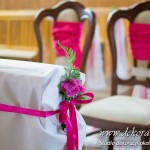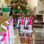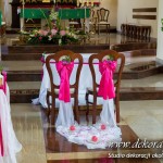 Kolory dekoracji to ciemny różowy. Na ławeczkach bukieciki z szarfami białymi i całość kończąca lampiony. Krzesła i klęcznik przyozdobione delikatnie.