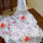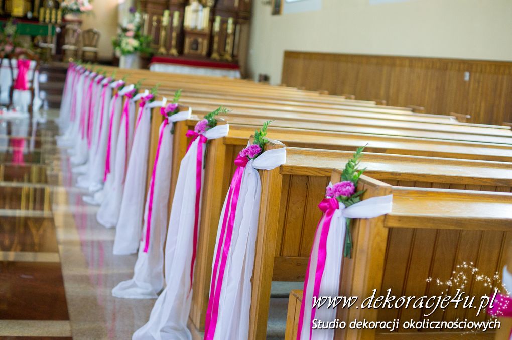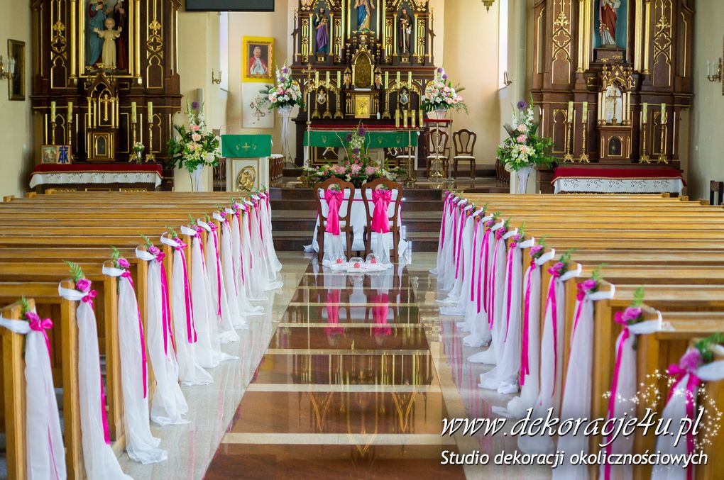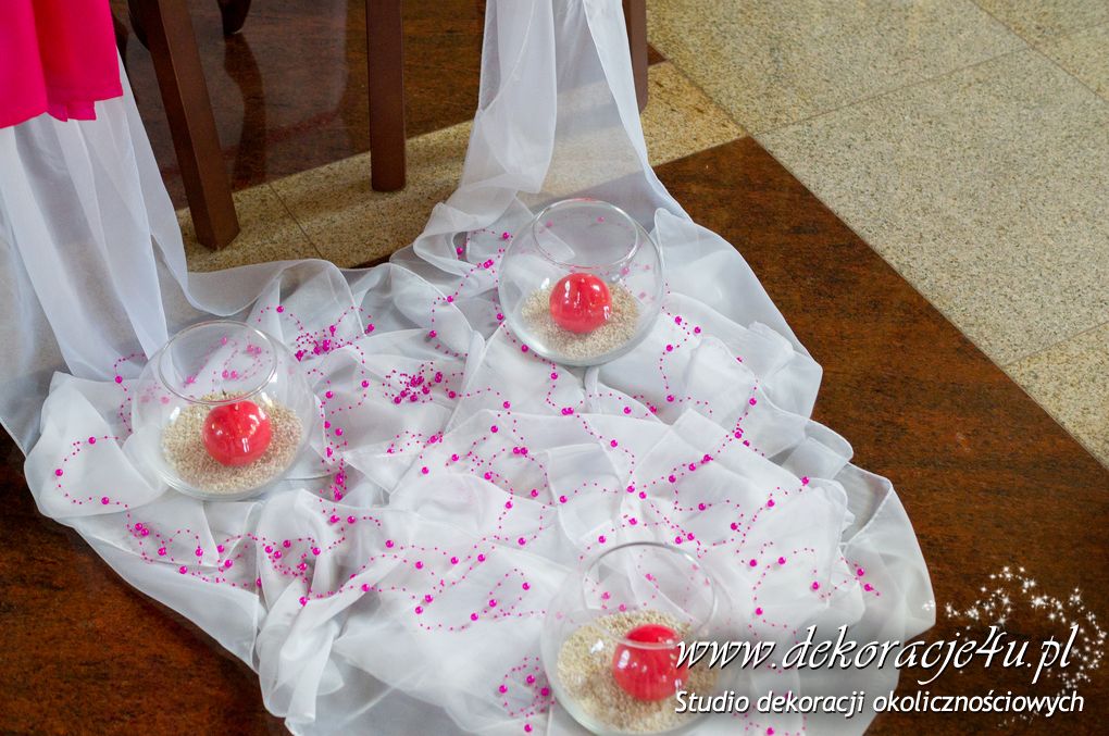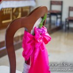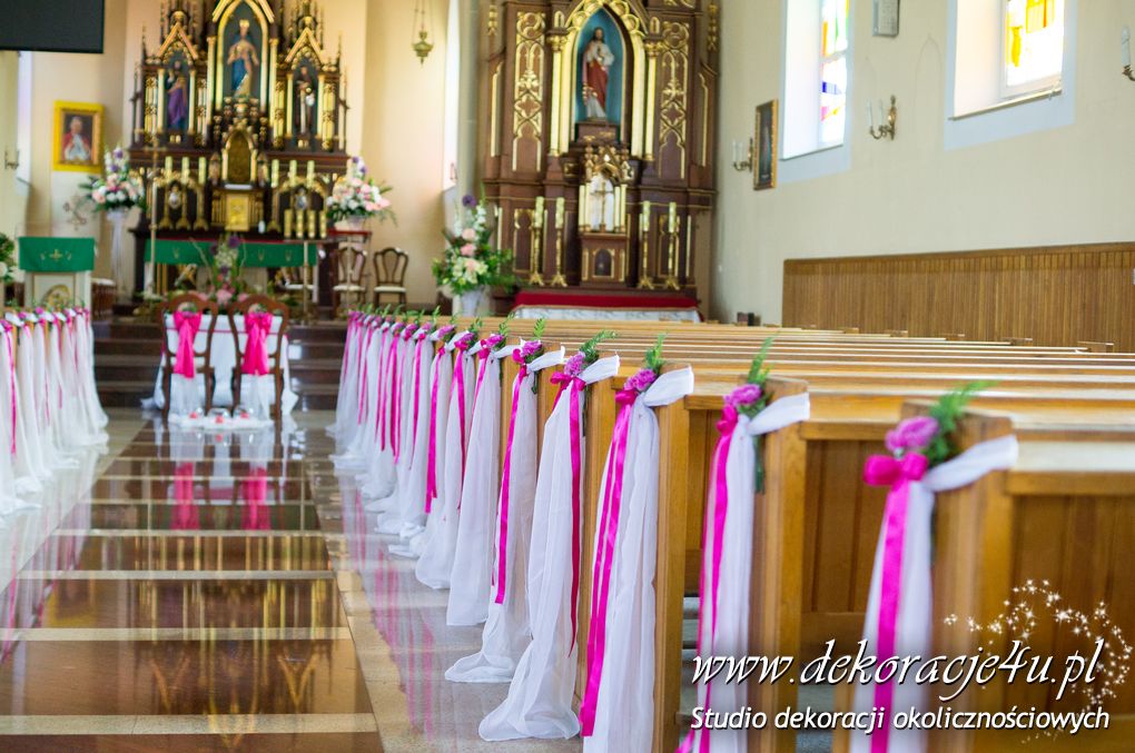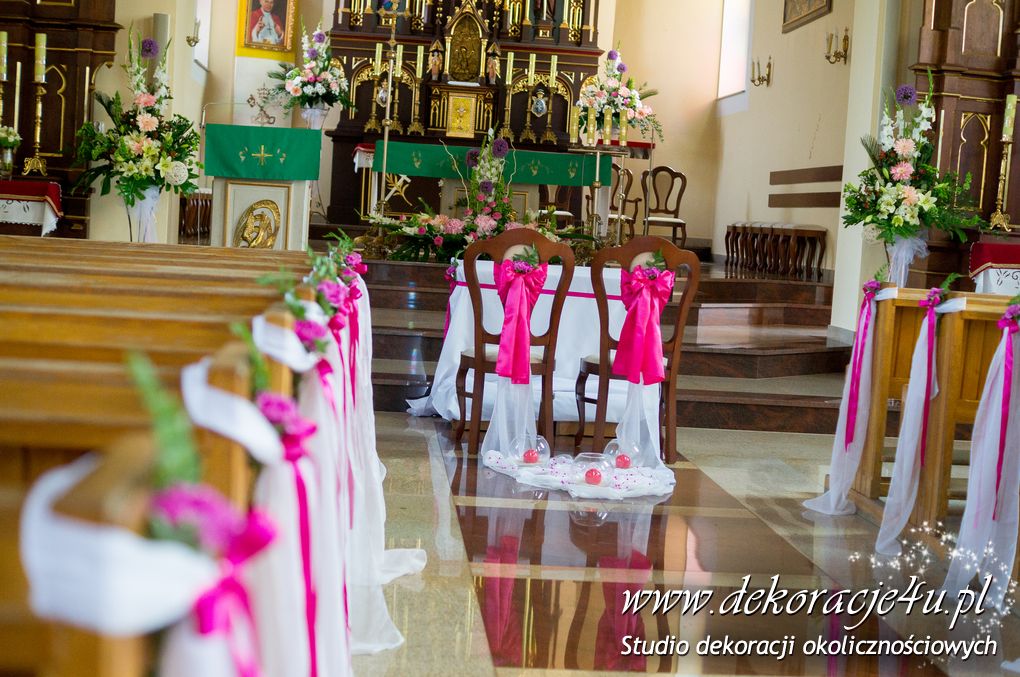 Kolory dekoracji to ciemny różowy. Na ławeczkach bukieciki z szarfami białymi i całość kończąca lampiony. Krzesła i klęcznik przyozdobione delikatnie.