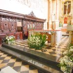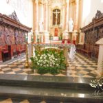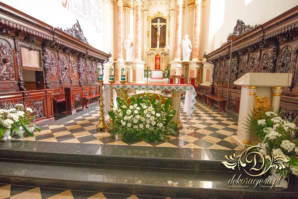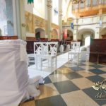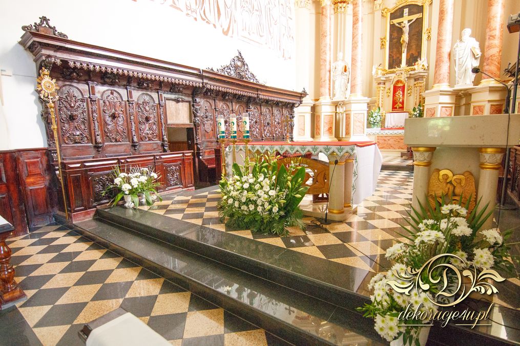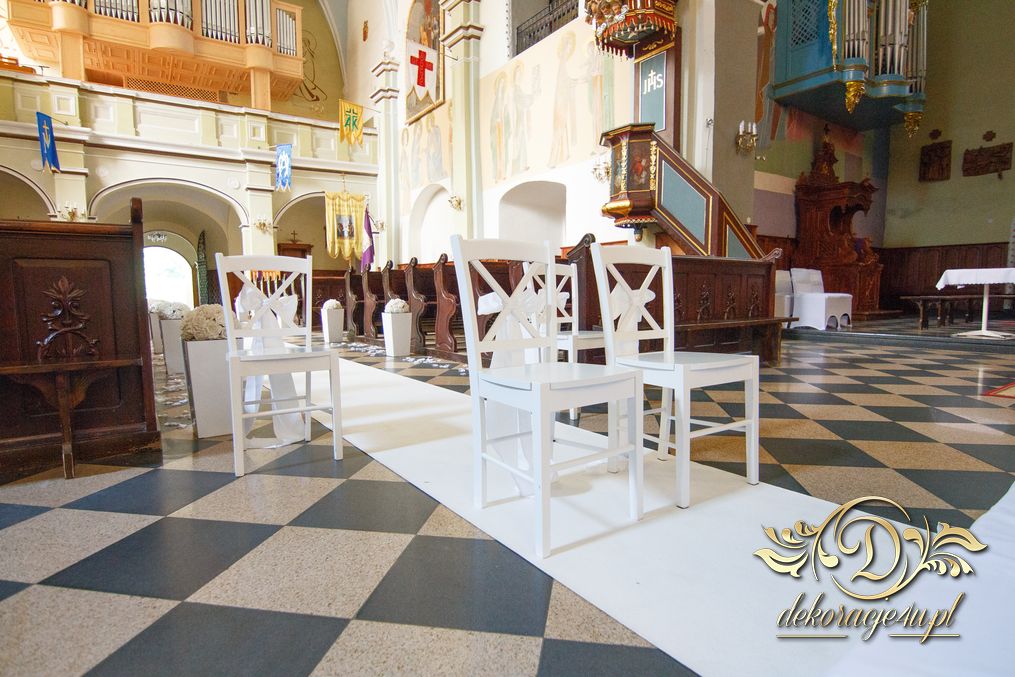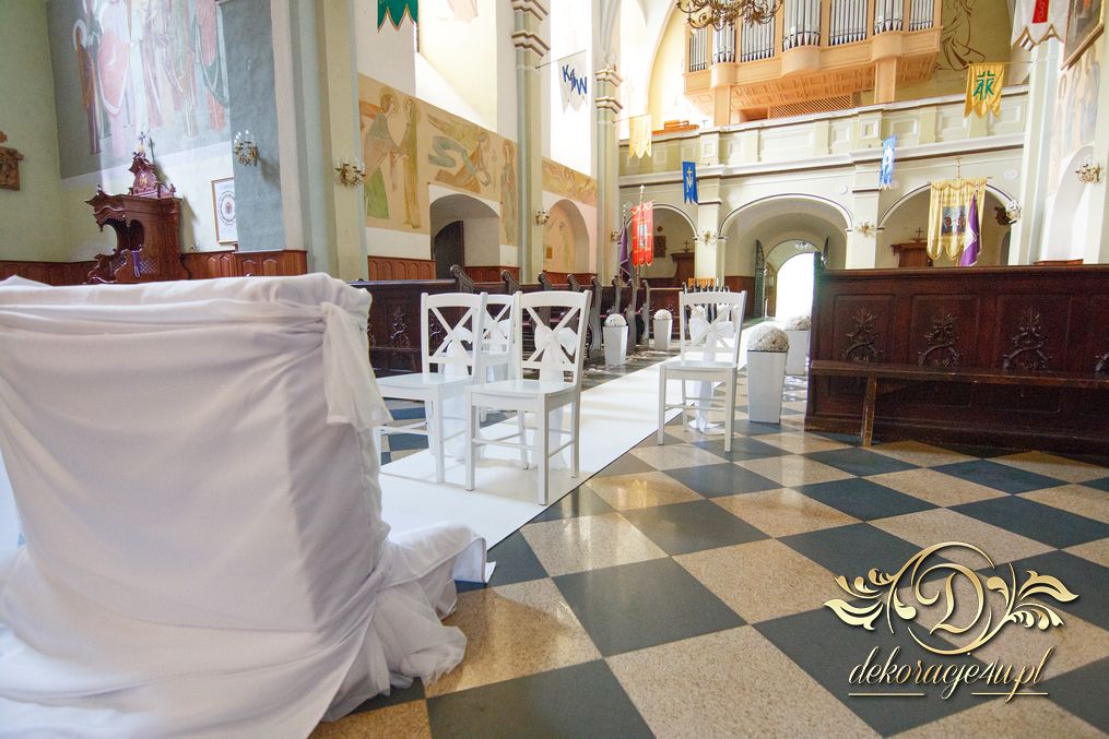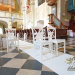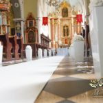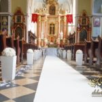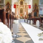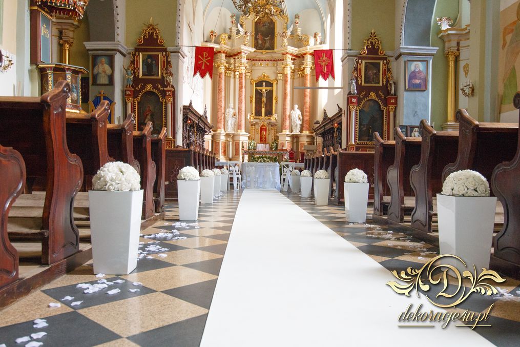 Dekoracja kościoła wykonana w bieli. Biały dywan z płatkami róż, a miedzy ławeczkami białe donice z kulami kwiatowymi. Dodatkowo białe krzesła, które idealnie pasuja na każdy ślub. Na ołtarzach kwiaty.