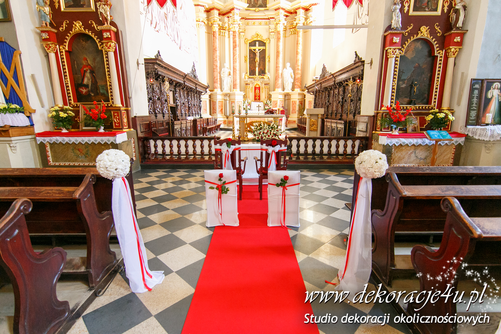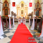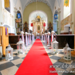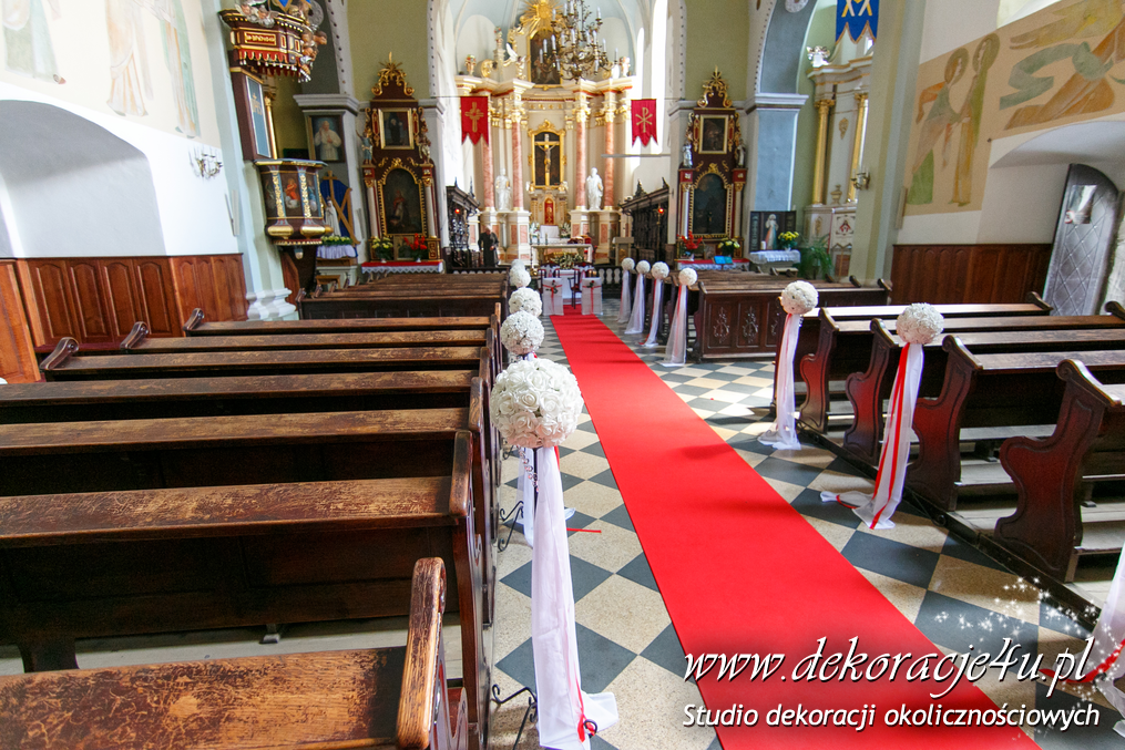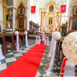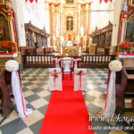 Dekoracja kościoła wykonana w stojaki wraz z kulami kwiatowymi z dopełnieniem czerwonego dywanu przez całą długość kościoła.