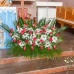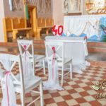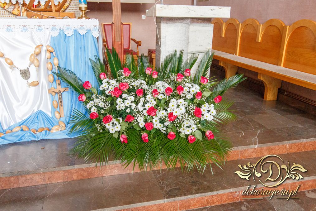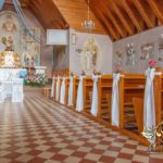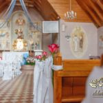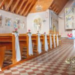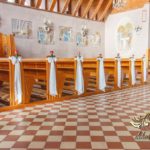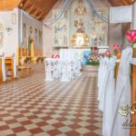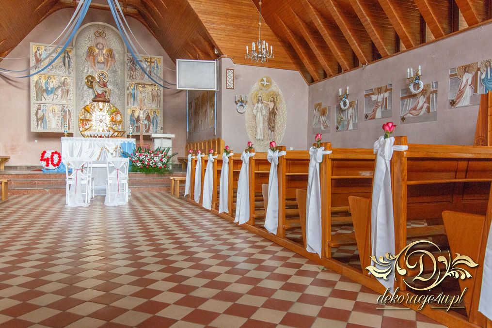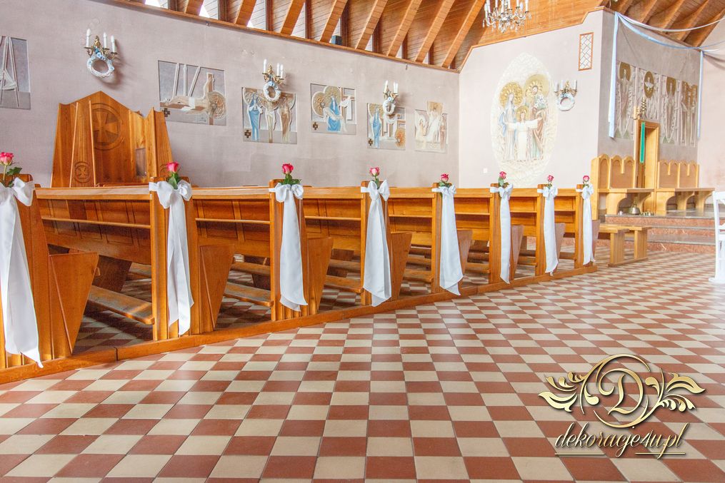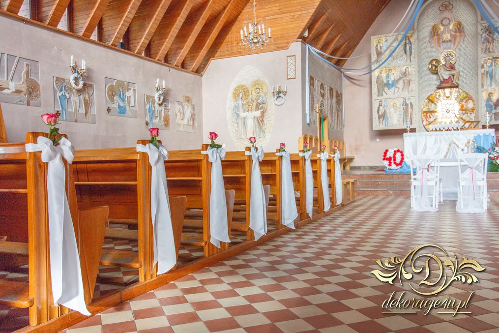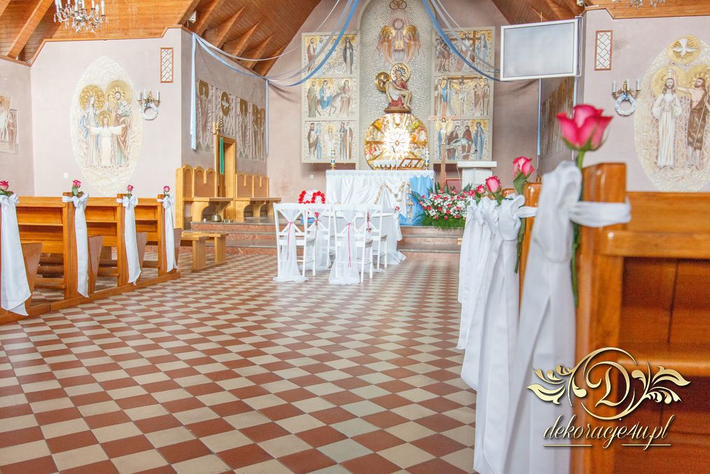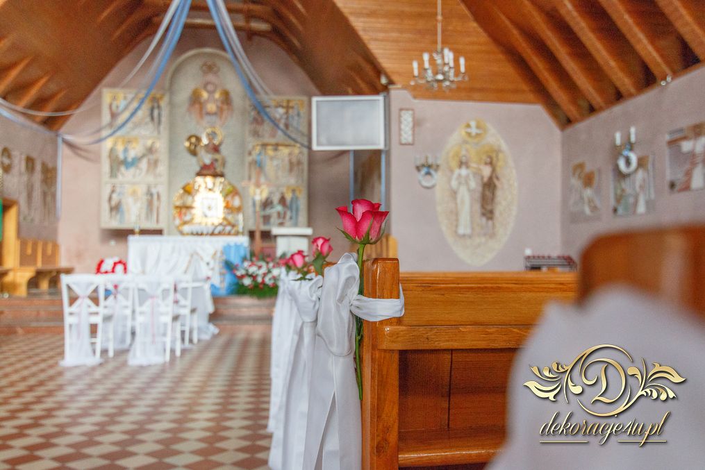 Czysto biało dekoracja z akcentem różyczki na ławeczkach i na krzesłach funkcyjnych. Dodatkowo Dekoracje4u.PL wykonała bukiet główny pod ołtarz.