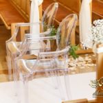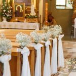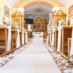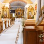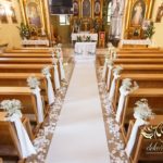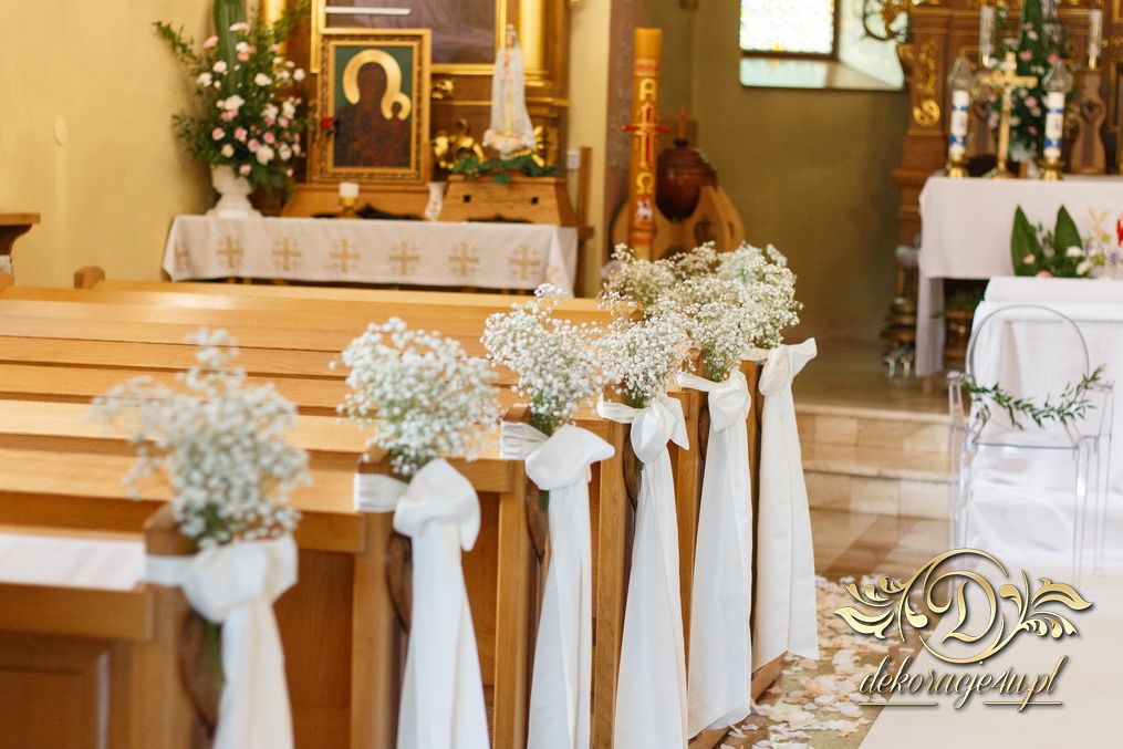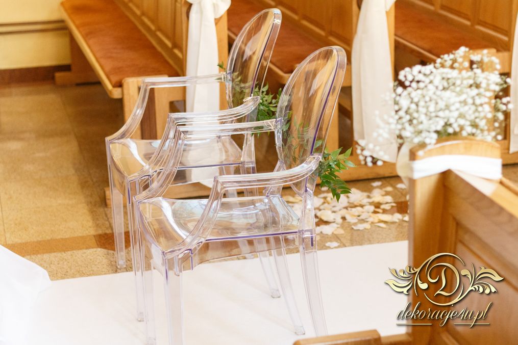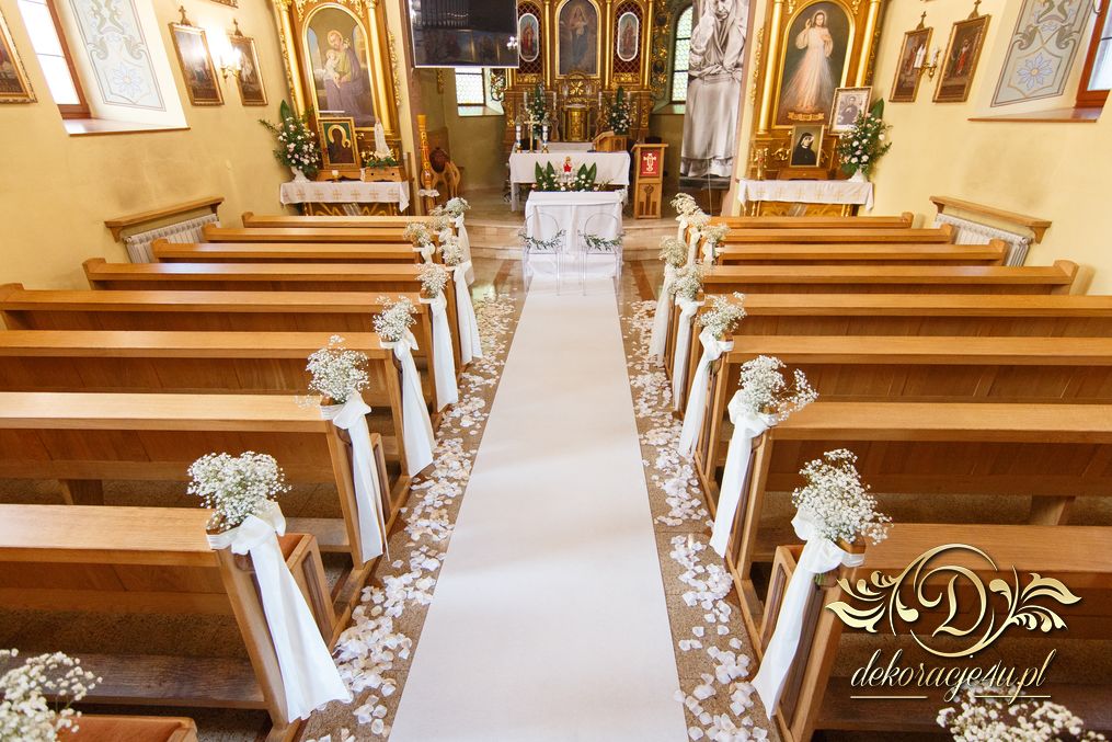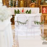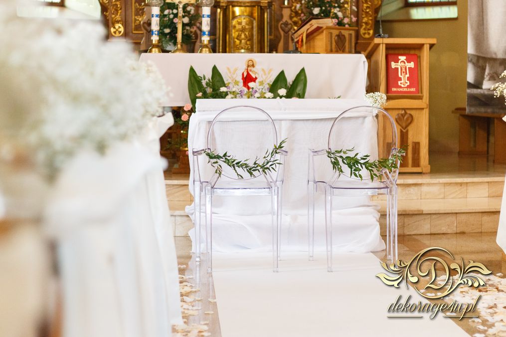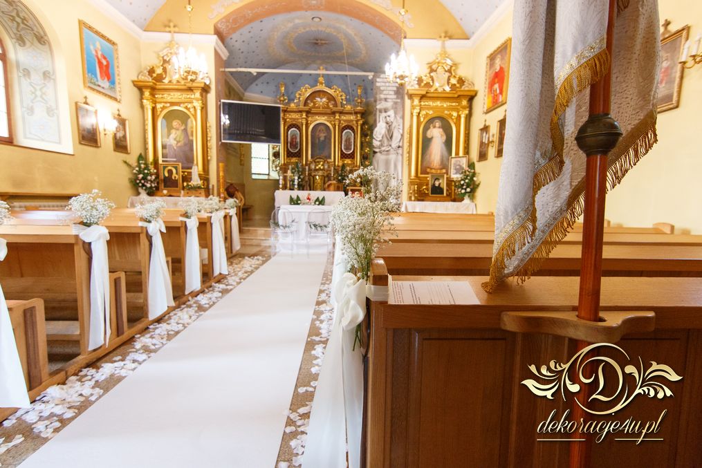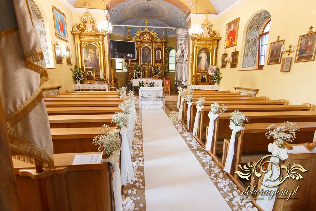 Dekoracja kościoła wykonana w bieli. Biały dywan, płatki róż, na ławeczkach bukieciki z gipsówki z białą szarfa. Dla Państwa Młodych specjalne krzesła transparentne.