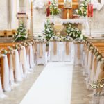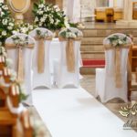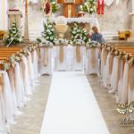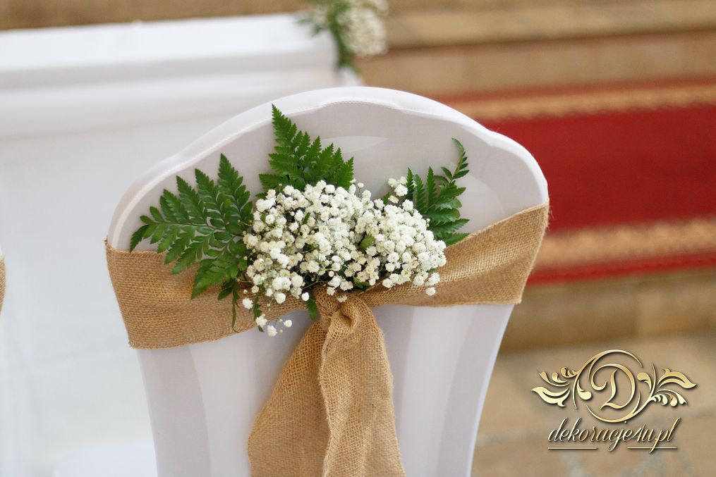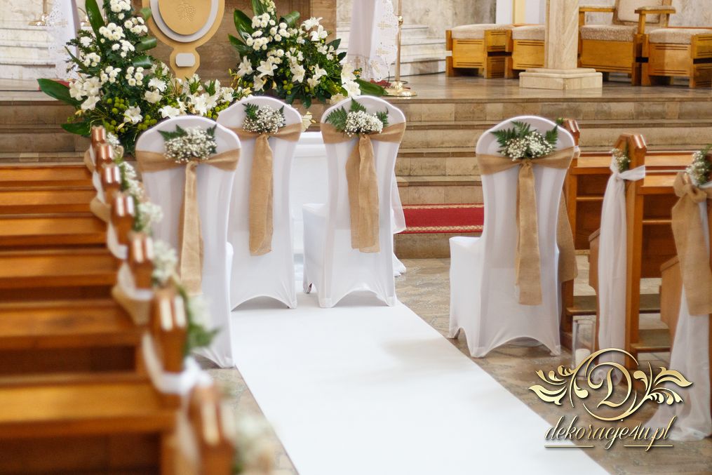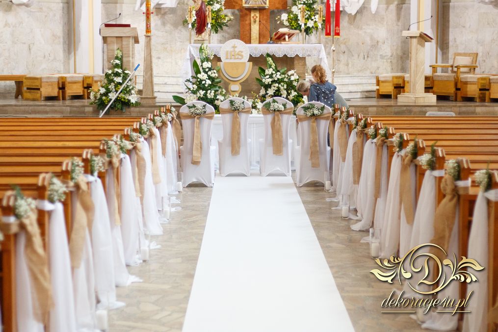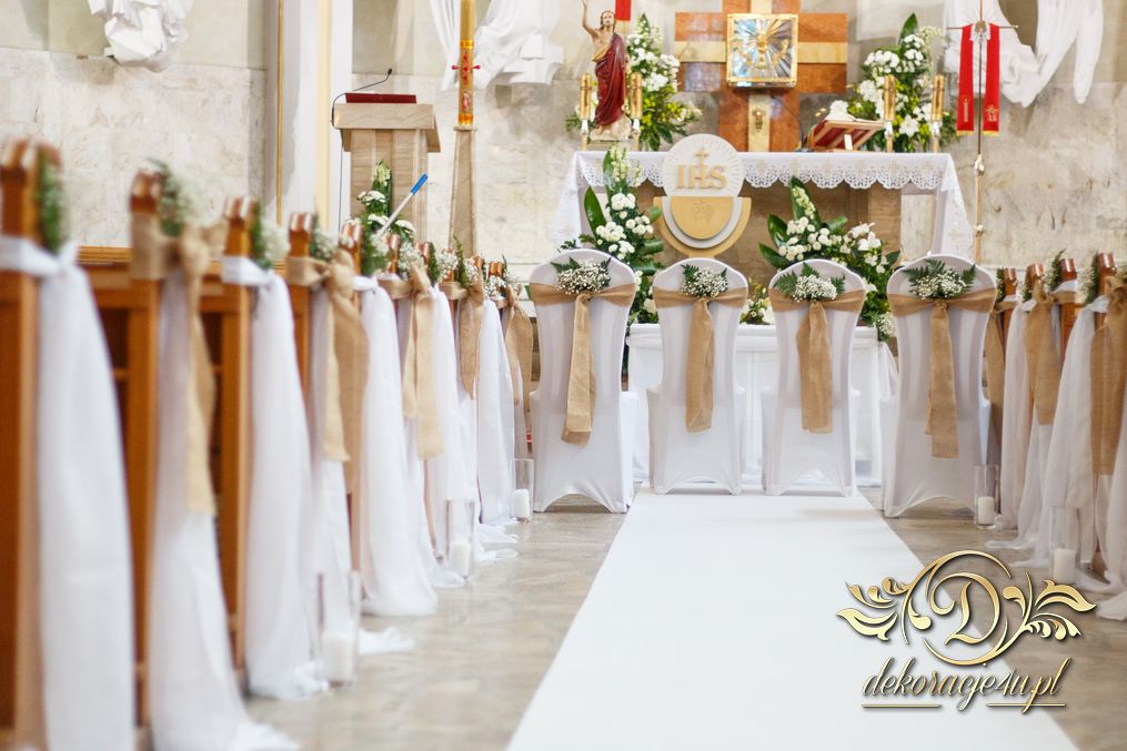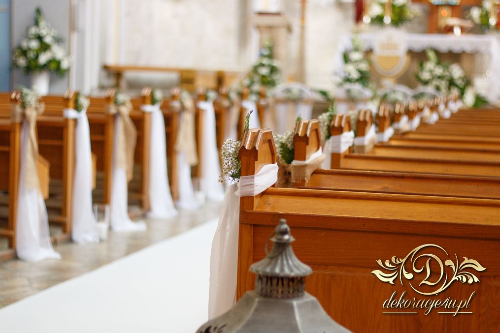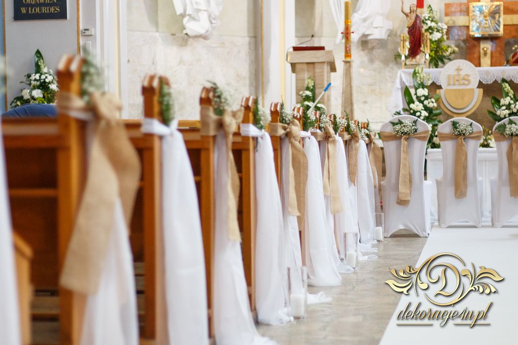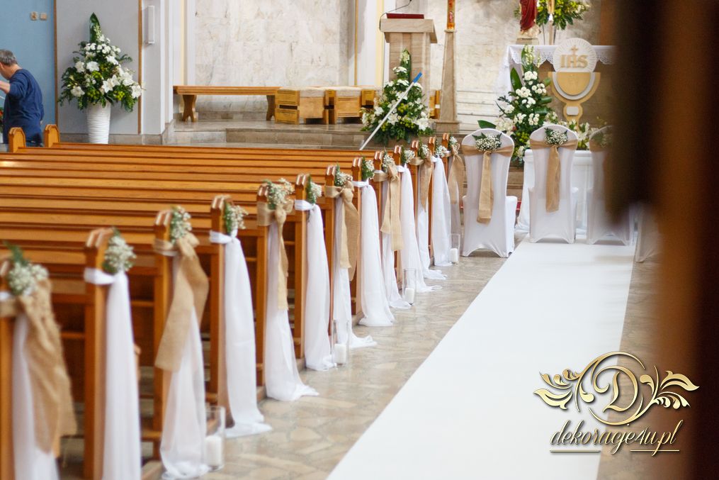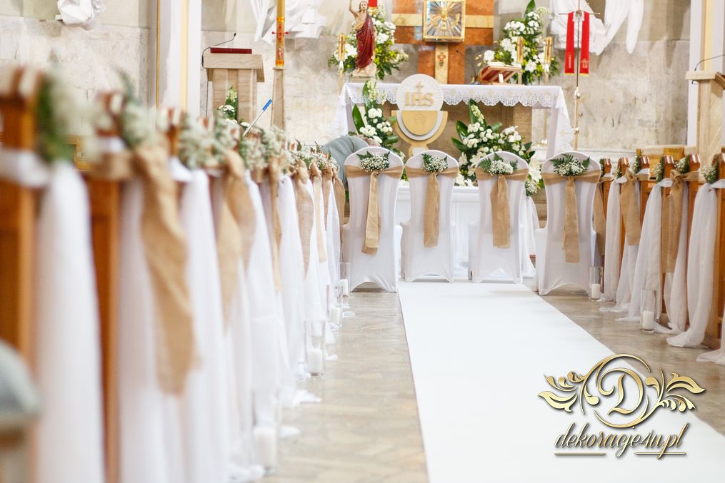 Dekoracja kościoła utrzymana w kolorystyce bieli. Wykorzystana została juta i szarfy woalowe na ławeczkach. Ozdobiono ławki bukiecikami a przez środek kościoła biały dywan, który utwierdził piękno wykonanej dekoracji.