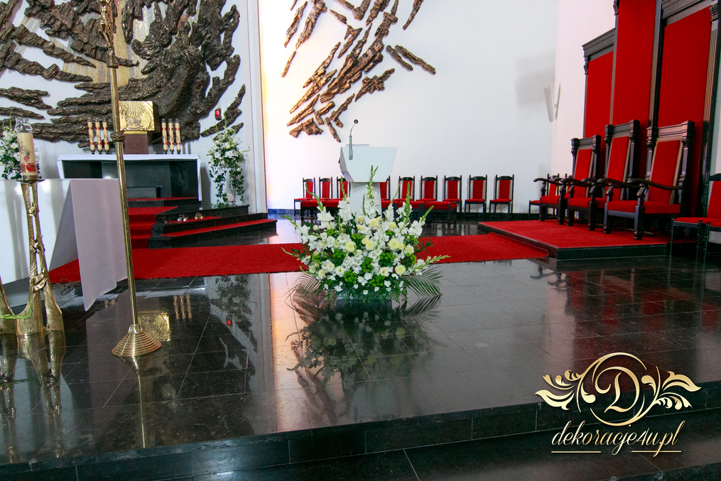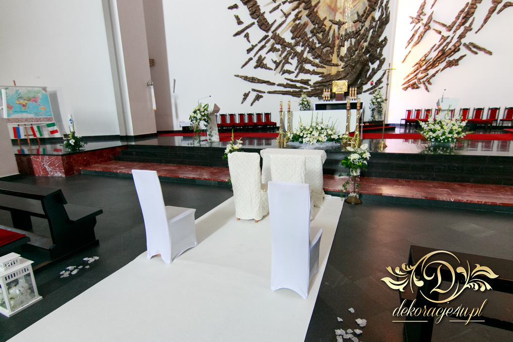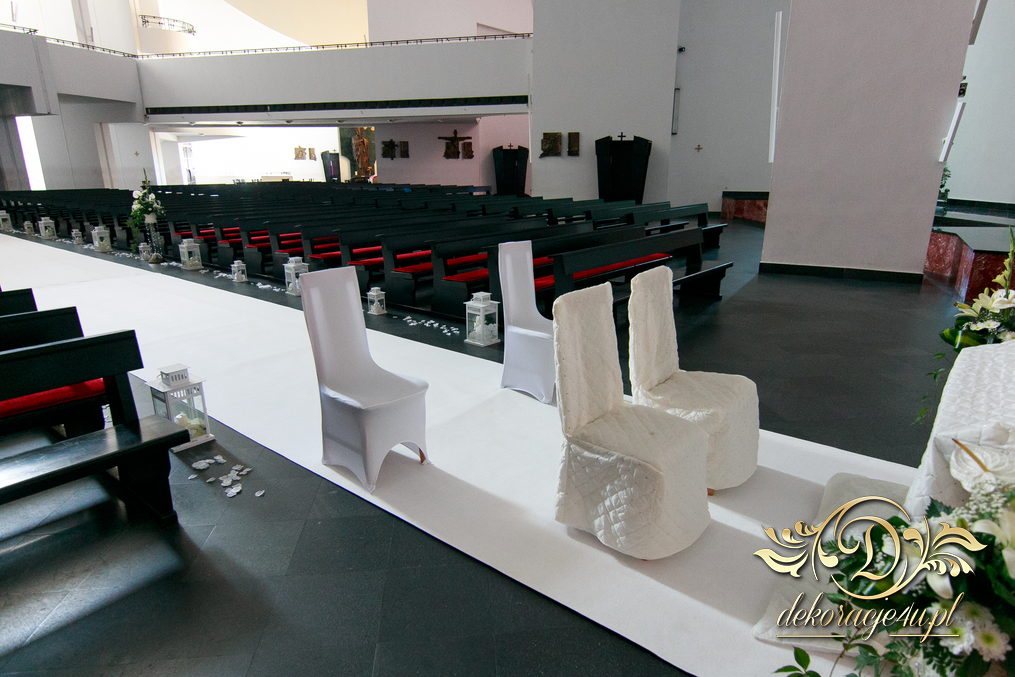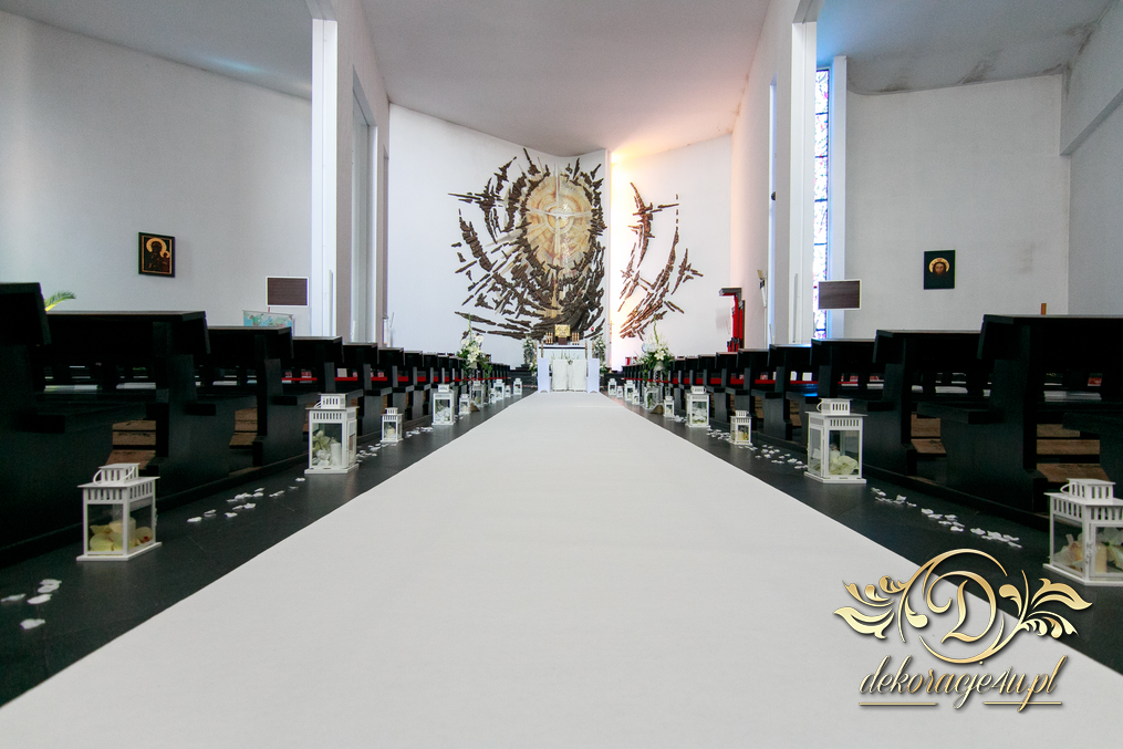 Piękny wystrój kościoła z dodatkami firmy Dekoracje4u.pl wyszedł wspaniale. Szeroki dwu metrowy biały dywan, lampiony po bokach i bukiety.