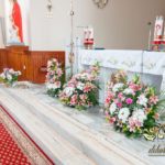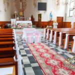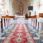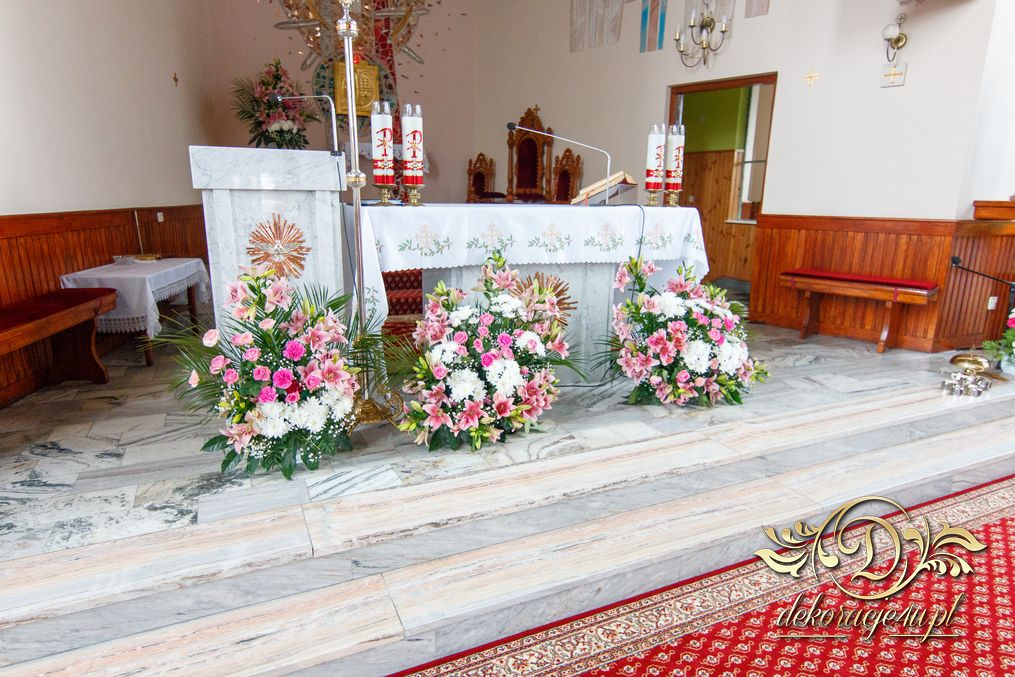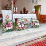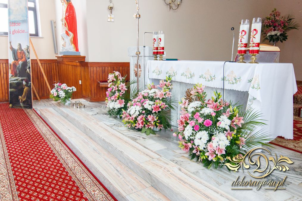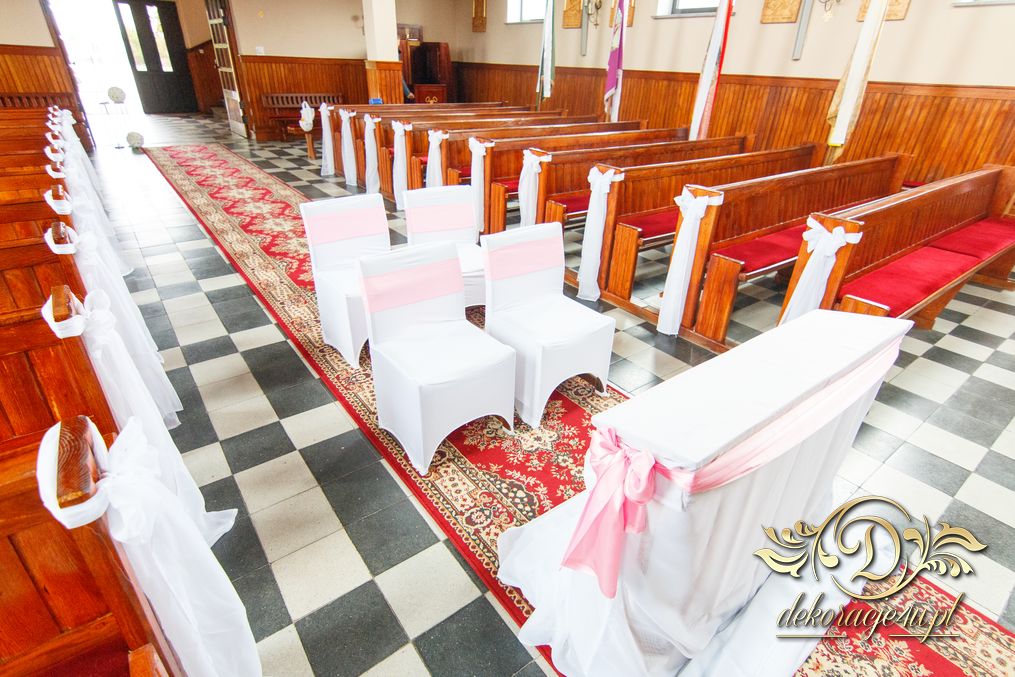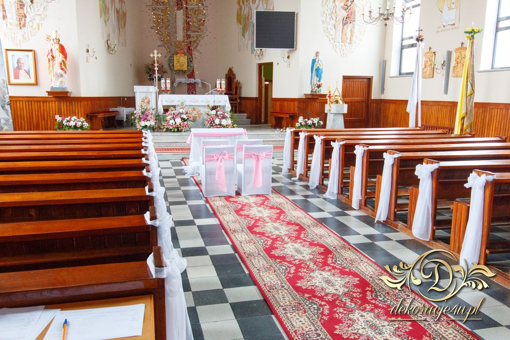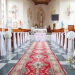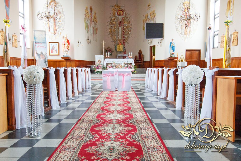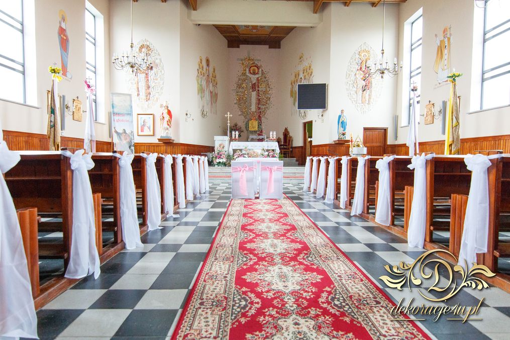 Dekoracja kościoła na biało. Na zakończenie alejki dwa wazony z kulami kwiatowymi. Ołtarze ozdobione bukietami wykonanymi przez Dekoracje4u.pl