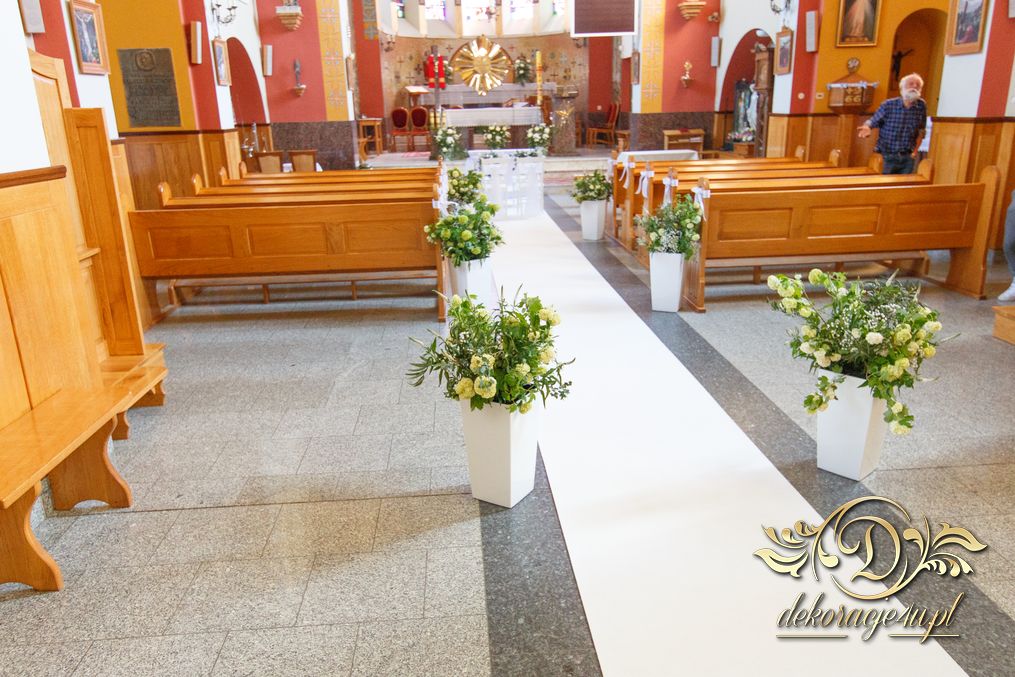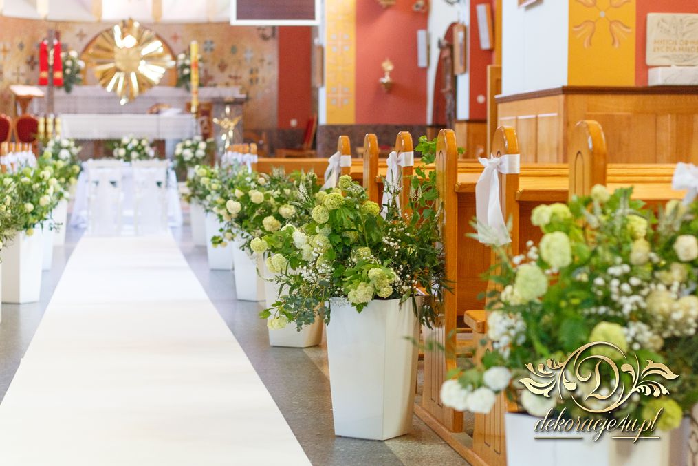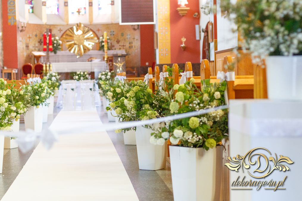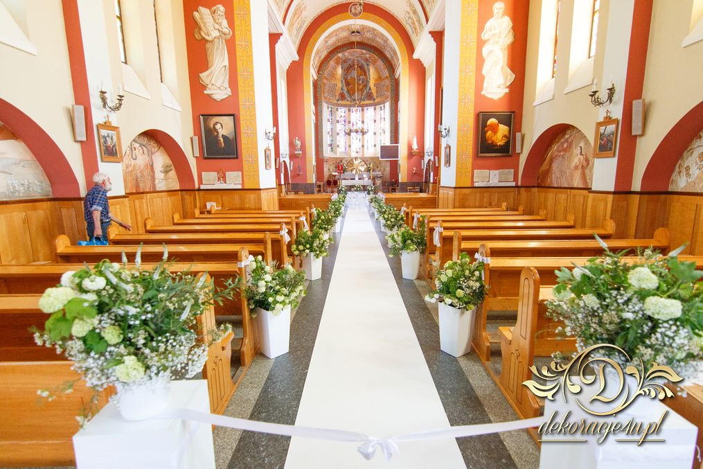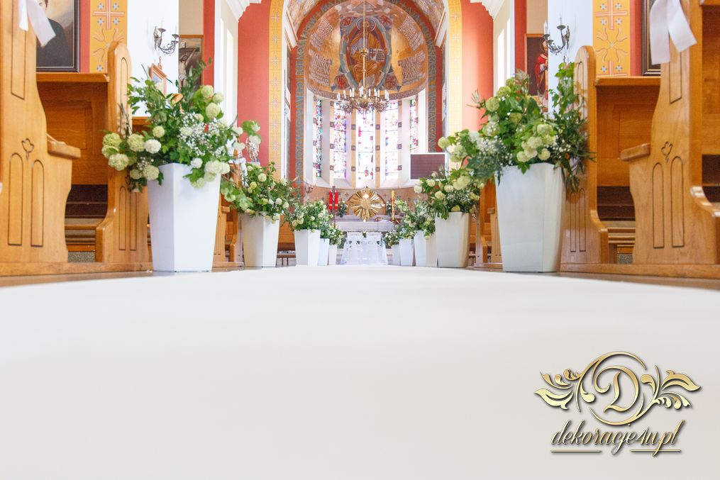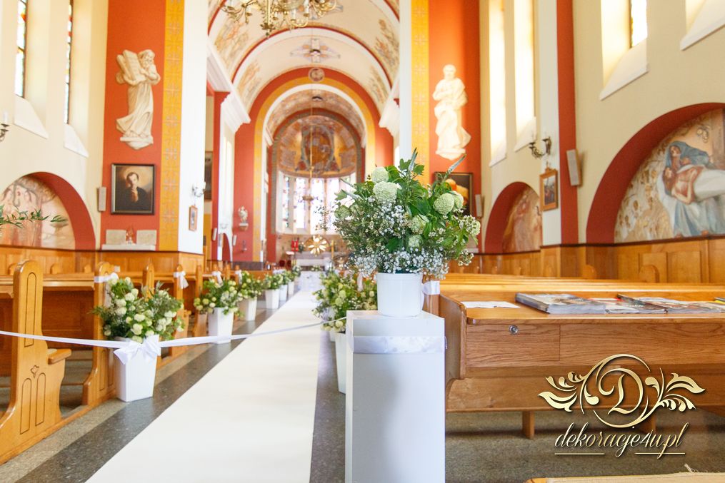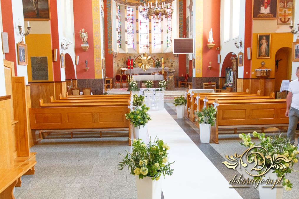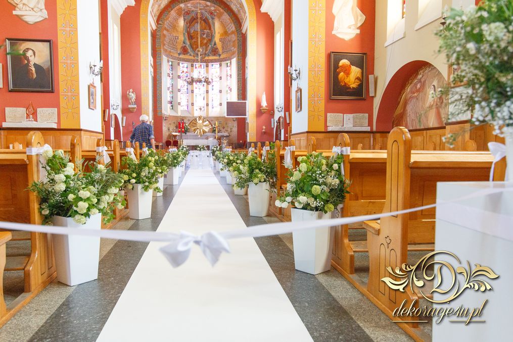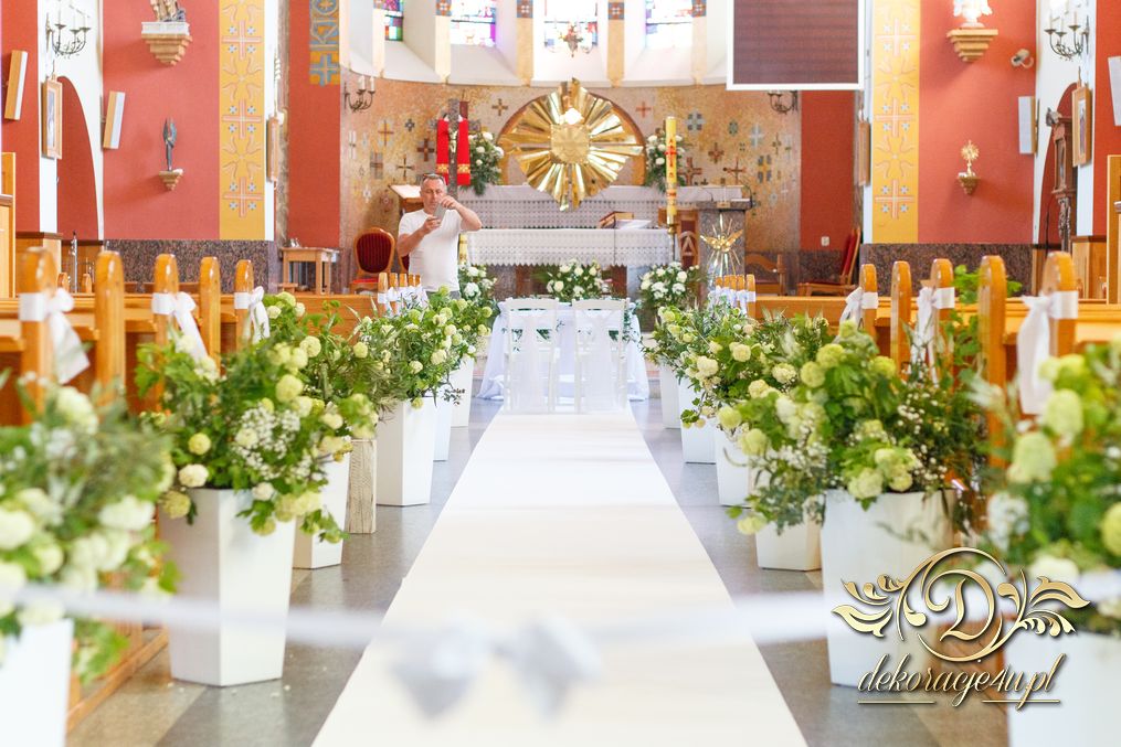Takie dekoracje aż warto wykonywać. Cały kościół w żywych kwiatach w białych donicach. Biały dywan na wejście dla Pary Młodej, a u celu białe krzesła z wiankami dla Nowożeńców. Całość imponująca.