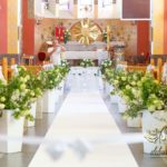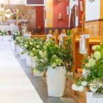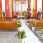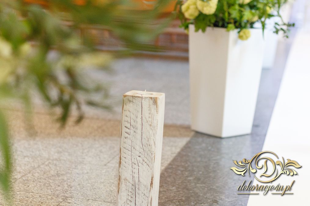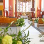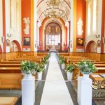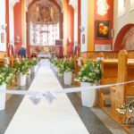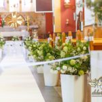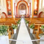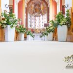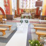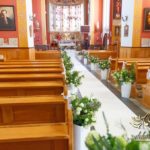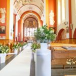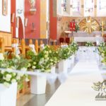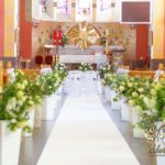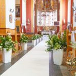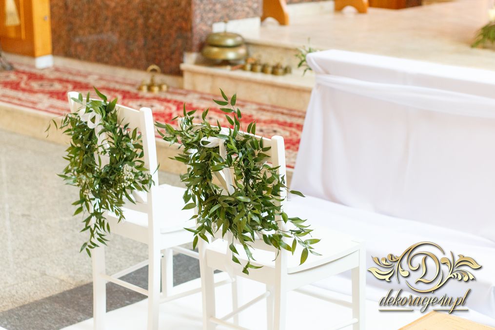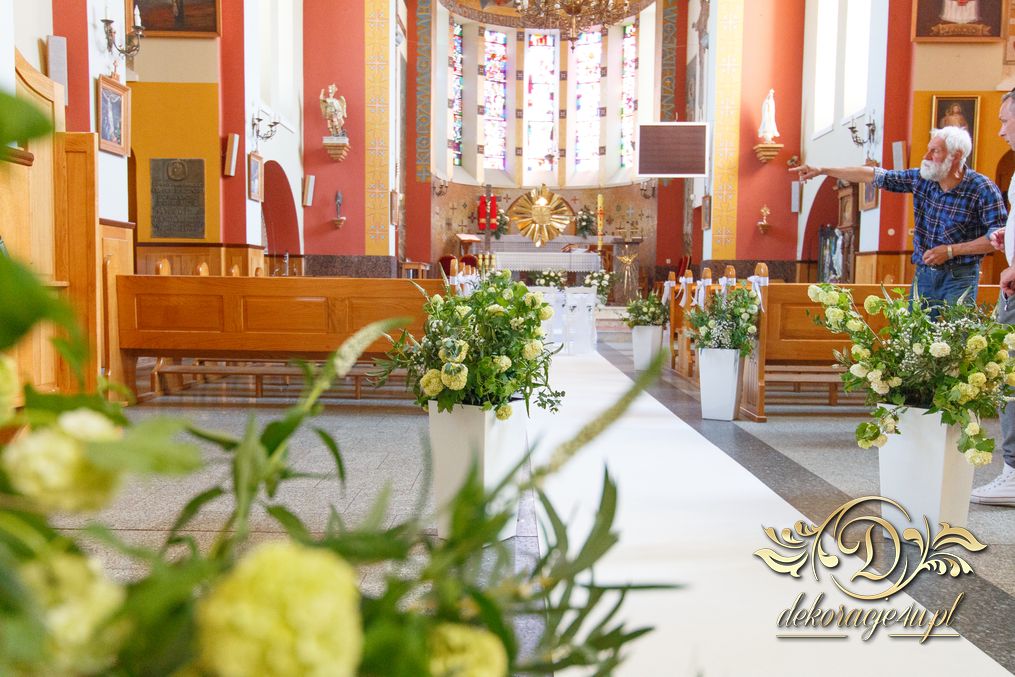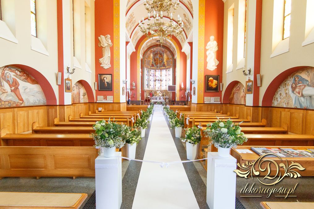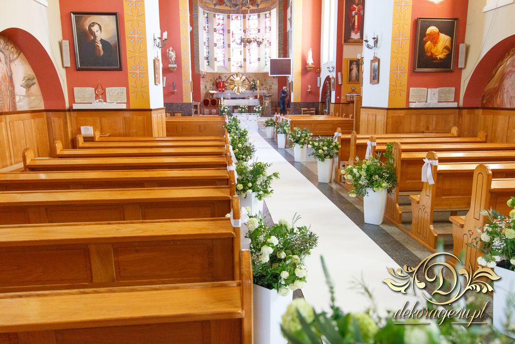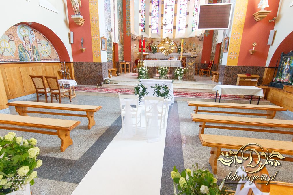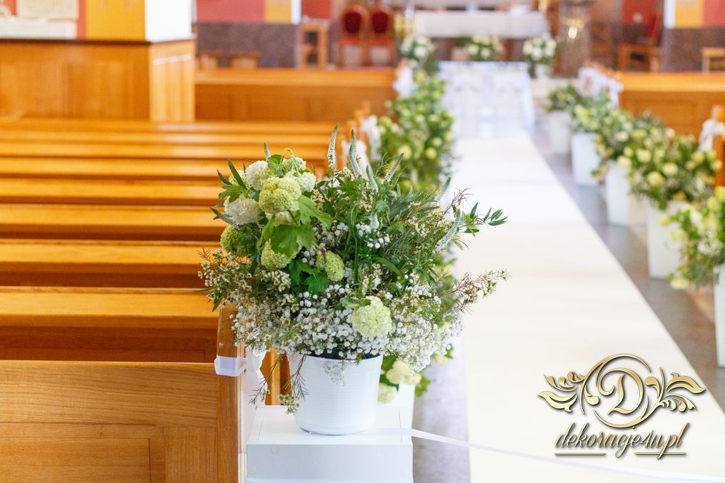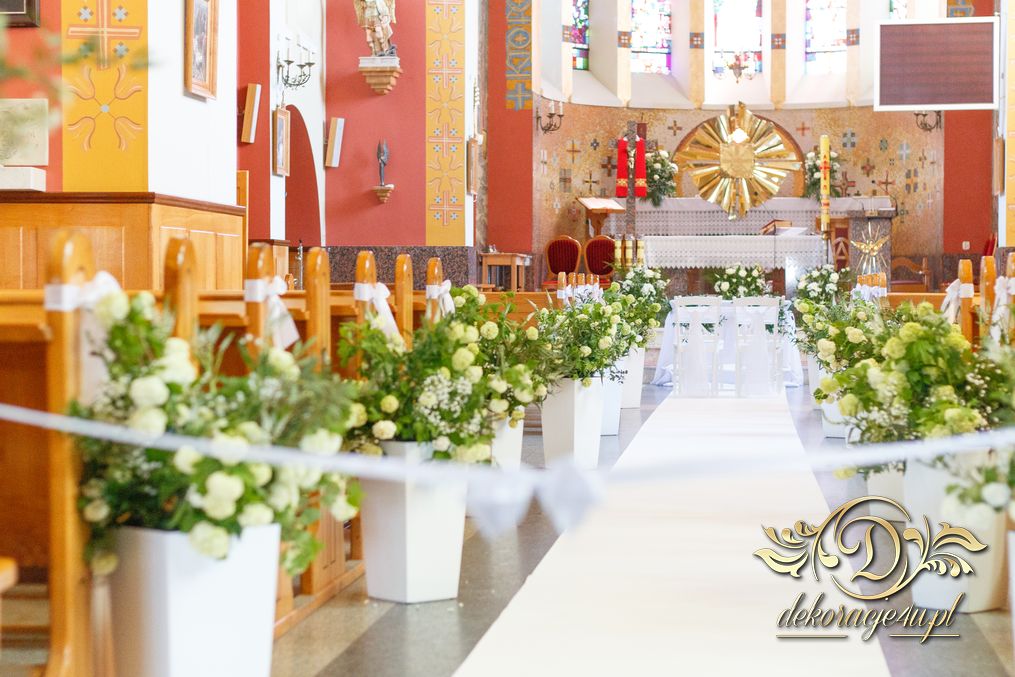 Takie dekoracje aż warto wykonywać. Cały kościół w żywych kwiatach w białych donicach. Biały dywan na wejście dla Pary Młodej, a u celu białe krzesła z wiankami dla Nowożeńców. Całość imponująca.