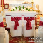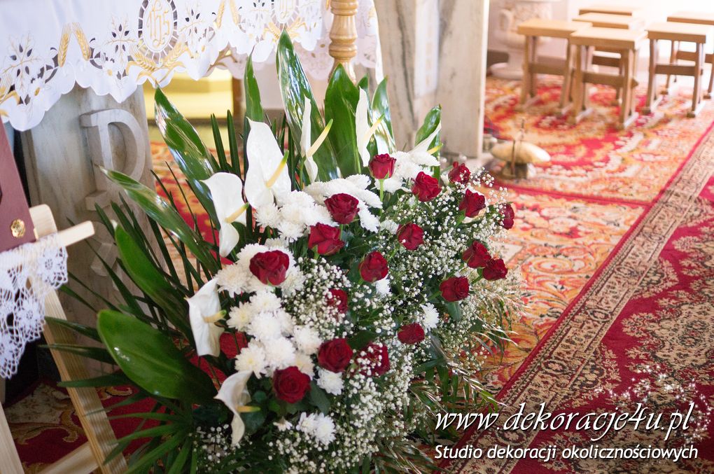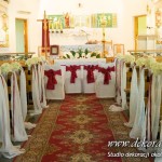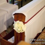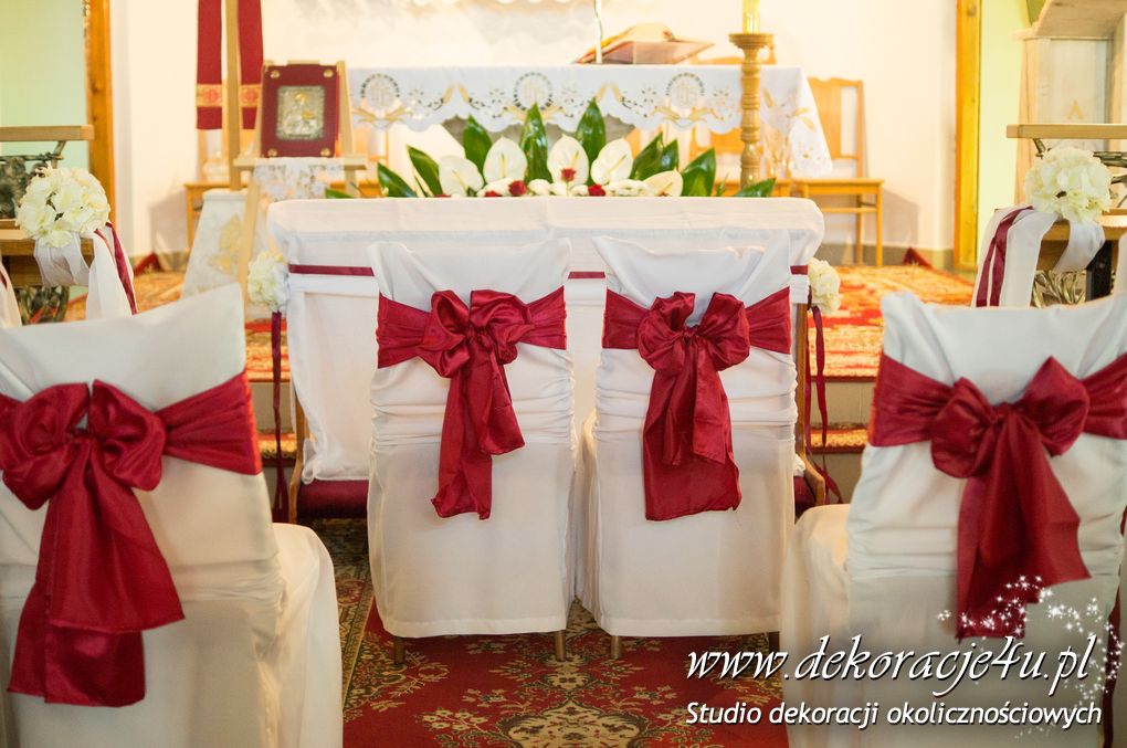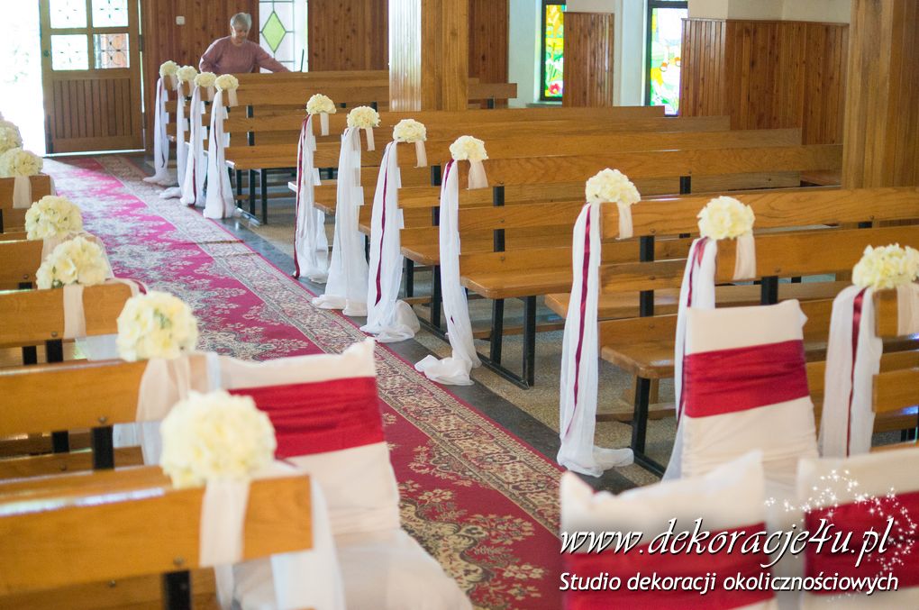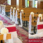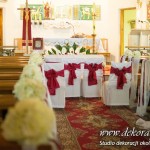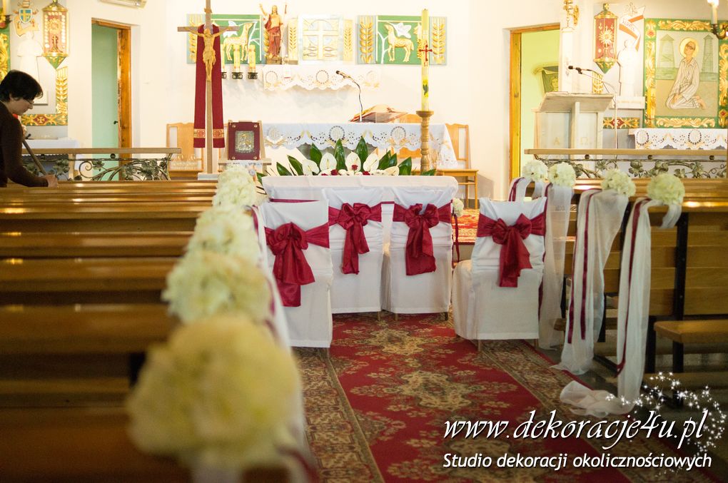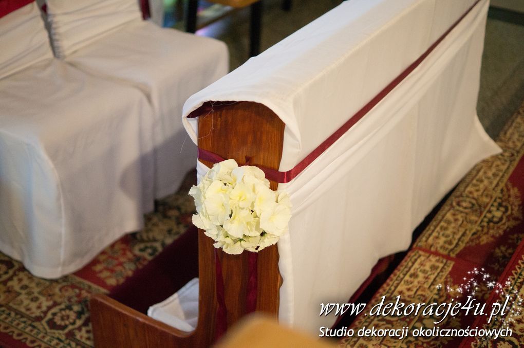 Na ławeczkach szarfy ze sztuczną hortensją i z delikatnym dodatkiem bordo - wstążka. Pod ołtarzem głównym bukiet z anturium.