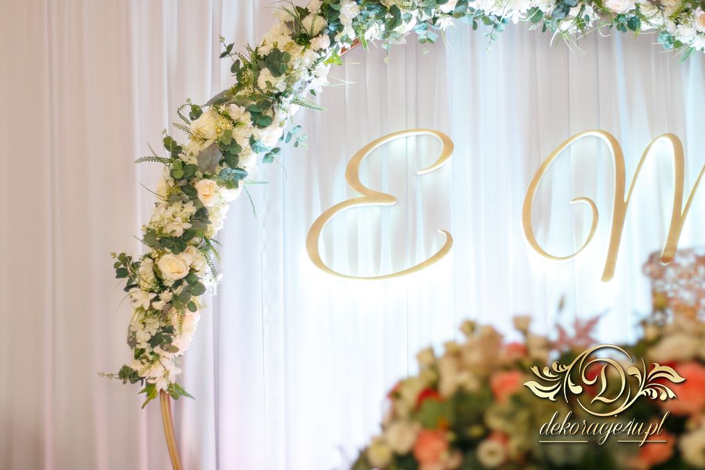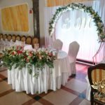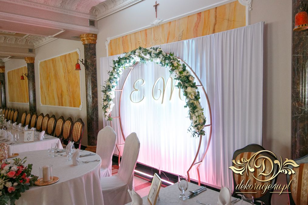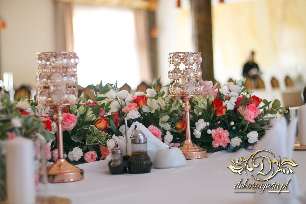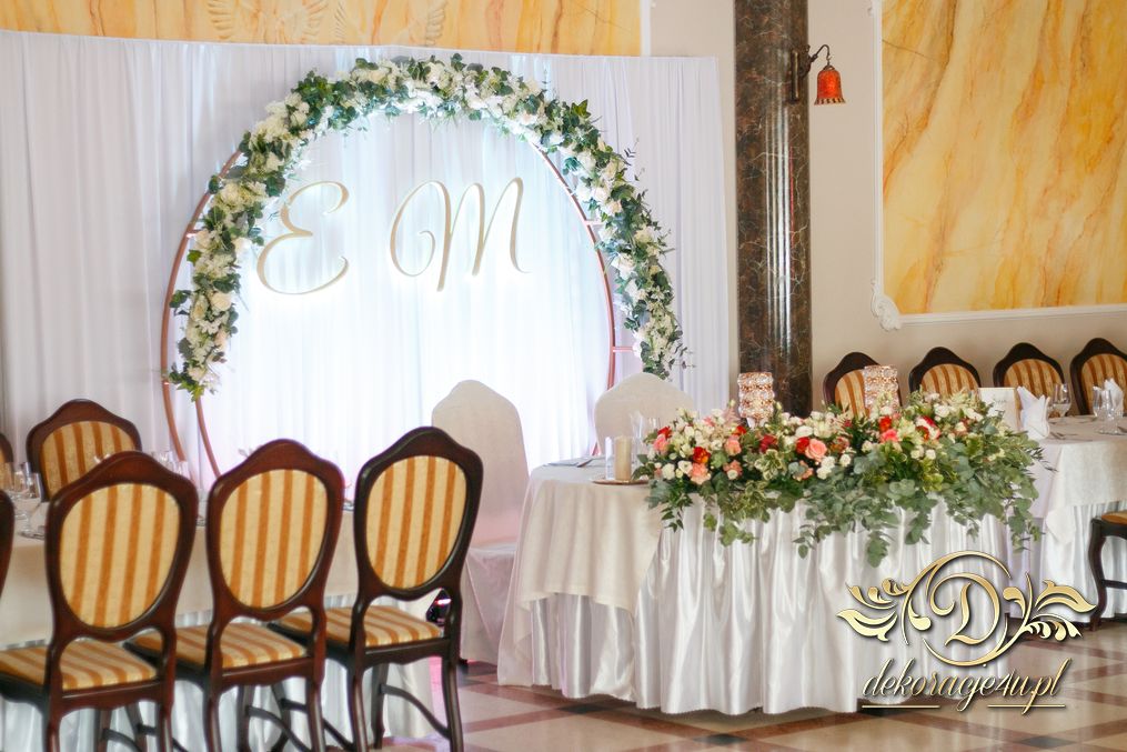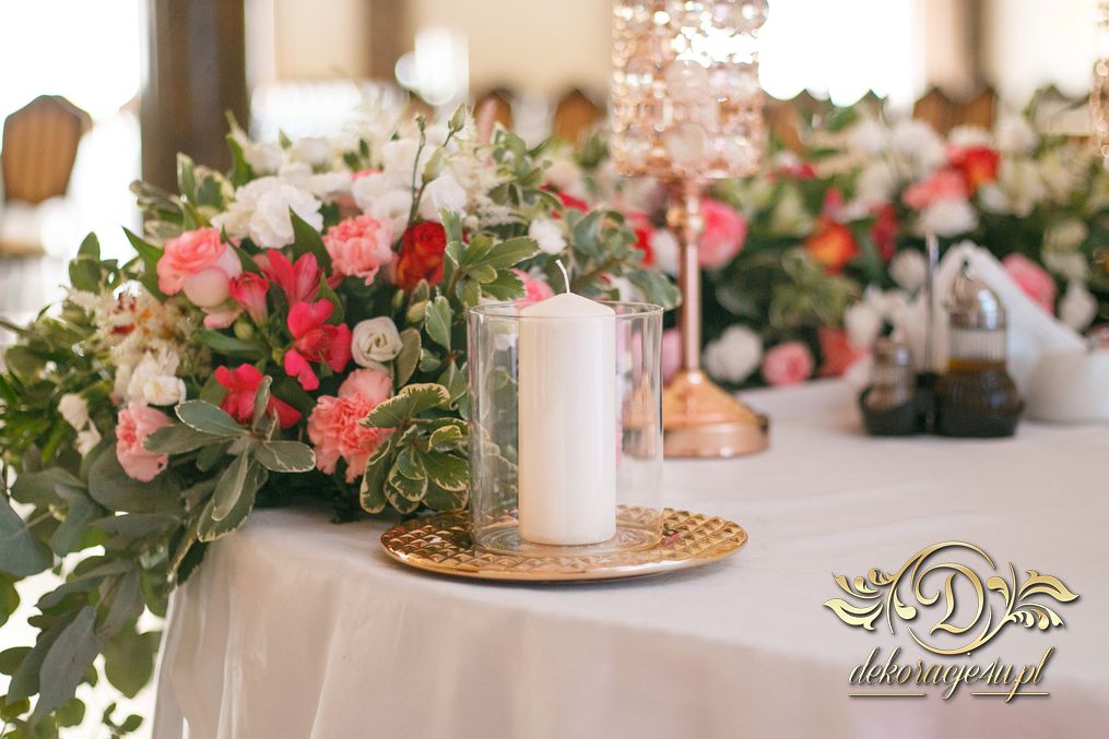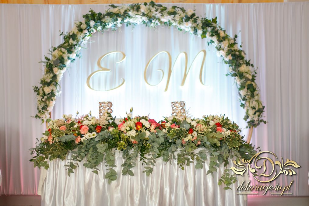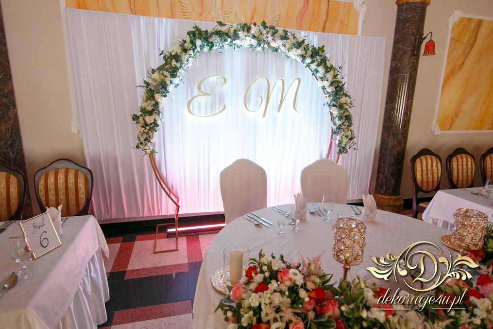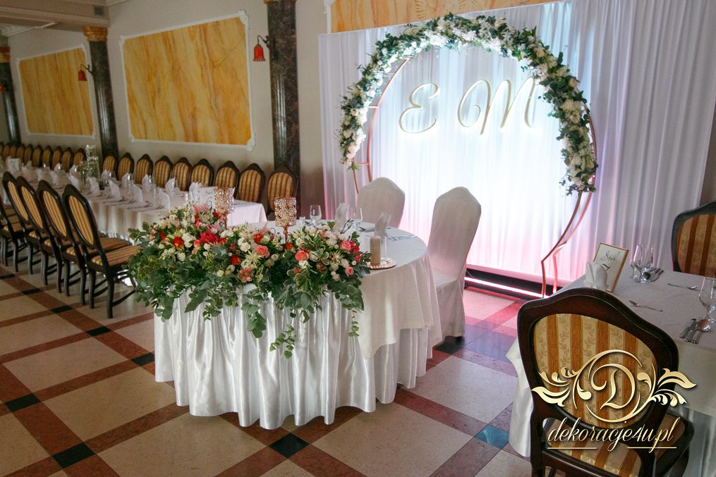 Piękna dekoracja sali weselnej w Dynowie. Ścianka łuk, który aktualnie używamy na większości wesel jest tak cudowny że Młodzi zakochali się w dekoracji jak tylko pierwszy raz ujrzeli. Piękne bukiety na stołach i tuby ze świecami.