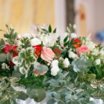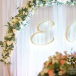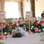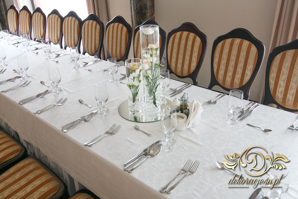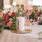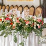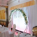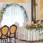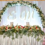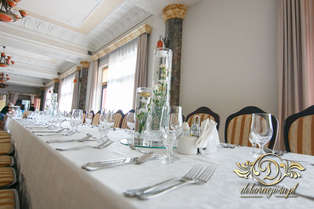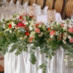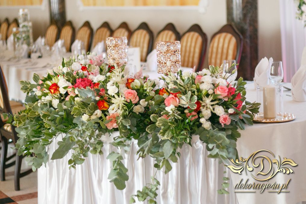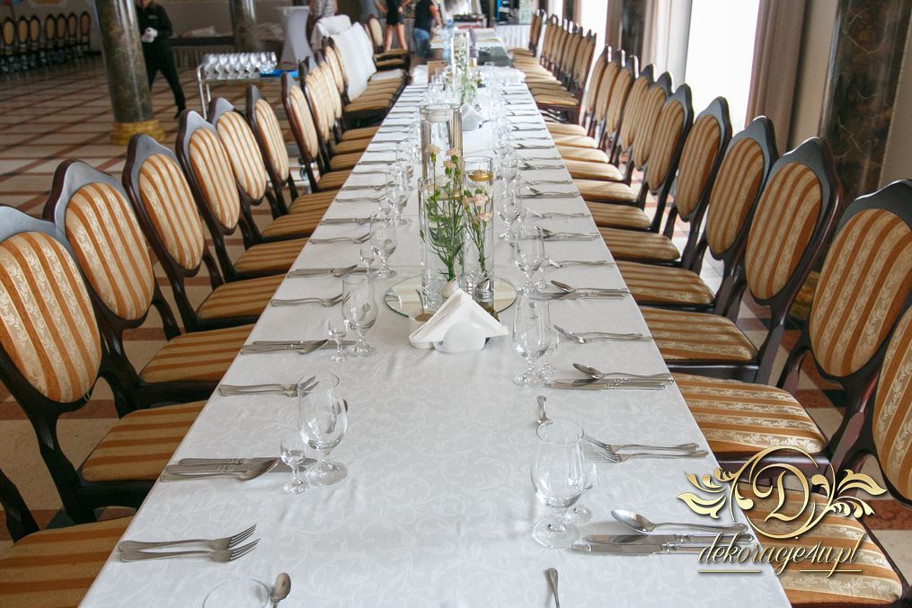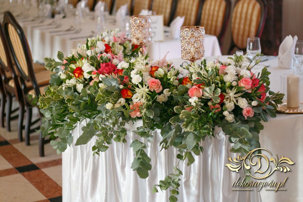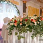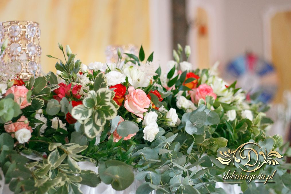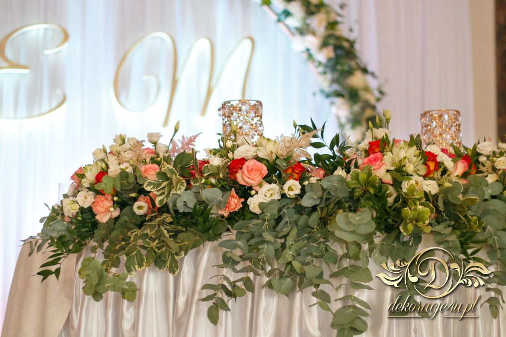 Piękna dekoracja sali weselnej w Dynowie. Ścianka łuk, który aktualnie używamy na większości wesel jest tak cudowny że Młodzi zakochali się w dekoracji jak tylko pierwszy raz ujrzeli. Piękne bukiety na stołach i tuby ze świecami.