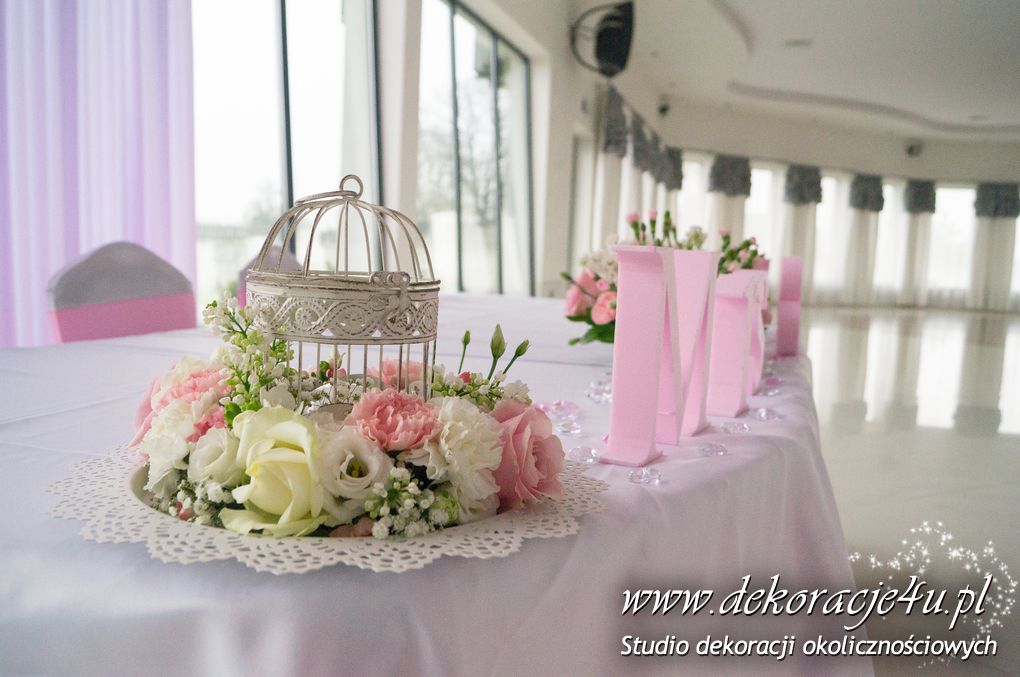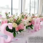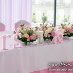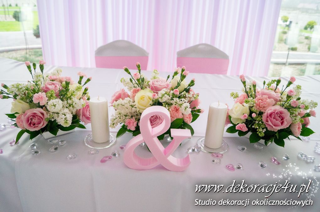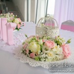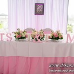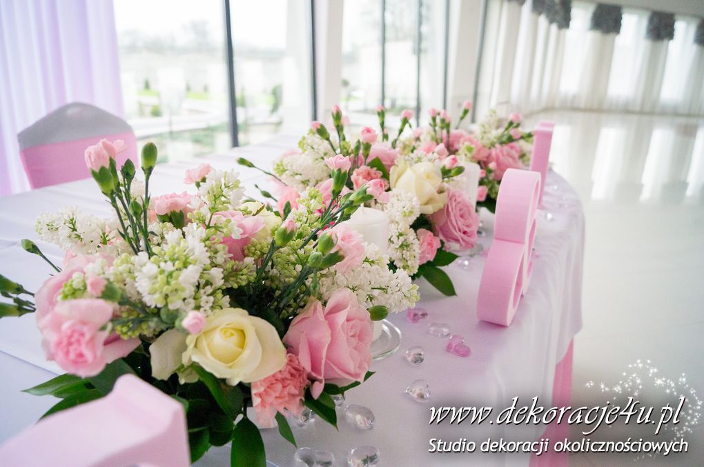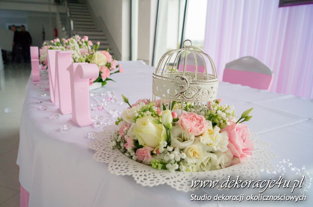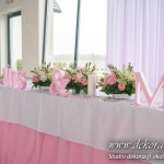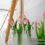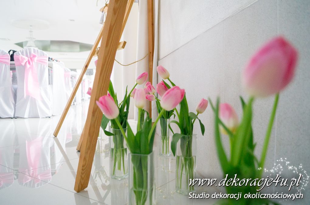 Dekoracja sali już po raz kolejny w BoCarlo. Tym razem różowy kolor przewodni, całość uzupełniona tulipanami i pięknymi wiankami na stole głównym.