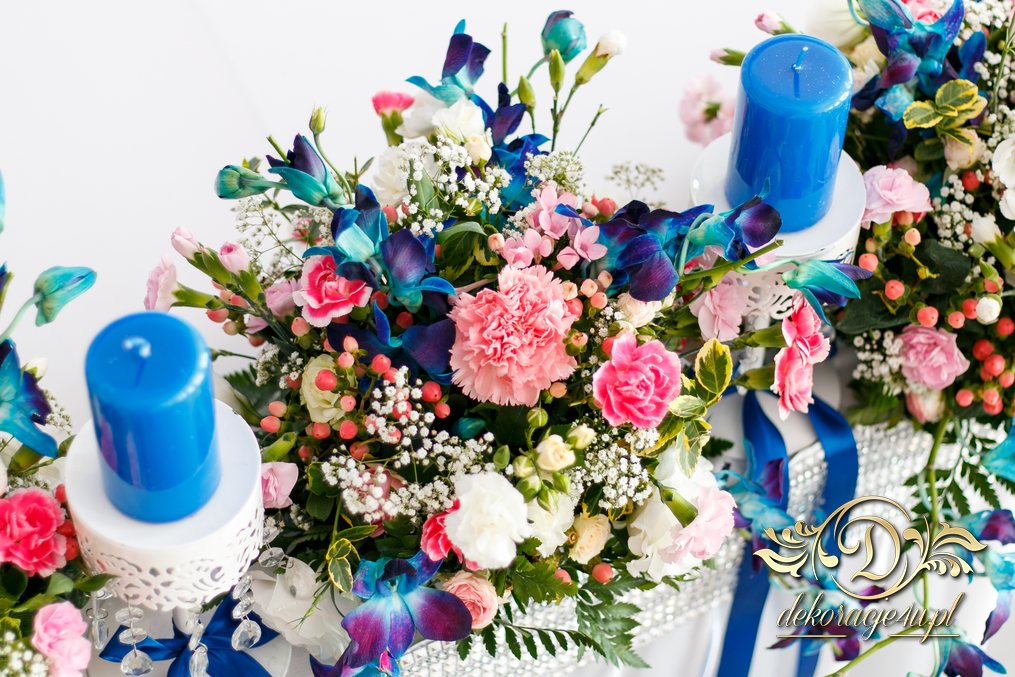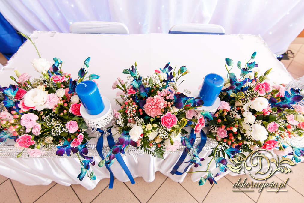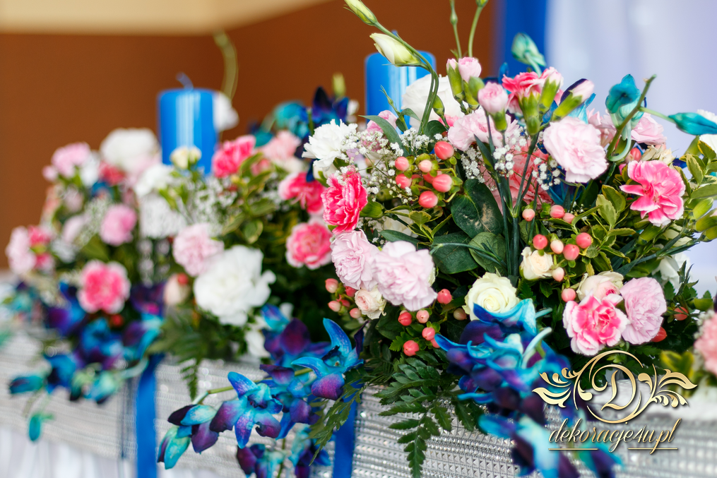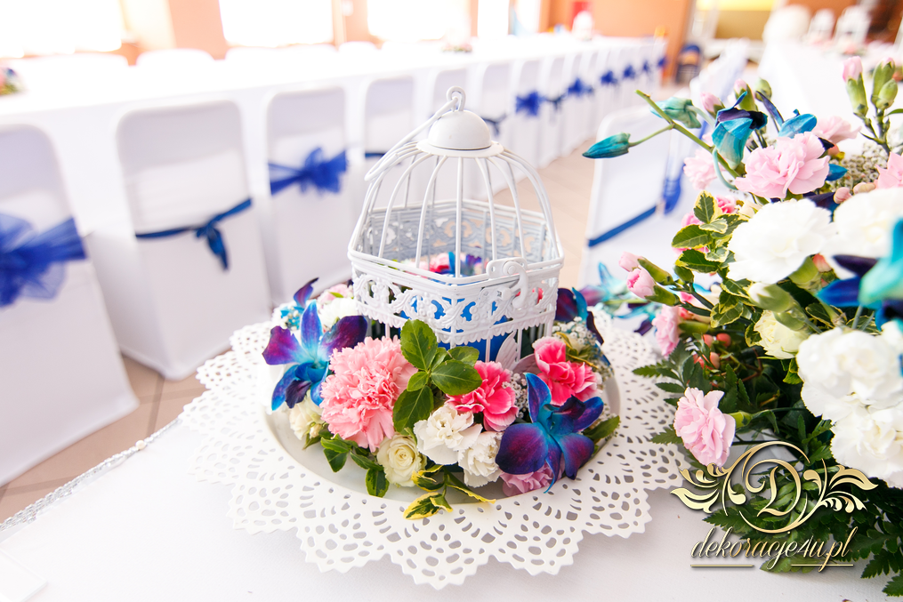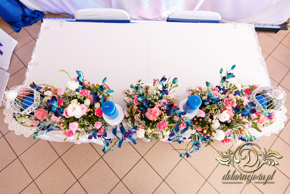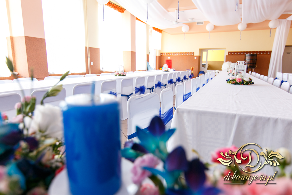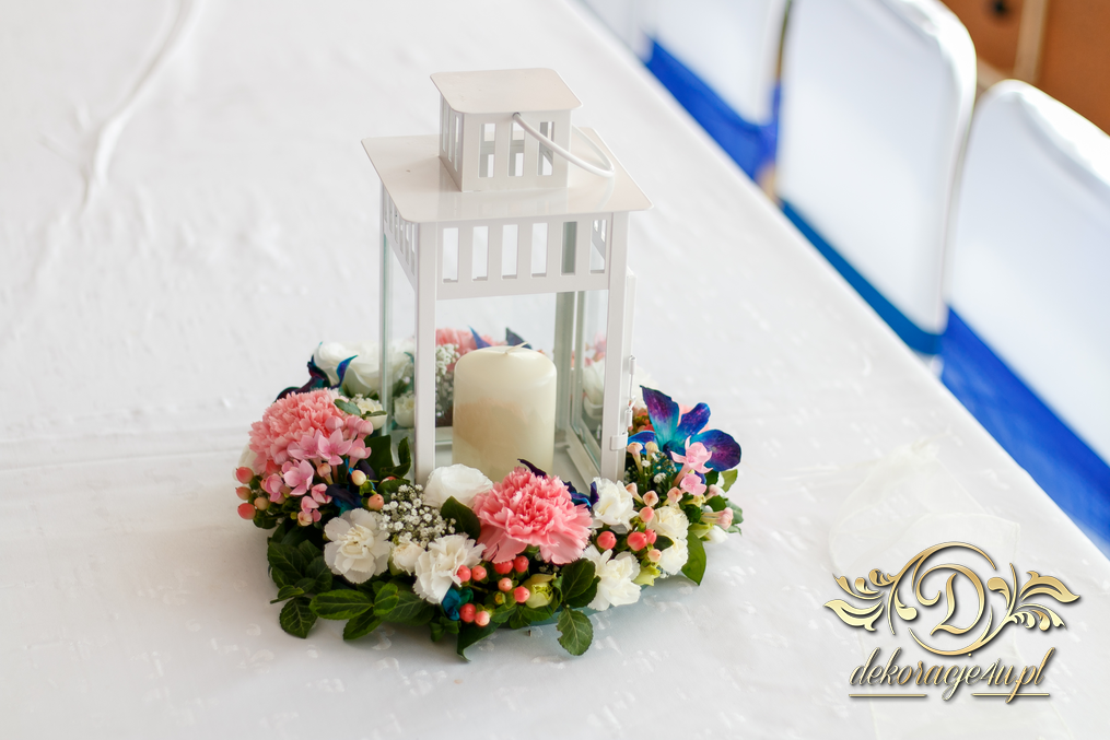 Lampiony otoczone żywymi kwiatami, wszystko w kolorze niebieskim - storczyki o których marzy każda Pani Młoda. Subtelnie i bardzo pięknie wyszła dekoracja sali.