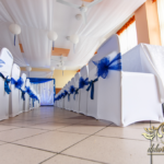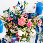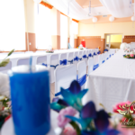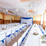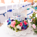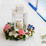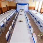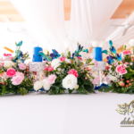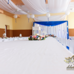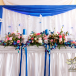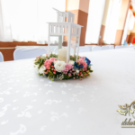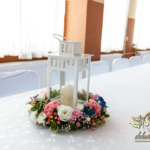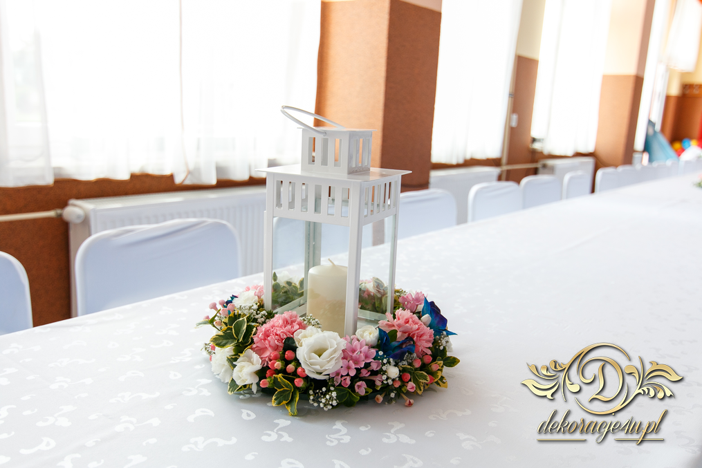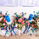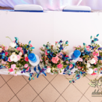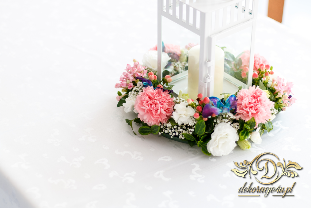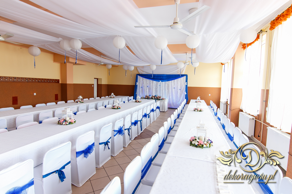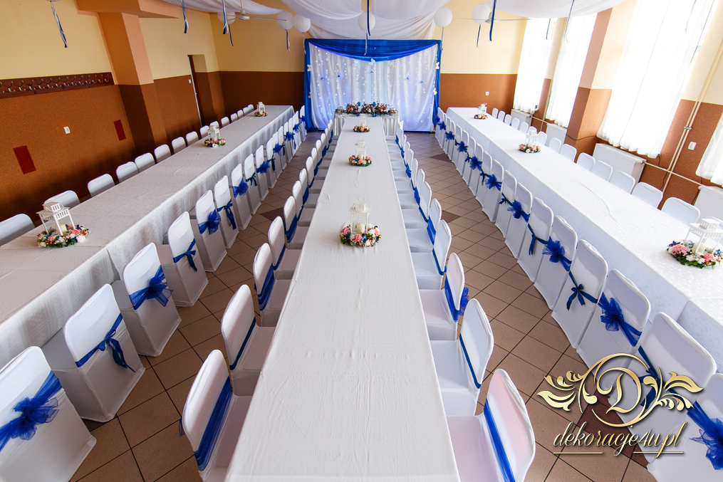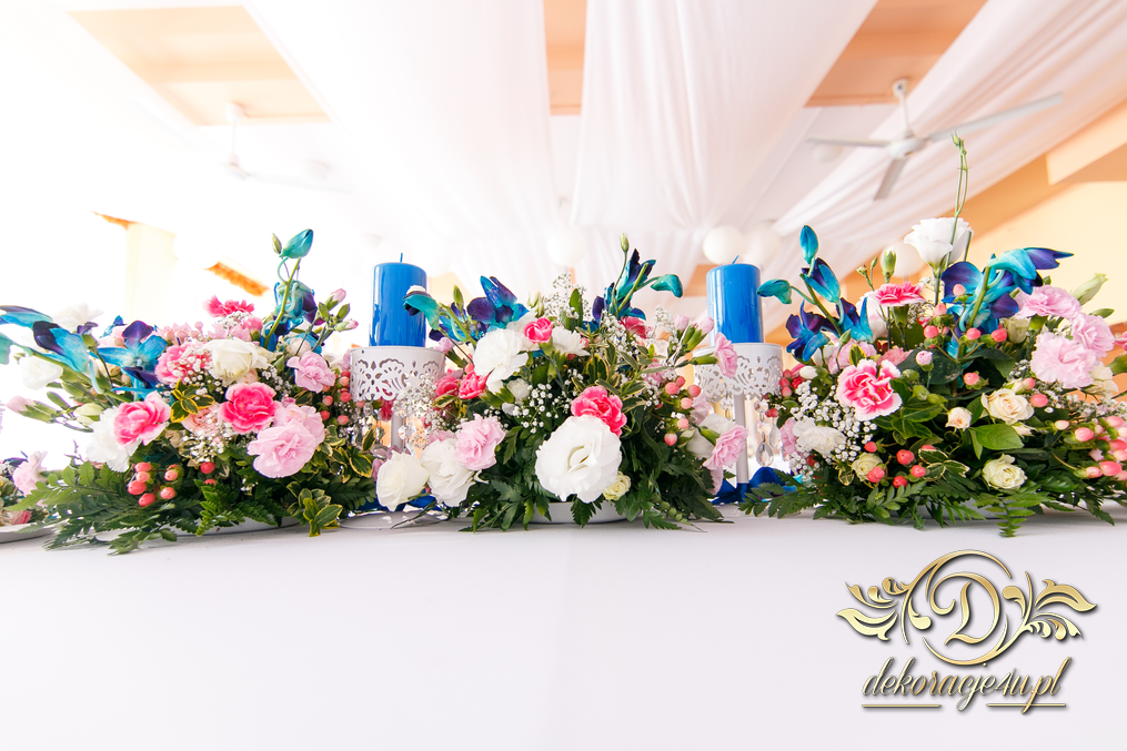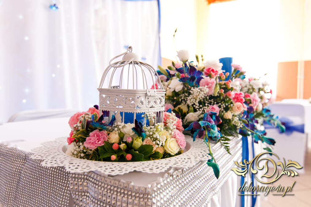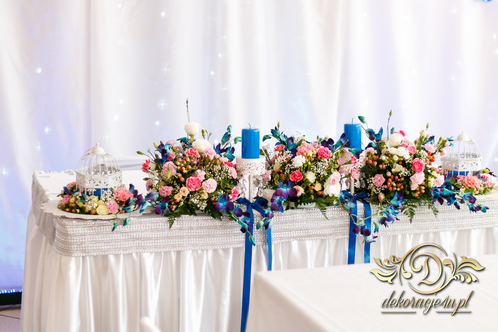 Lampiony otoczone żywymi kwiatami, wszystko w kolorze niebieskim - storczyki o których marzy każda Pani Młoda. Subtelnie i bardzo pięknie wyszła dekoracja sali.