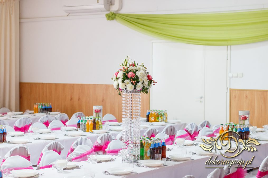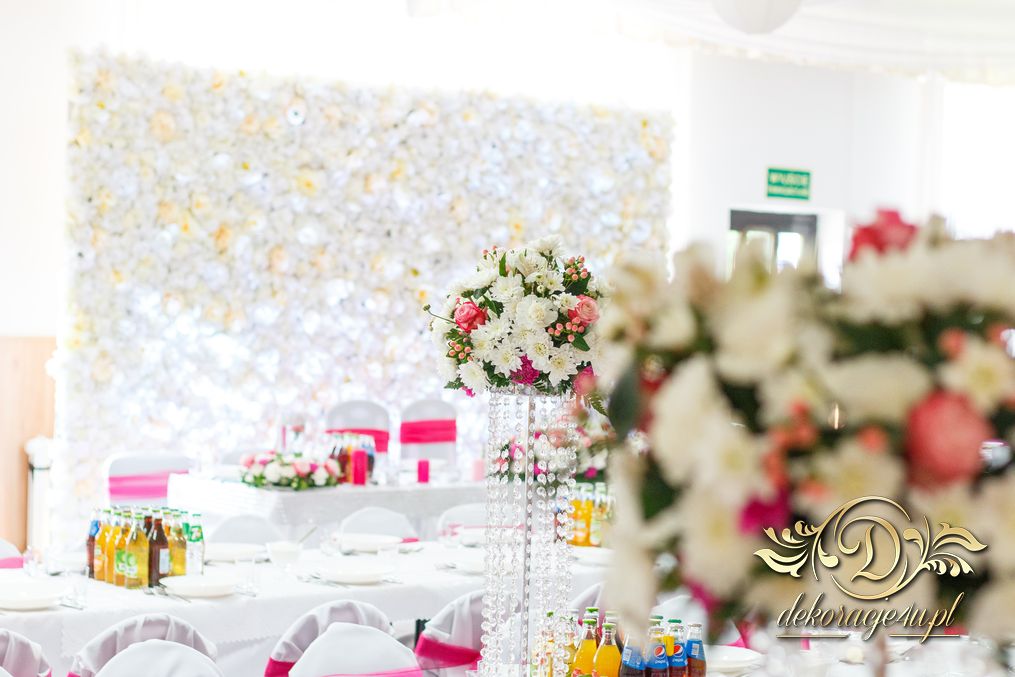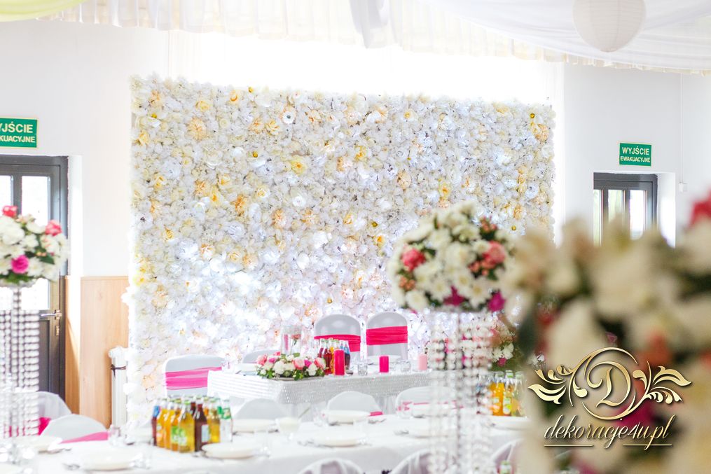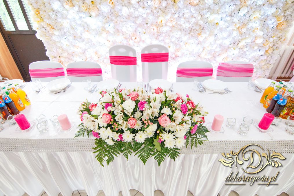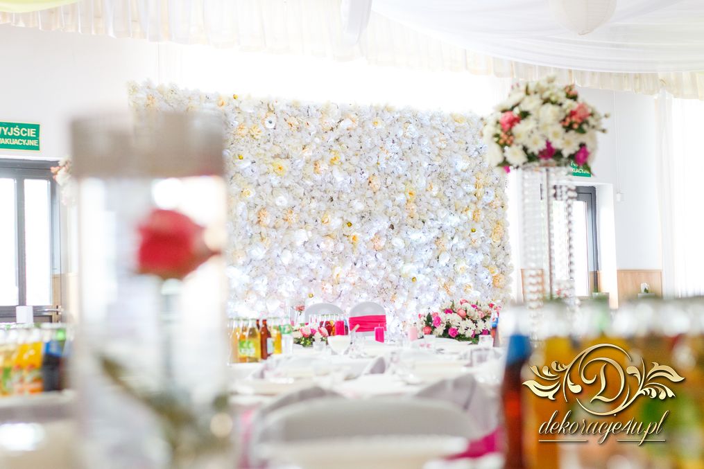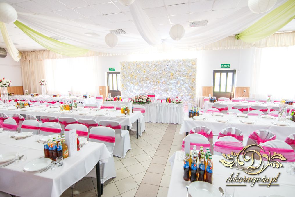 Dekoracja sali weselnej w najbliższym miejscu naszej siedziby firmy. Tym razem - pokrowce, kokardy, kwiaty, na stołach tuby z zatopioną różyczką, a ścianka za Parą Młodą - nasza piękna kwiatowa 🙂