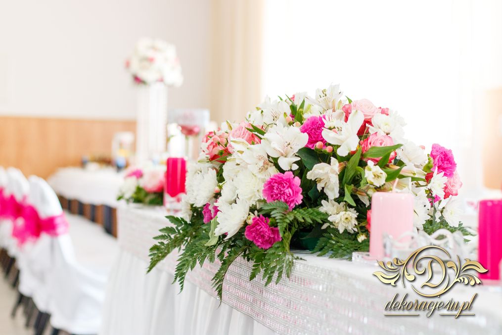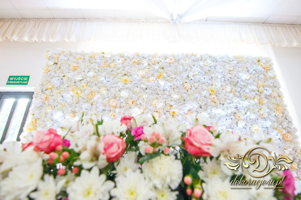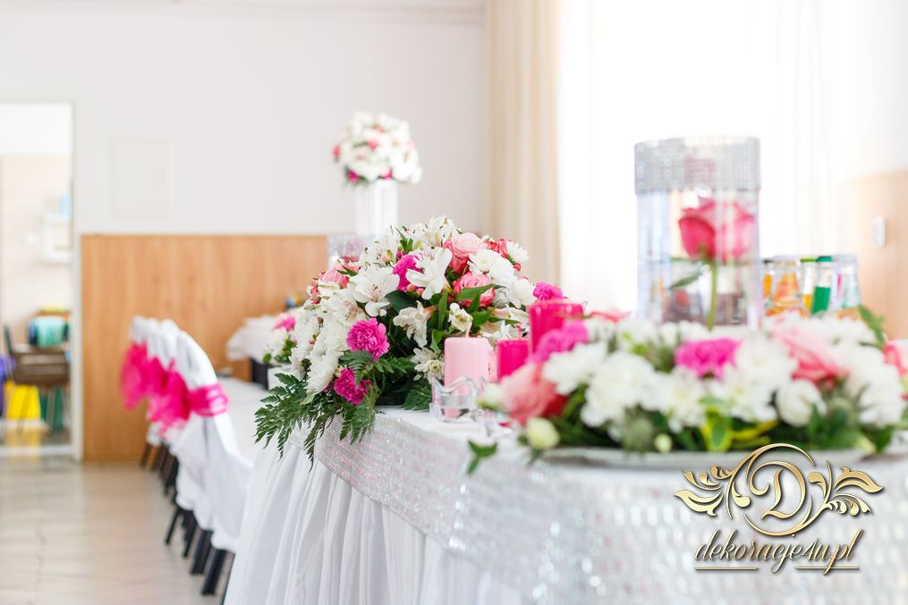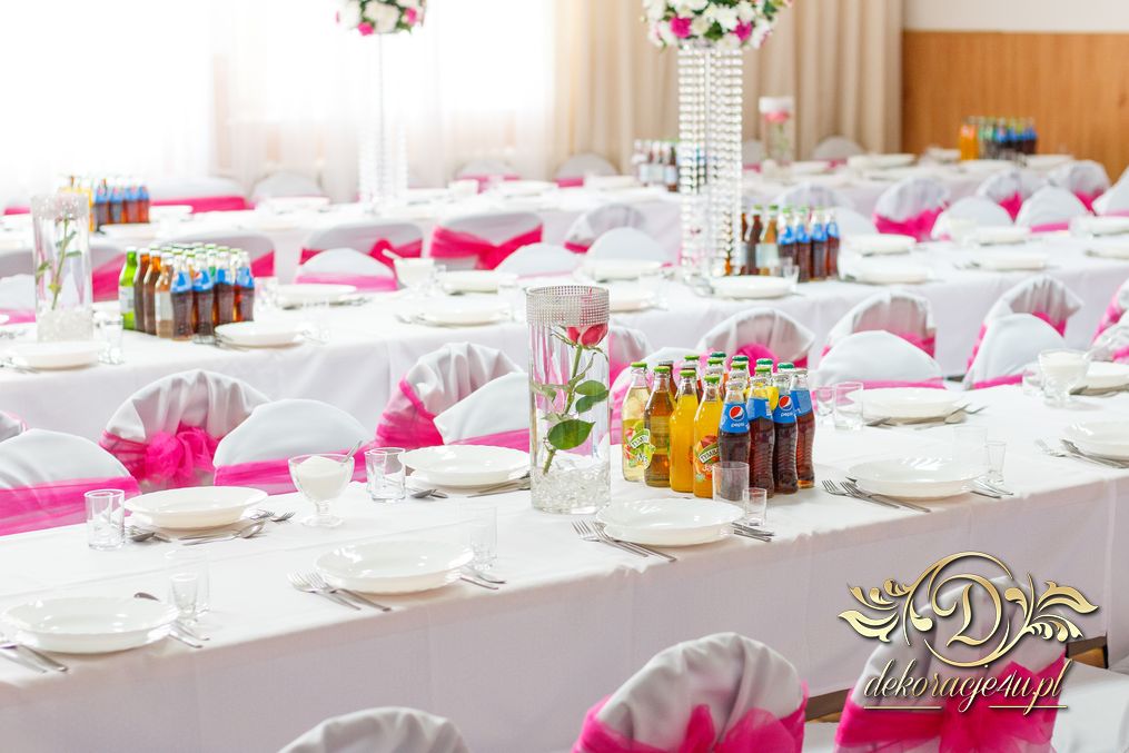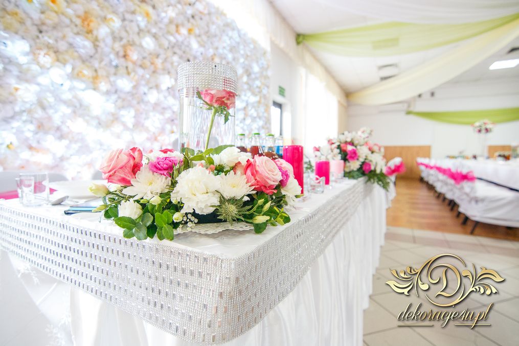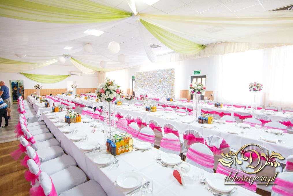 Dekoracja sali weselnej w najbliższym miejscu naszej siedziby firmy. Tym razem - pokrowce, kokardy, kwiaty, na stołach tuby z zatopioną różyczką, a ścianka za Parą Młodą - nasza piękna kwiatowa 🙂