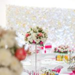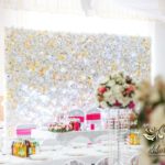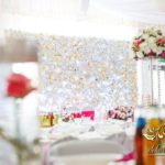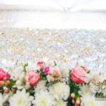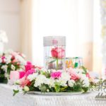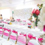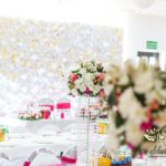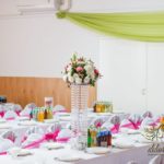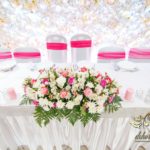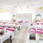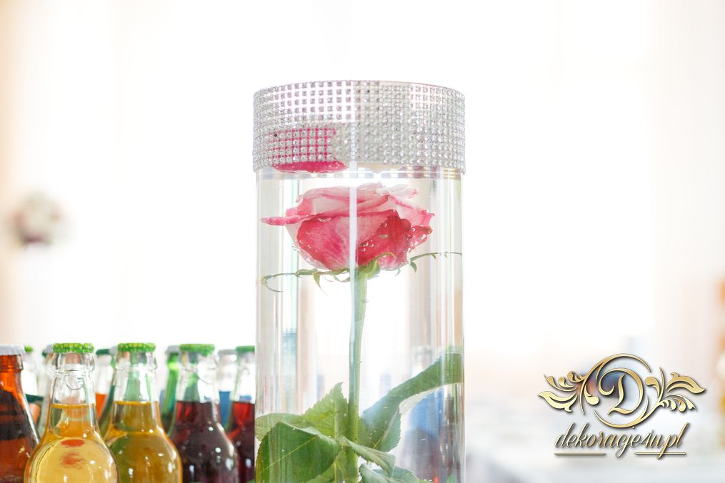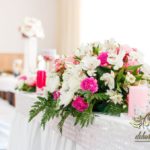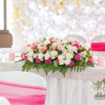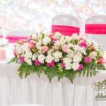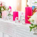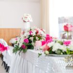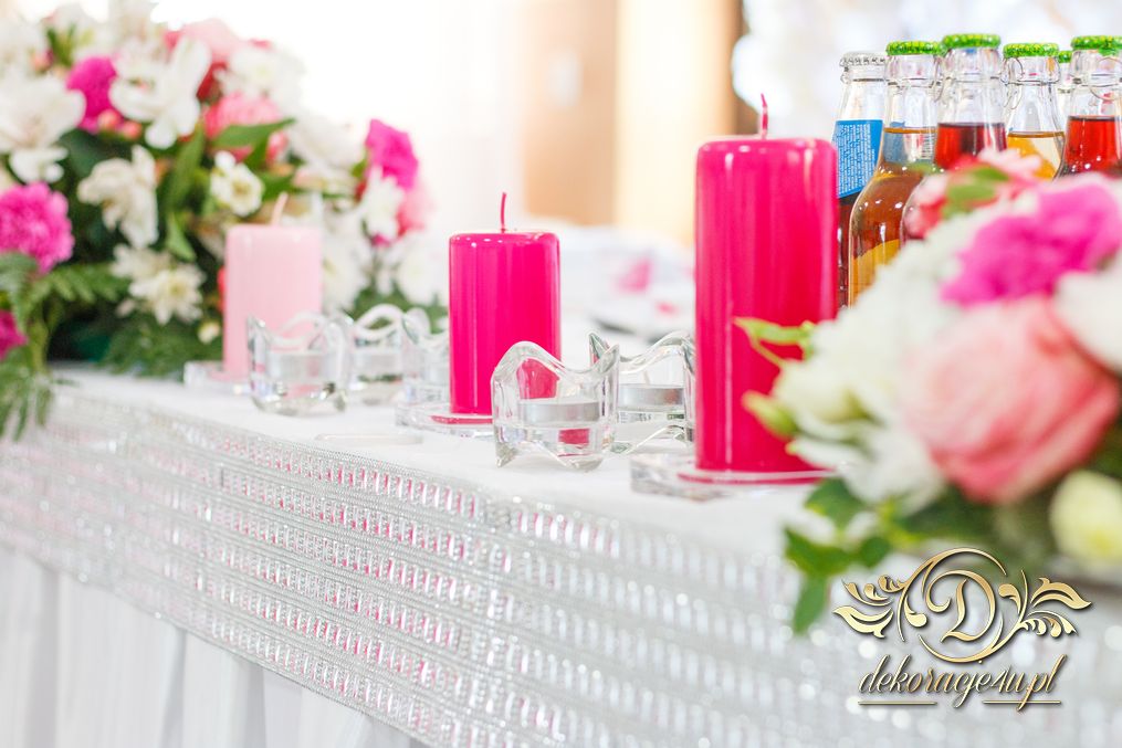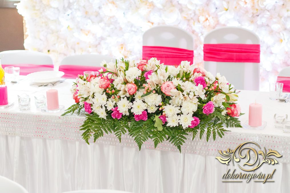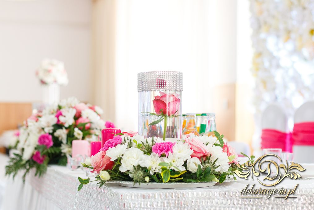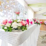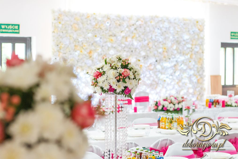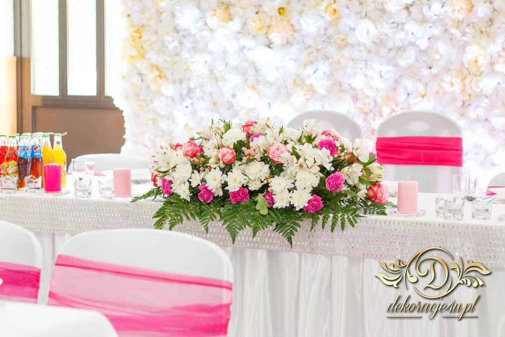 Dekoracja sali weselnej w najbliższym miejscu naszej siedziby firmy. Tym razem - pokrowce, kokardy, kwiaty, na stołach tuby z zatopioną różyczką, a ścianka za Parą Młodą - nasza piękna kwiatowa 🙂