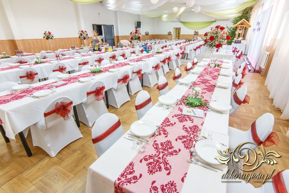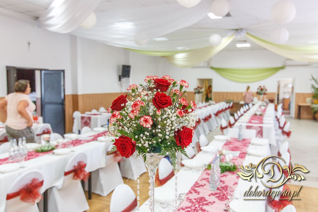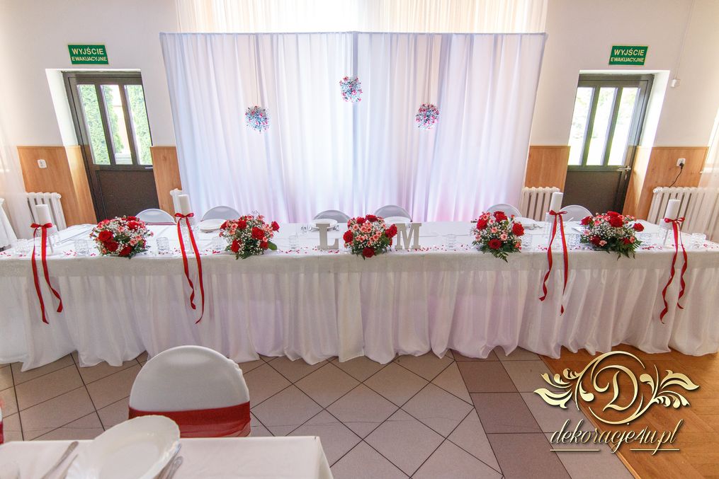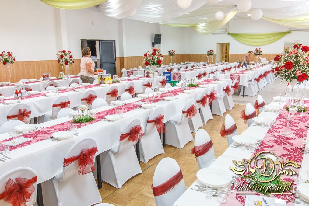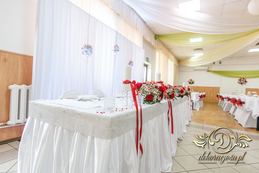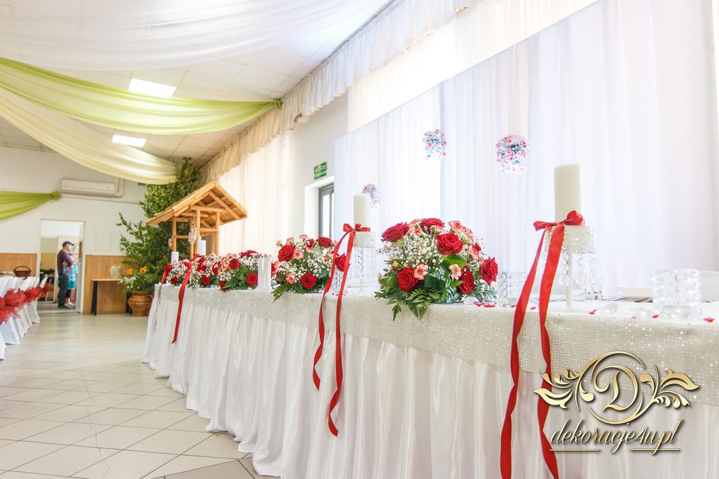 Dekoracja sali w kolorze czerwieni zawsze nam przypada do gustu. Kwiaty, ścianka - oczywiście pokrowce elastyczne zawsze dodadzą uroku miejscu przyjęcia weselnego. Na wejściu brama balonowa.