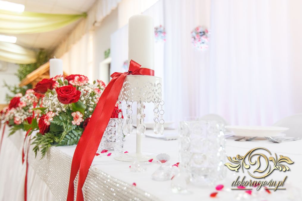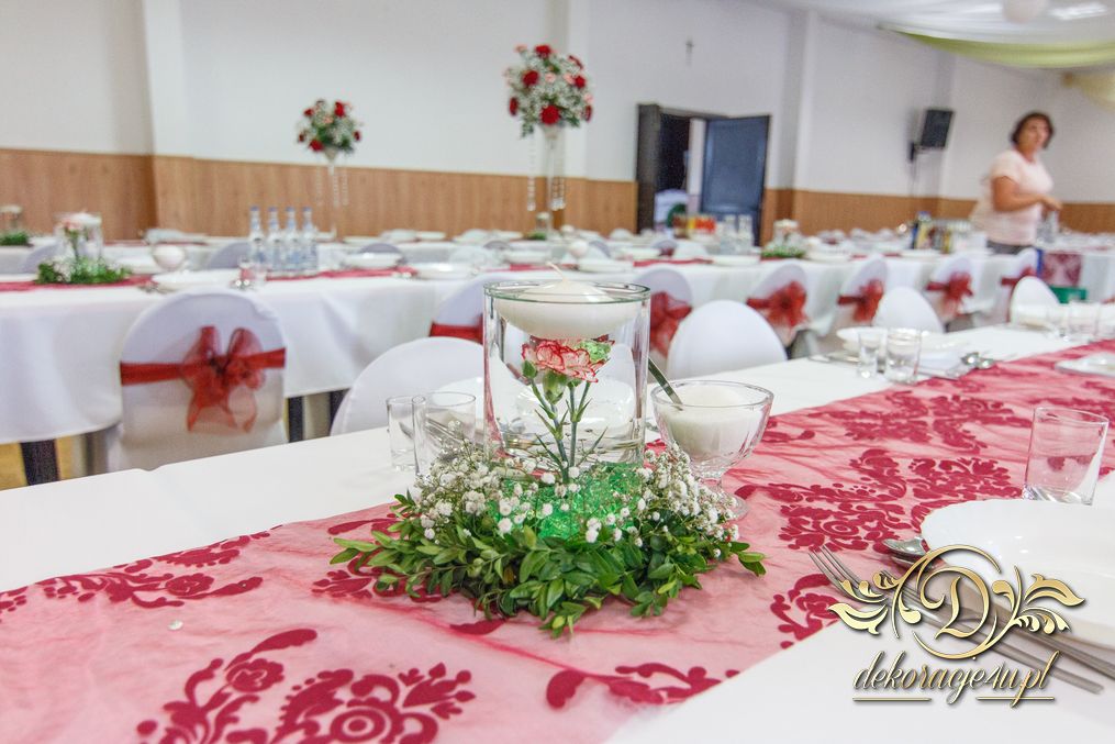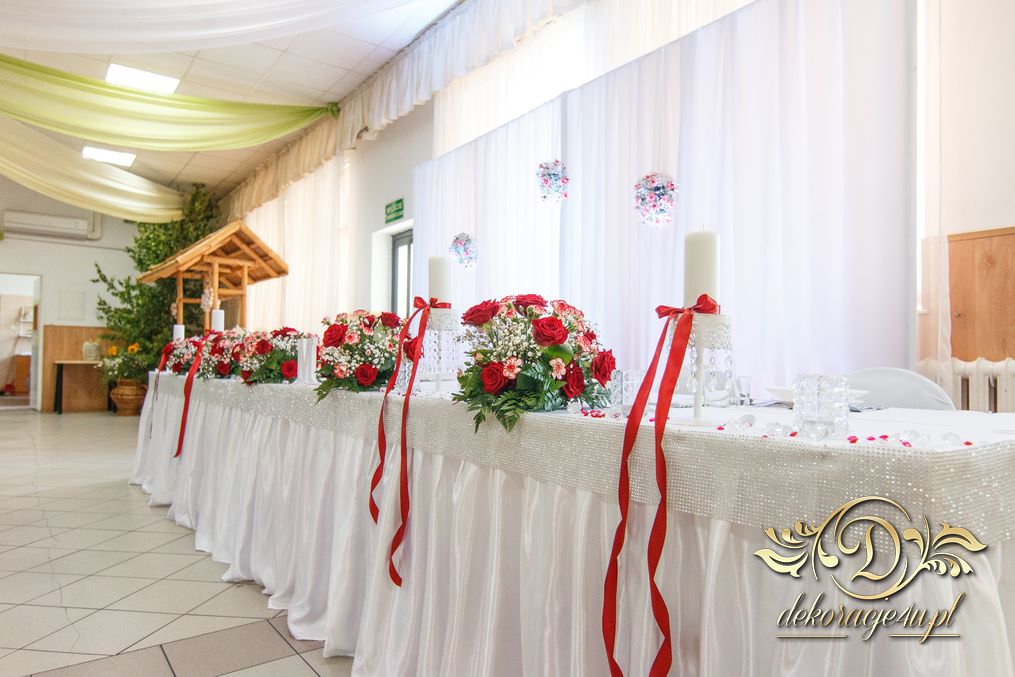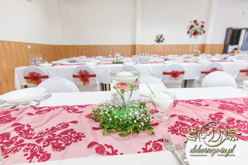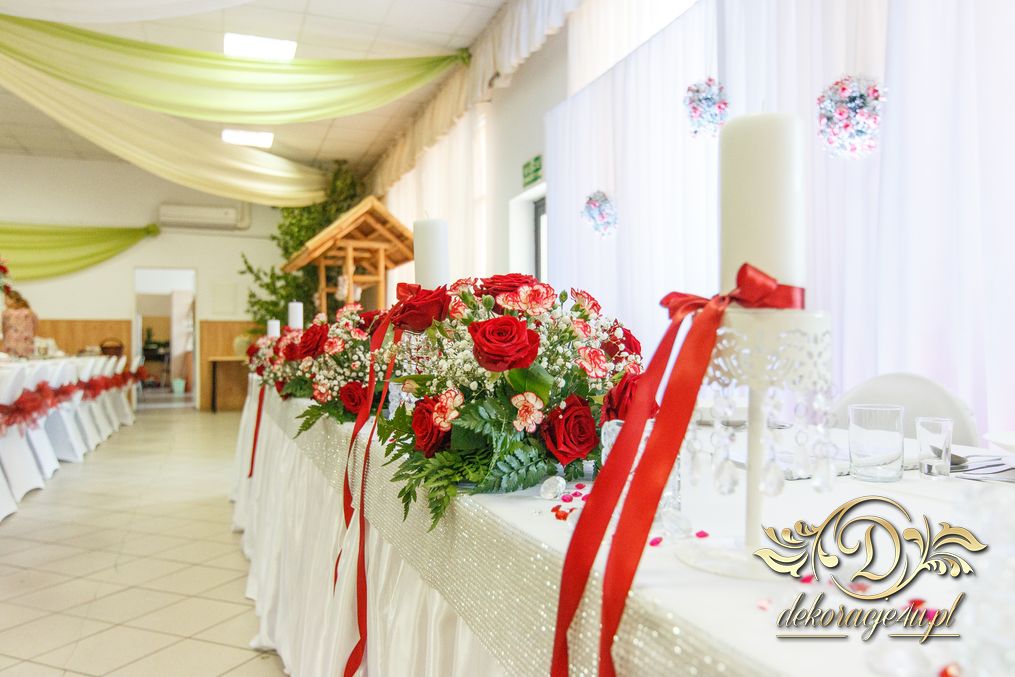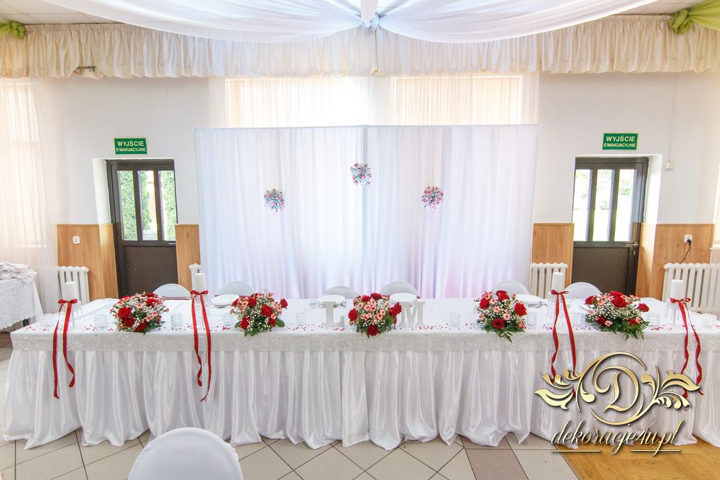 Dekoracja sali w kolorze czerwieni zawsze nam przypada do gustu. Kwiaty, ścianka - oczywiście pokrowce elastyczne zawsze dodadzą uroku miejscu przyjęcia weselnego. Na wejściu brama balonowa.