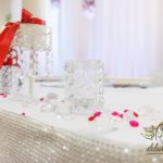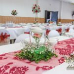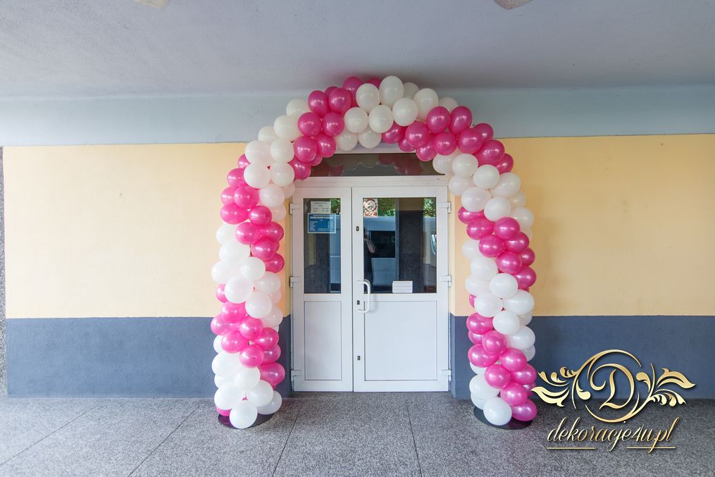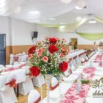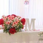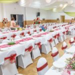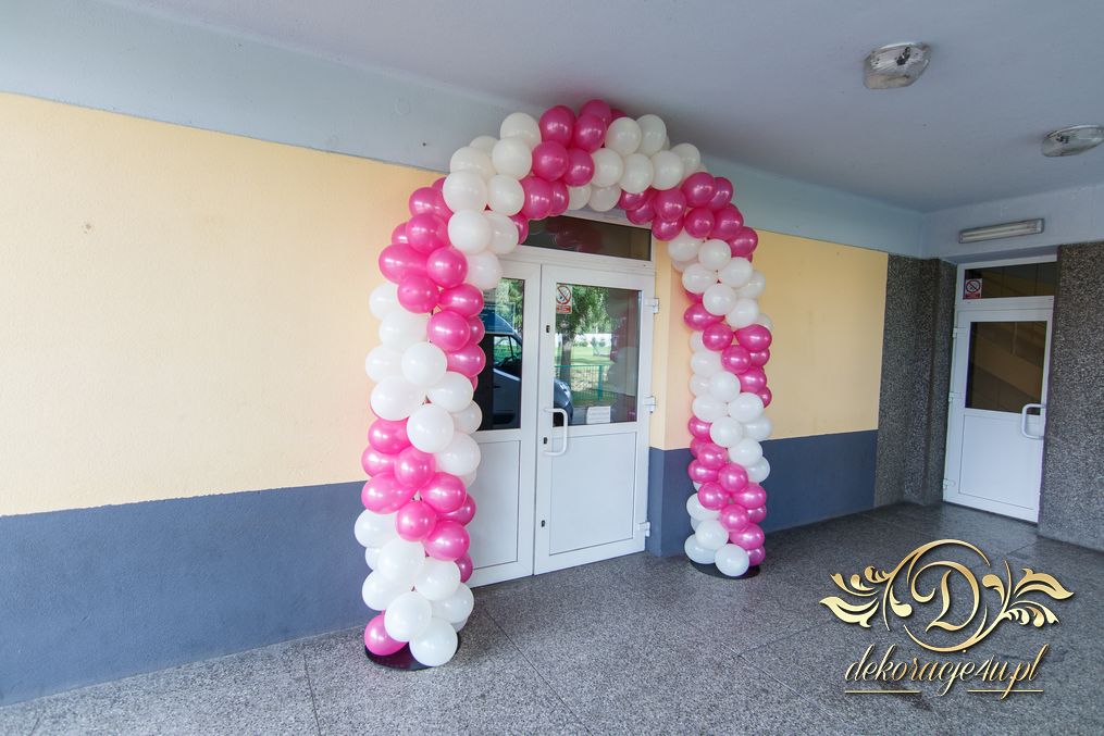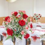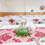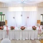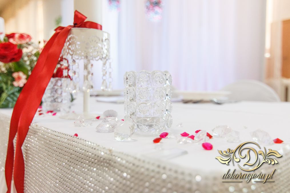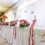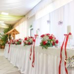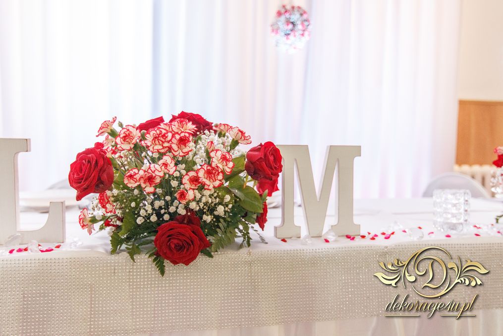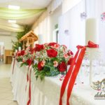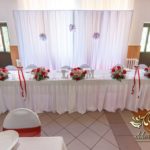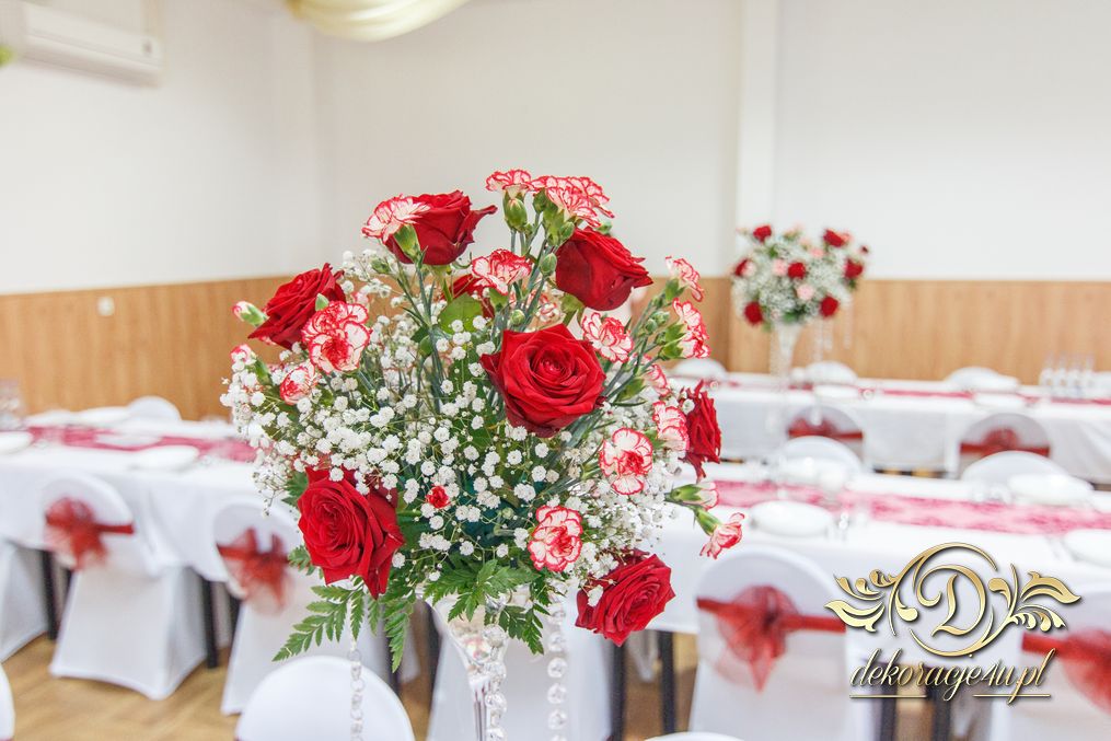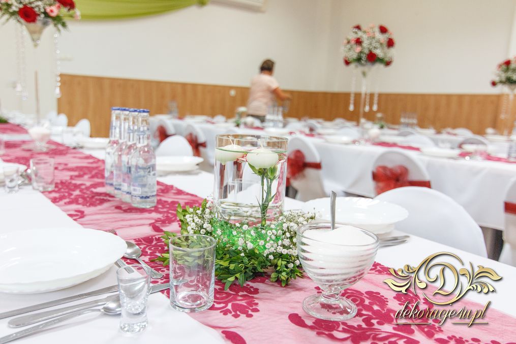 Dekoracja sali w kolorze czerwieni zawsze nam przypada do gustu. Kwiaty, ścianka - oczywiście pokrowce elastyczne zawsze dodadzą uroku miejscu przyjęcia weselnego. Na wejściu brama balonowa.