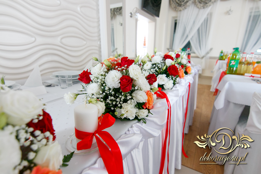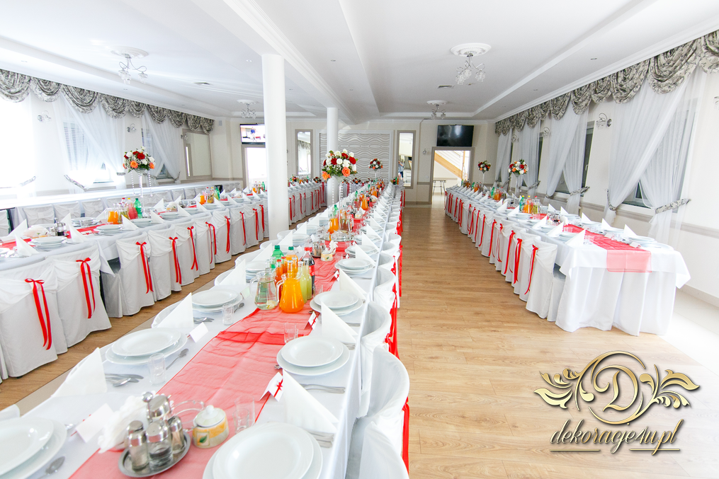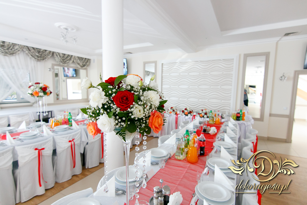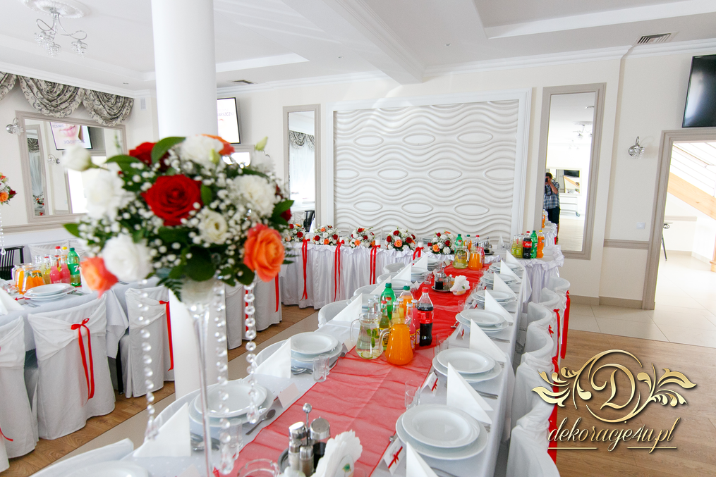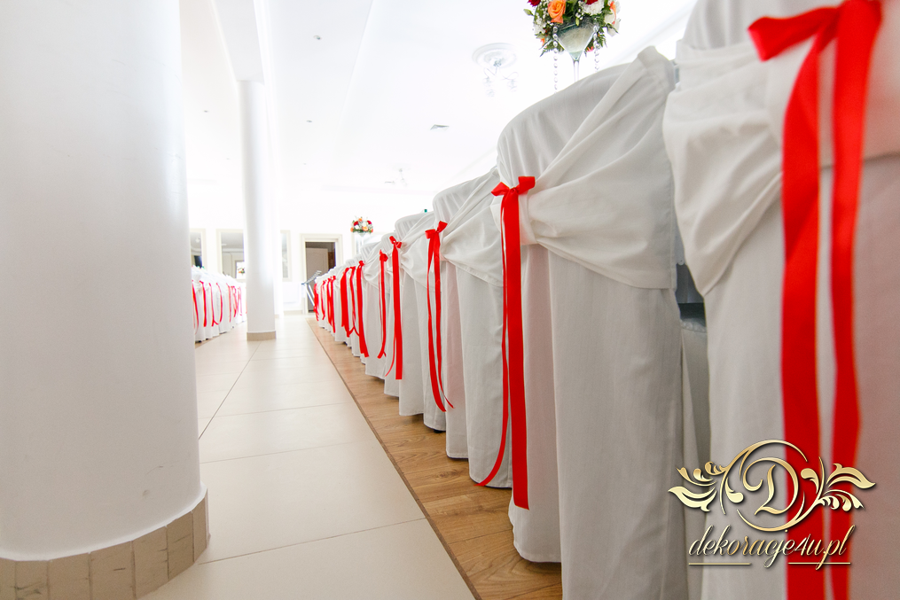 Bieżniki, kokardki, kwiaty w kolorze czerwonym - zgodnie z życzeniem Państwa Młodych. Efekt końcowy - cudoooo.