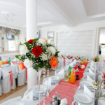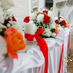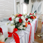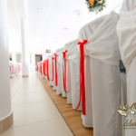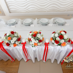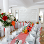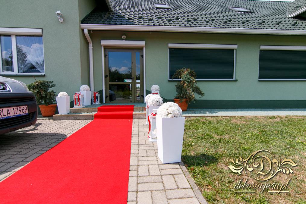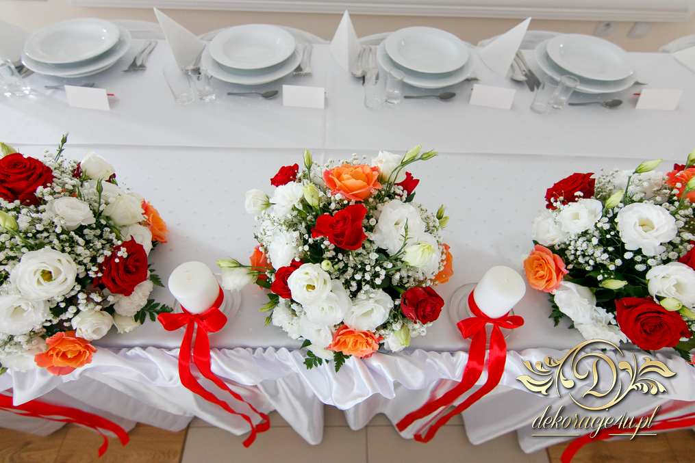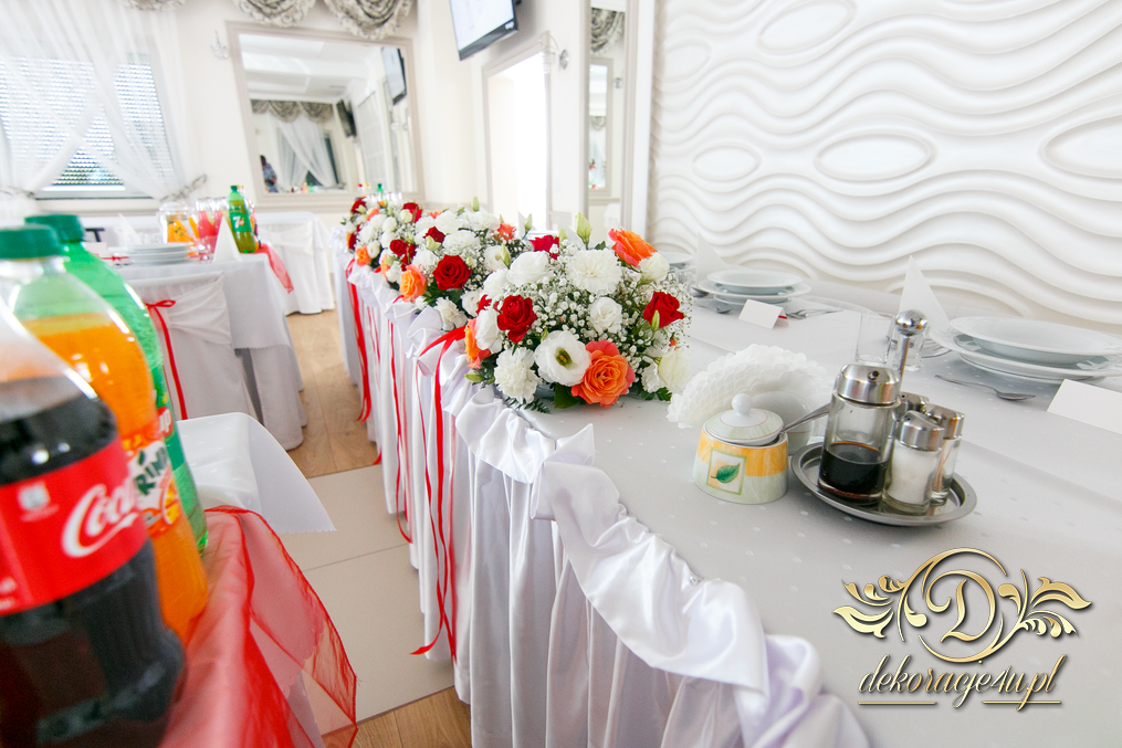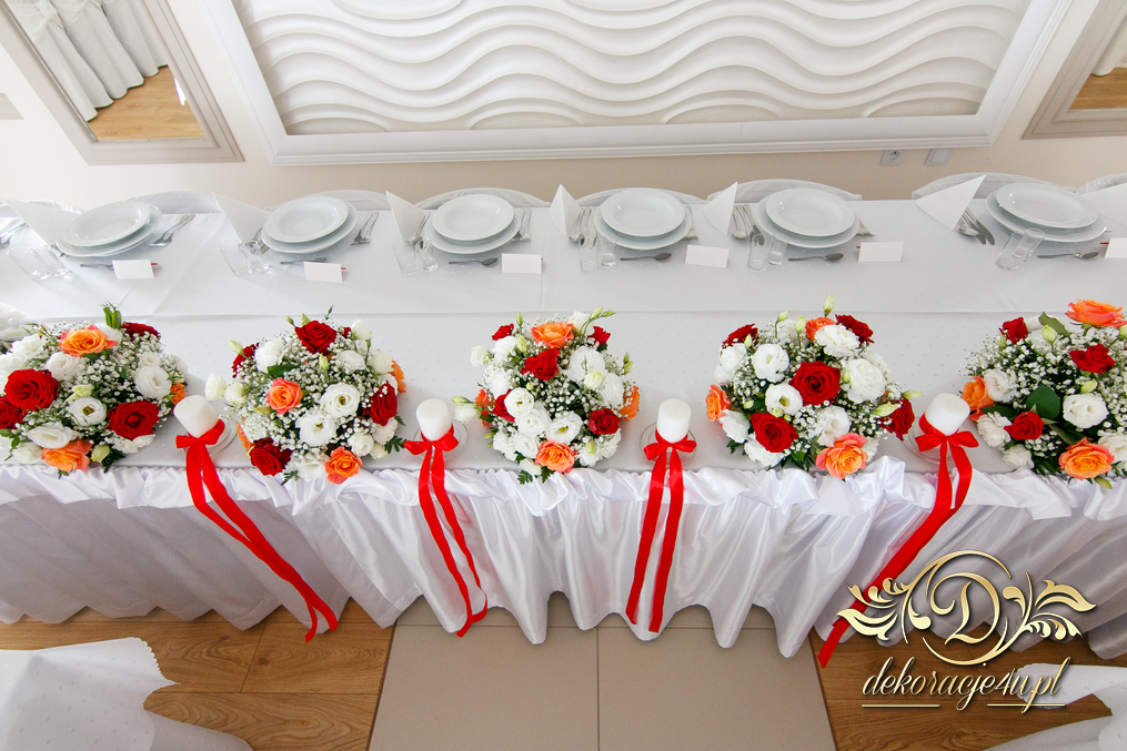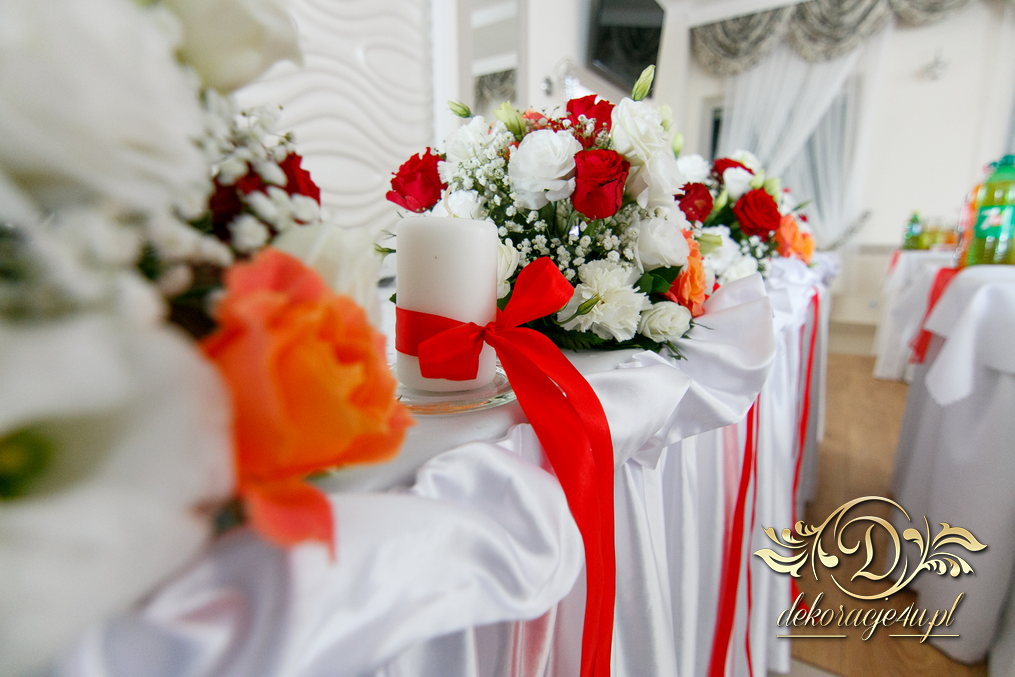 Bieżniki, kokardki, kwiaty w kolorze czerwonym - zgodnie z życzeniem Państwa Młodych. Efekt końcowy - cudoooo.