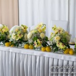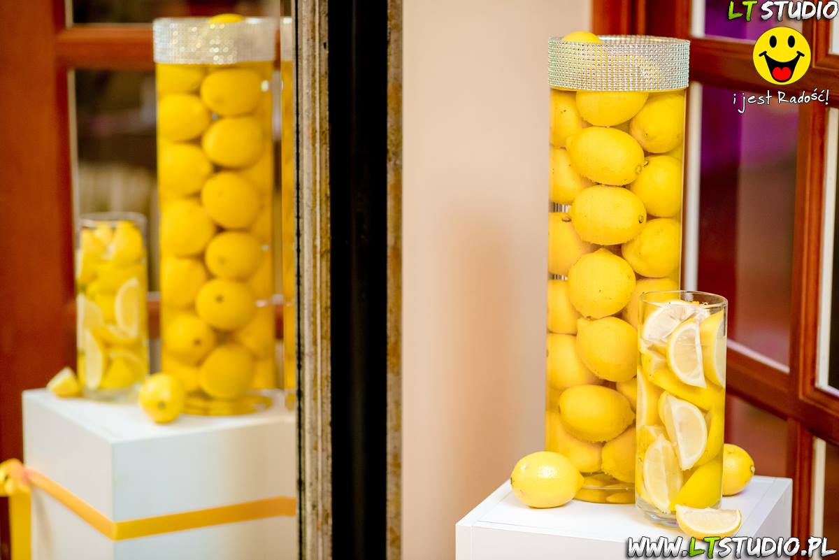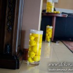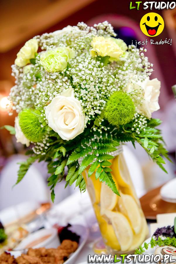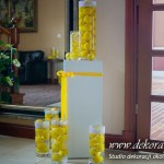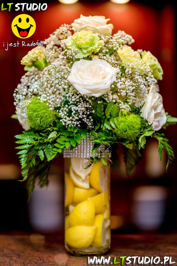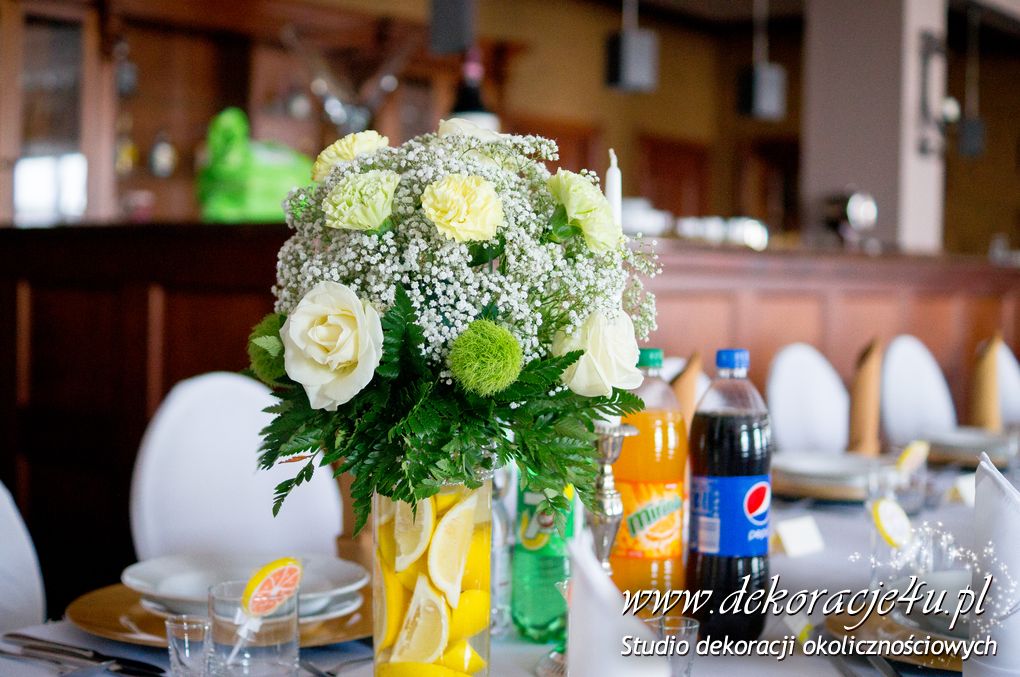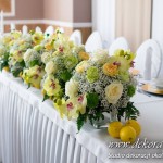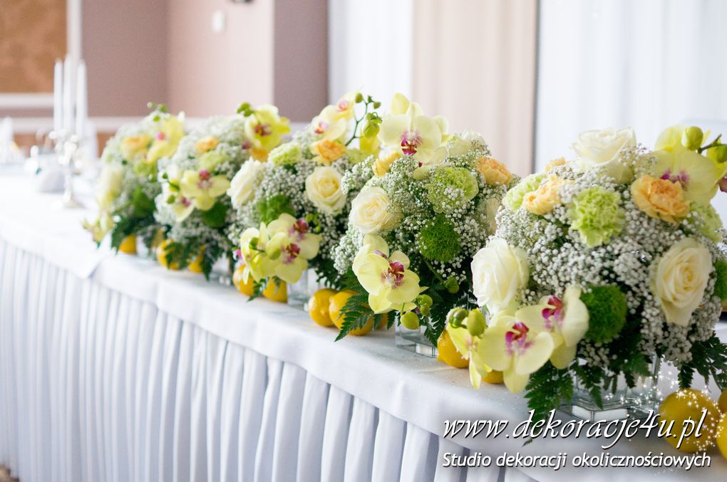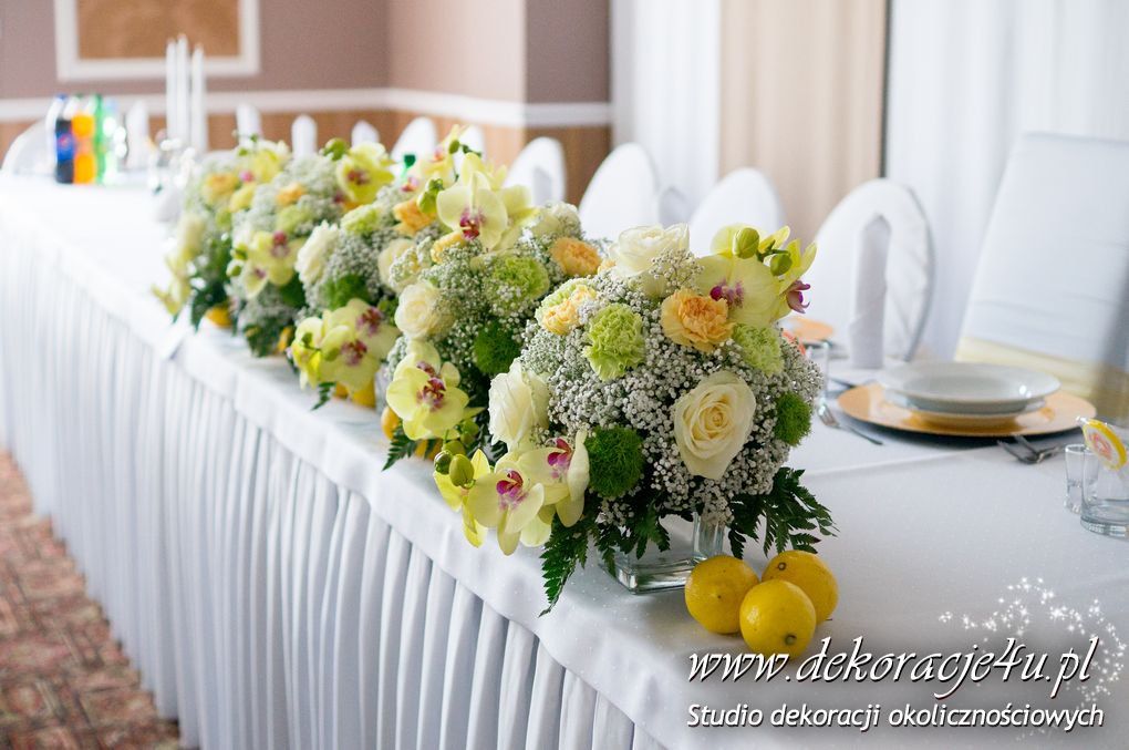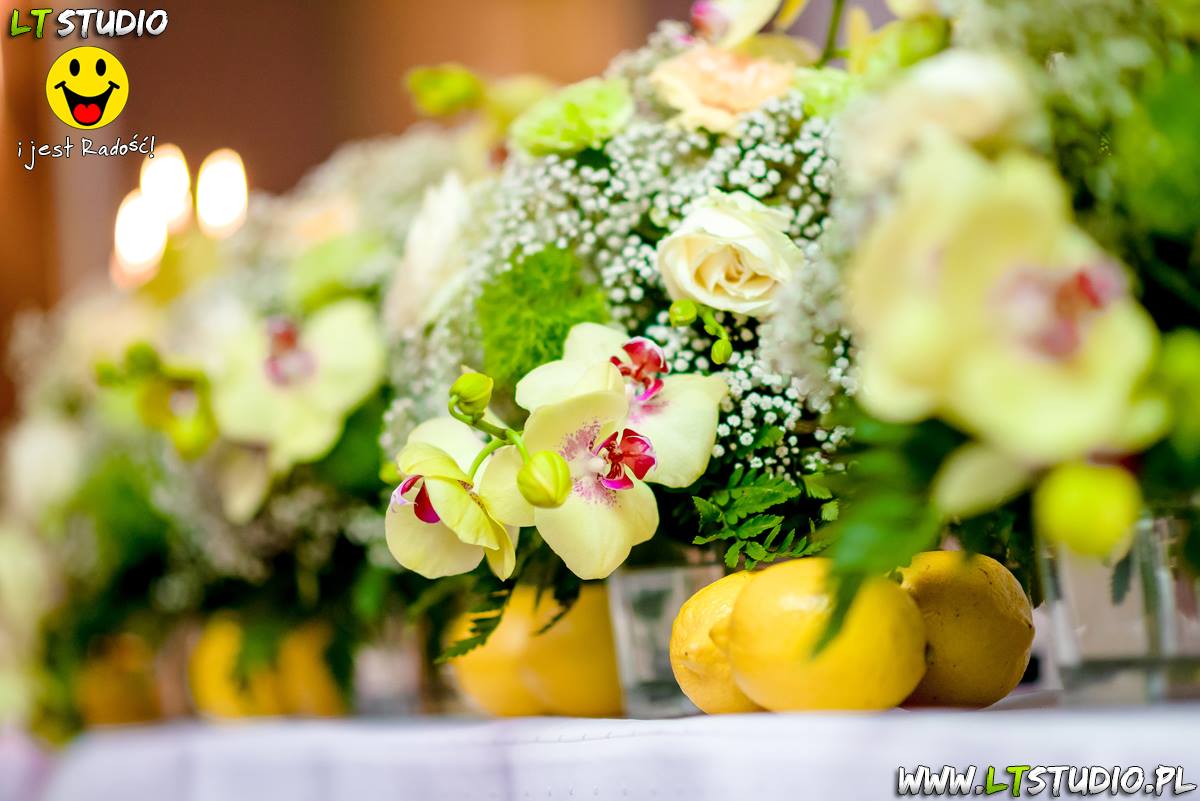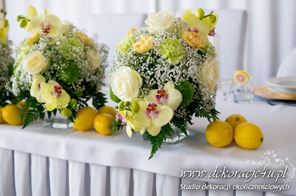 Wspaniała dekoracja cytrynowa. Motywem przewodnim dekoracji była cytryna. Kwiaty na stołach w podobnym stylu i kolorystyce - na stole prezydialnym kwiaty z dodatkiem storczyka.