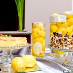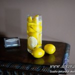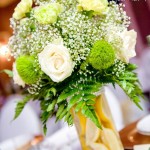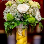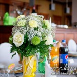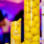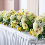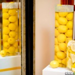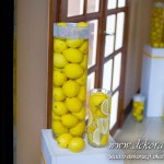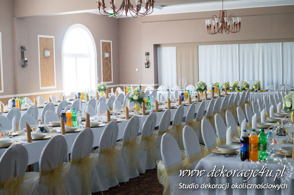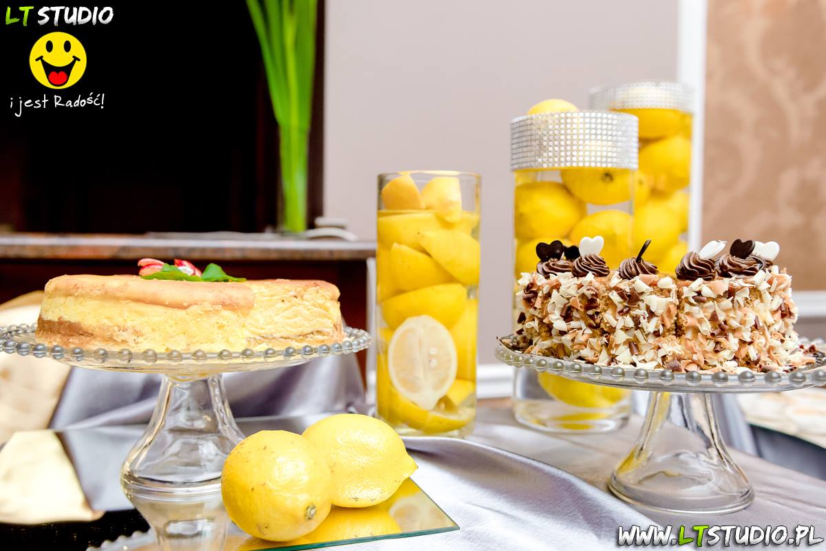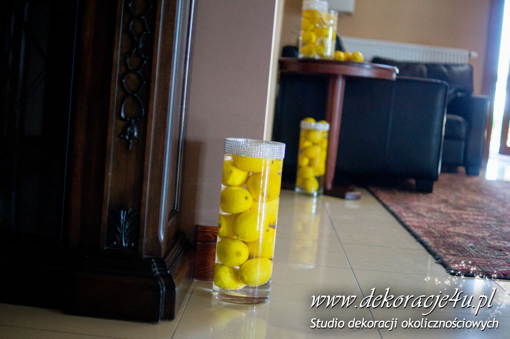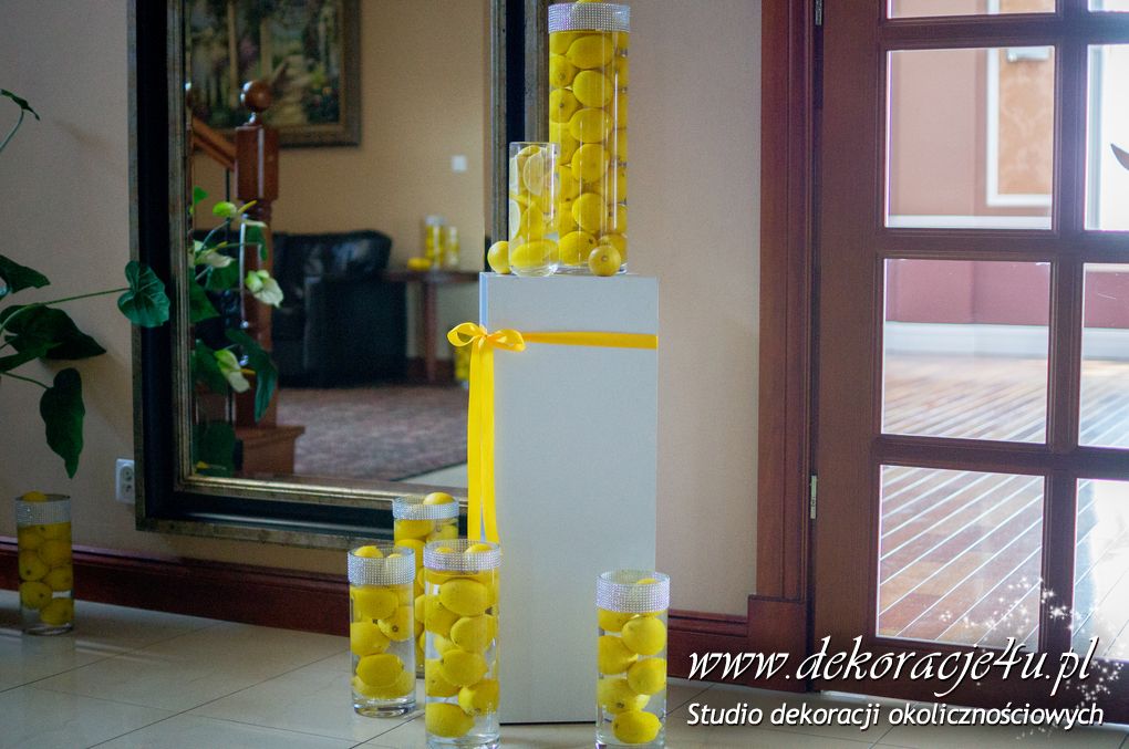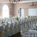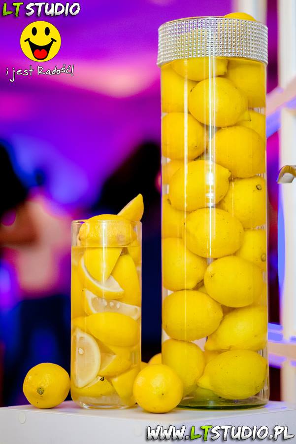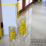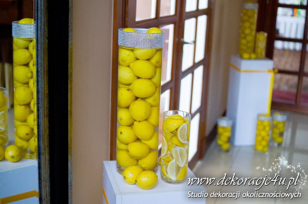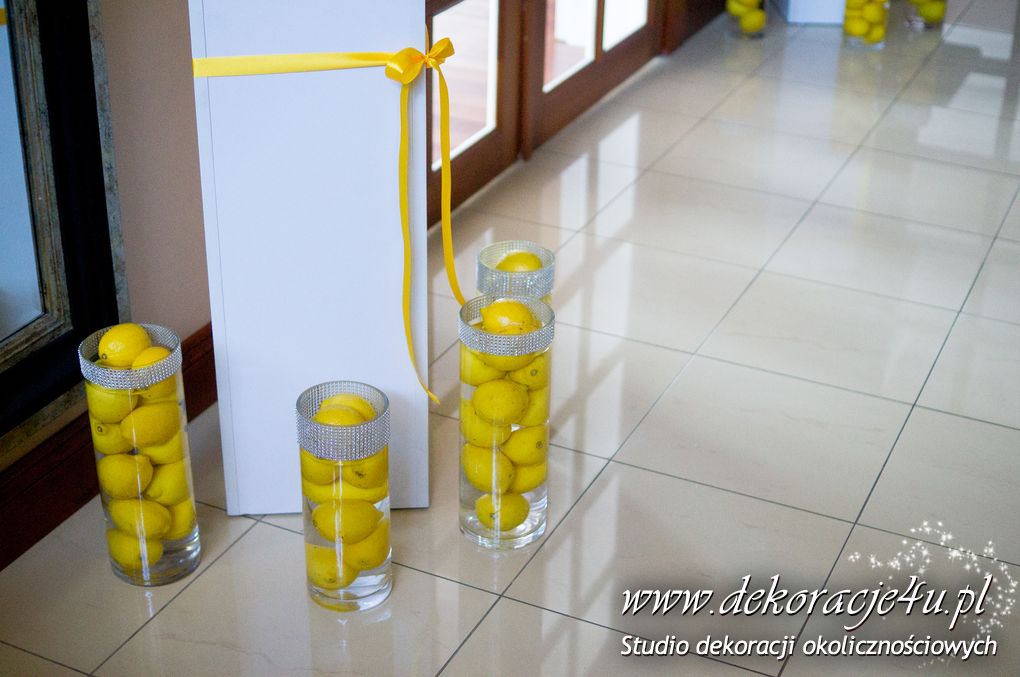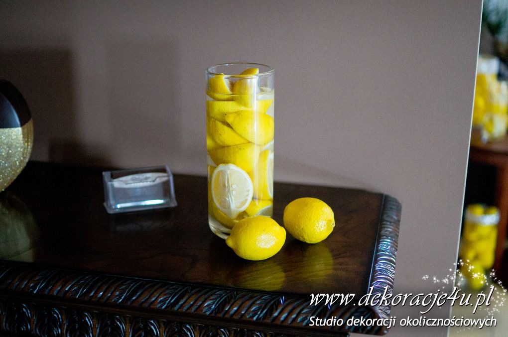 Wspaniała dekoracja cytrynowa. Motywem przewodnim dekoracji była cytryna. Kwiaty na stołach w podobnym stylu i kolorystyce - na stole prezydialnym kwiaty z dodatkiem storczyka.