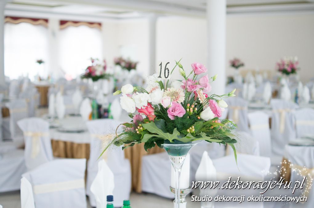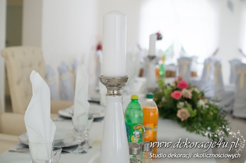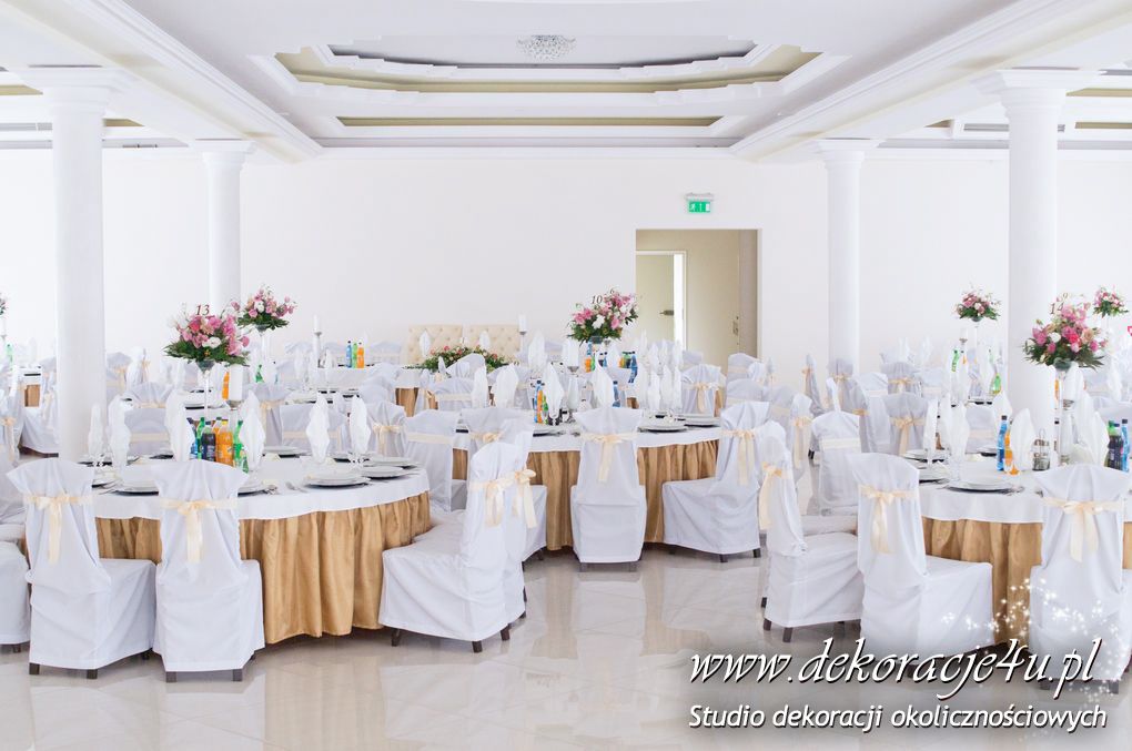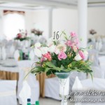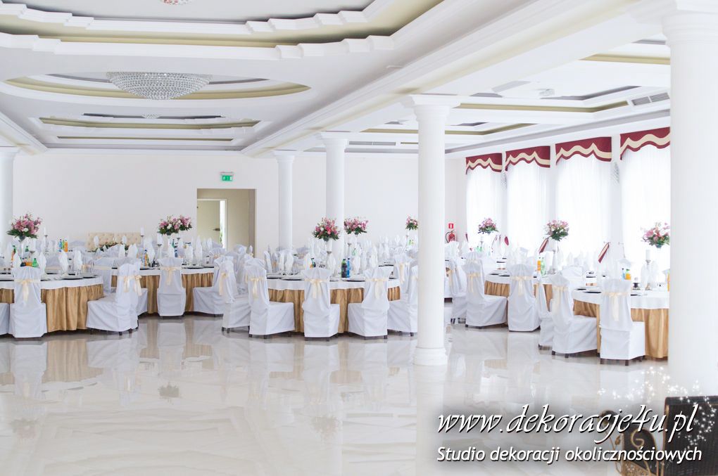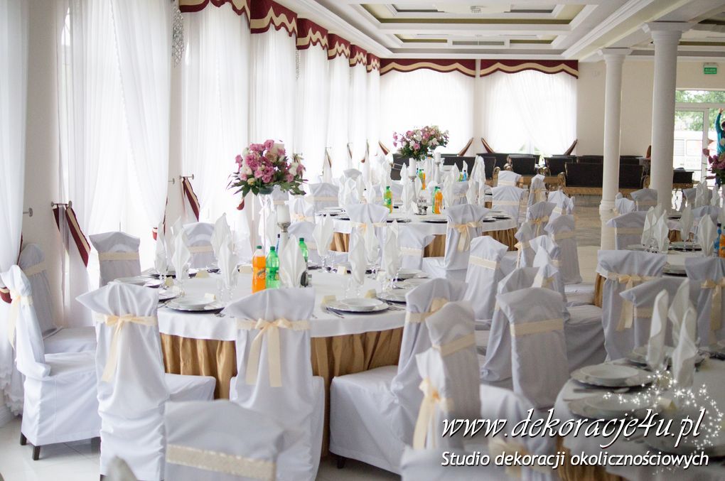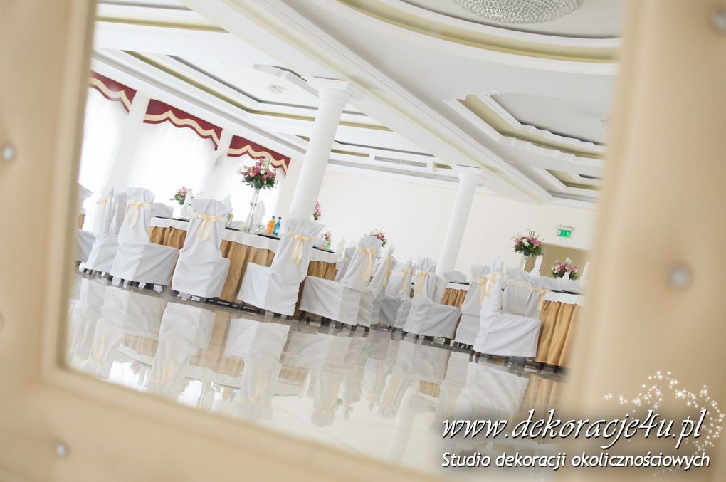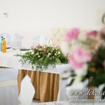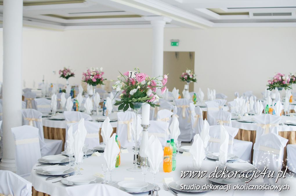 Dekoracja Dworu Olimp do obejrzenia na zdjęciach poniżej. Z naszej strony Dwór został upiększony o przepiękne pokrowce z kremową wstążką z dodatkiem koronki. Ponadto, na parapetach oraz na barze zostały ulokowane wazony ze świecami. Na stołach pojawiły się przepiękne kompozycje kwiatowe, które niesamowicie wkomponowały się w całość wystroju. Dodatkowo, do bukietów zostały dodane numerki stołów. Pozdrawiamy Młodych i życzymy szczęścia 🙂