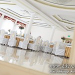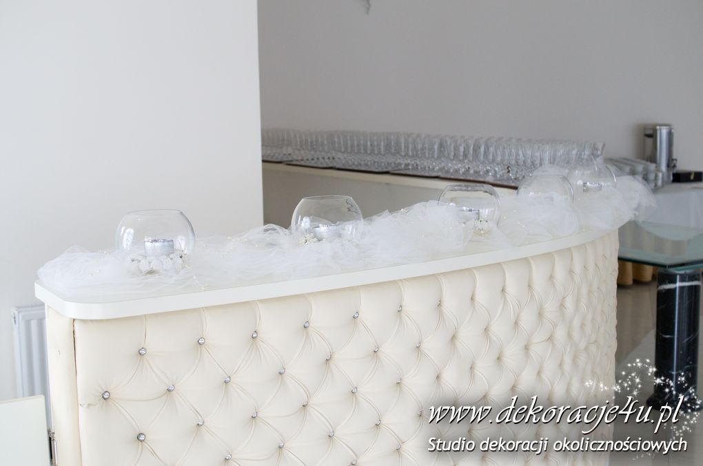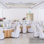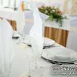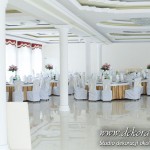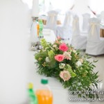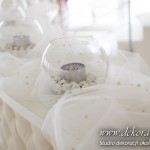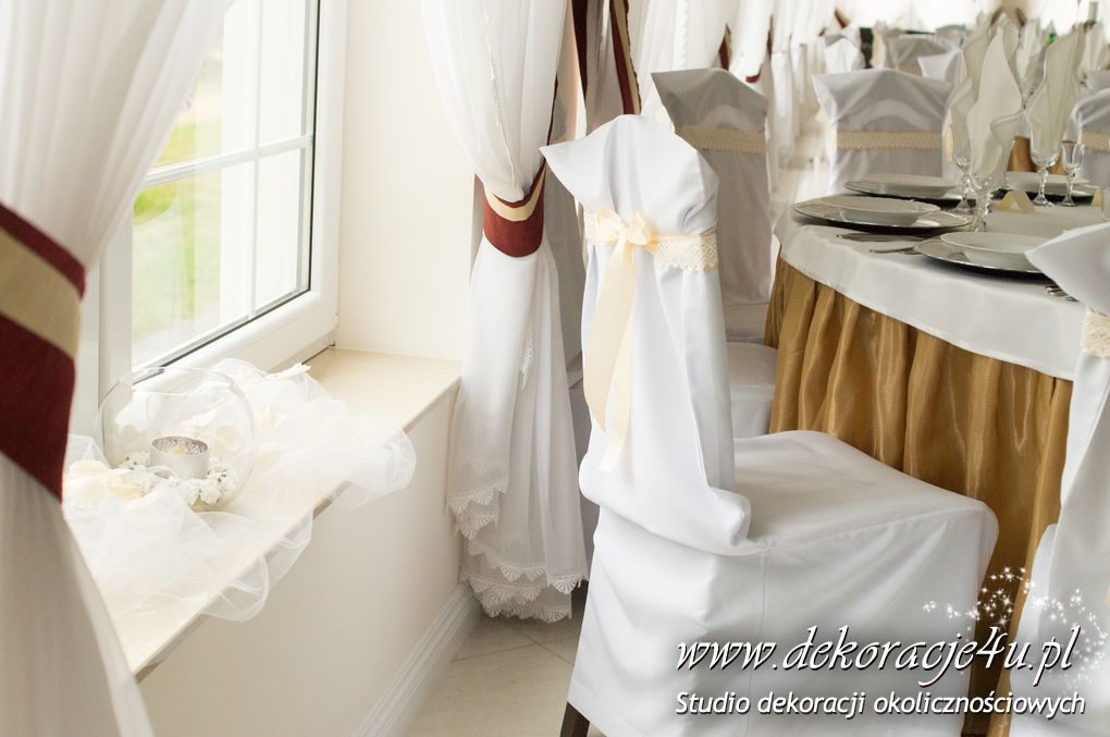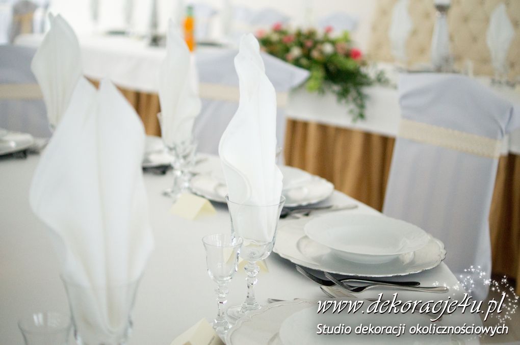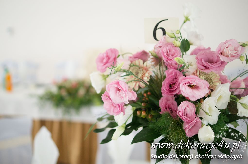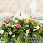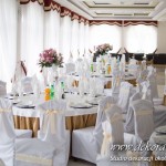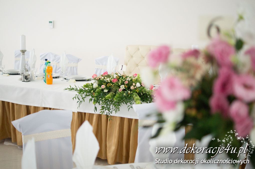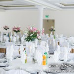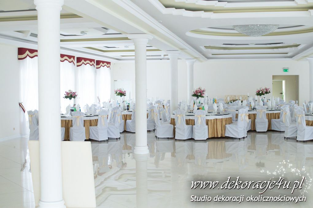 Dekoracja Dworu Olimp do obejrzenia na zdjęciach poniżej. Z naszej strony Dwór został upiększony o przepiękne pokrowce z kremową wstążką z dodatkiem koronki. Ponadto, na parapetach oraz na barze zostały ulokowane wazony ze świecami. Na stołach pojawiły się przepiękne kompozycje kwiatowe, które niesamowicie wkomponowały się w całość wystroju. Dodatkowo, do bukietów zostały dodane numerki stołów. Pozdrawiamy Młodych i życzymy szczęścia 🙂