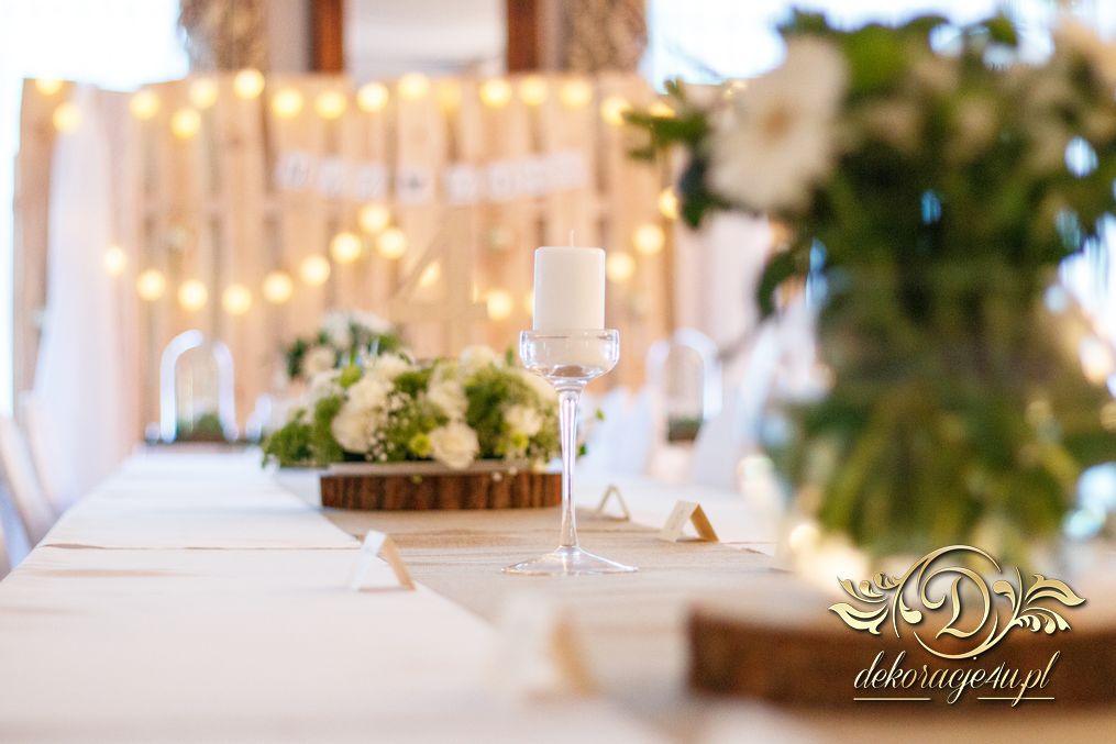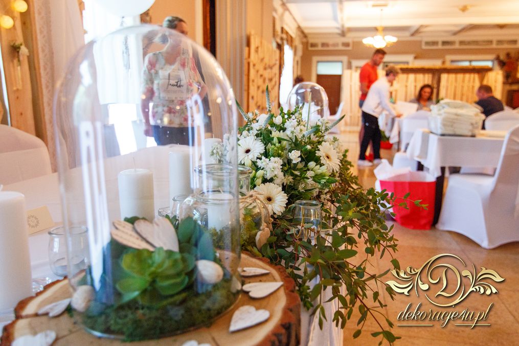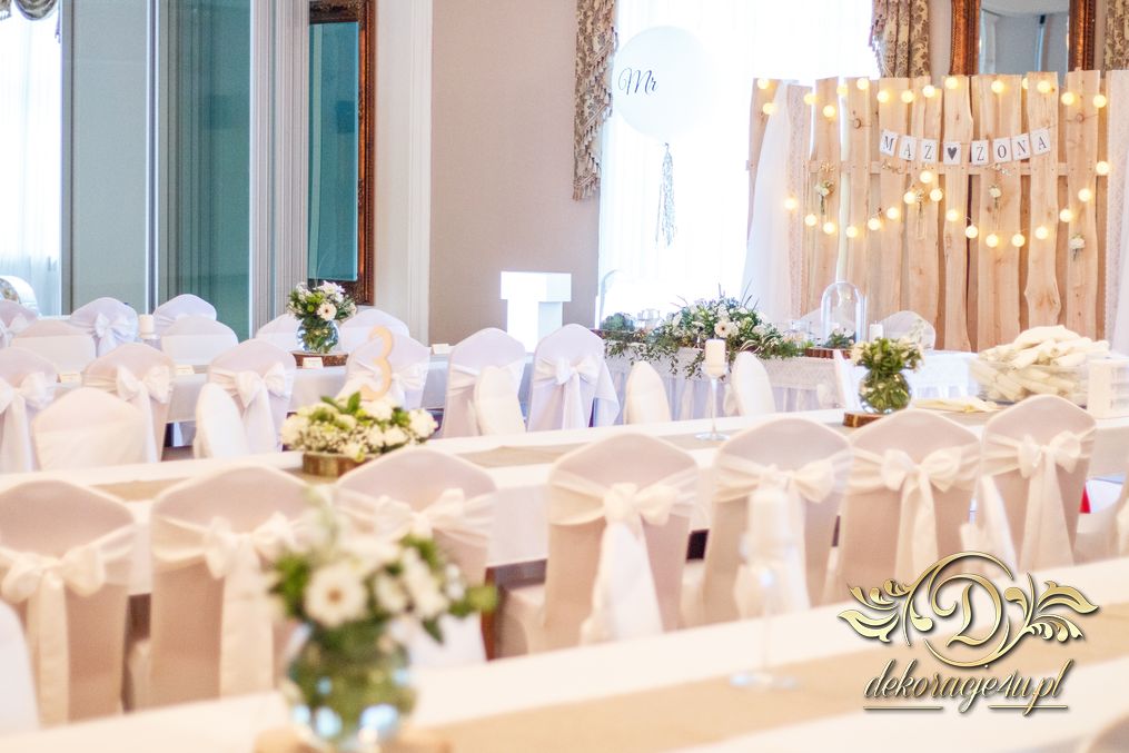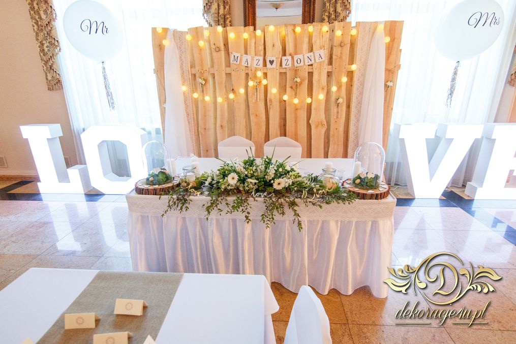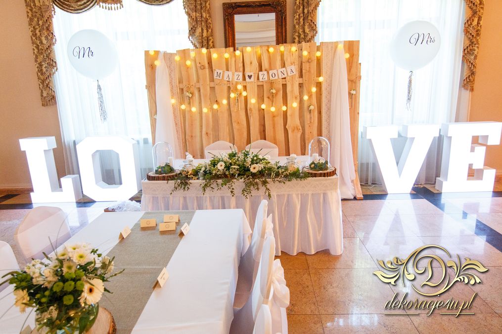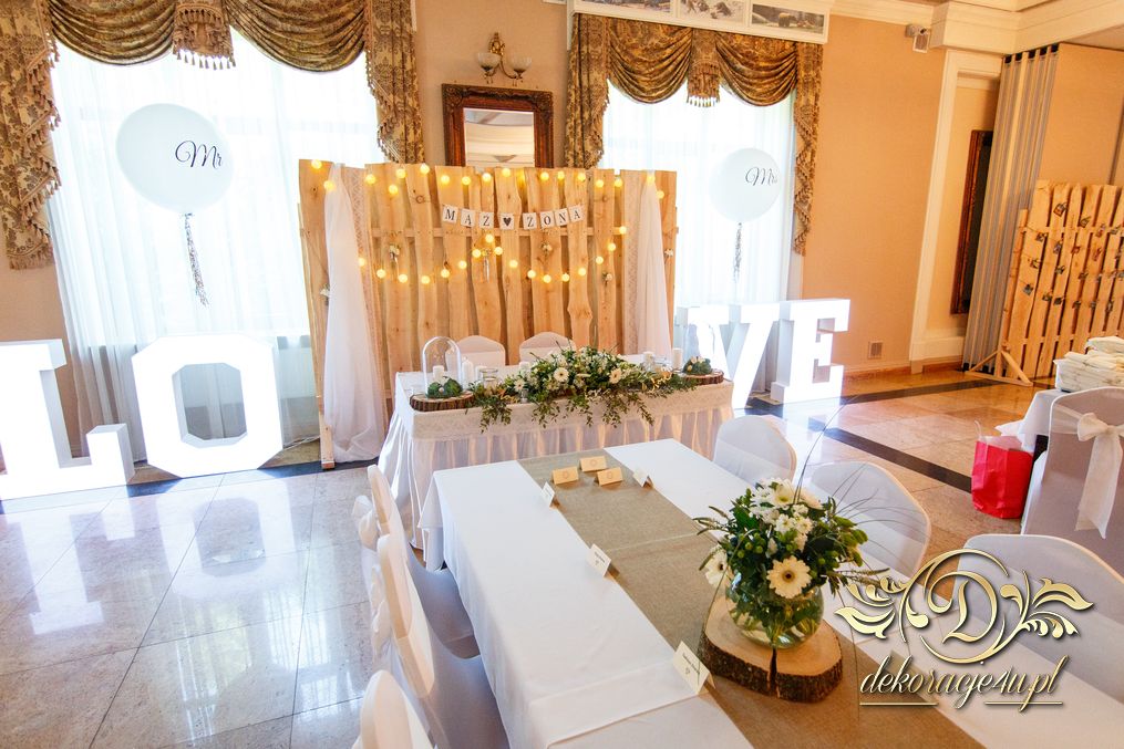 Tego wesela nie da się opisać, to trzeba po postu zobaczyć na zdjęciach. W wielkim skrócie: ogromny napis LOVE, pokrowce elastyczne, kwiaty, świece, drewno. Całość do tego miejsca wkomponowana idealnie. Radość Pani i Pana Młodego - supeeeer.