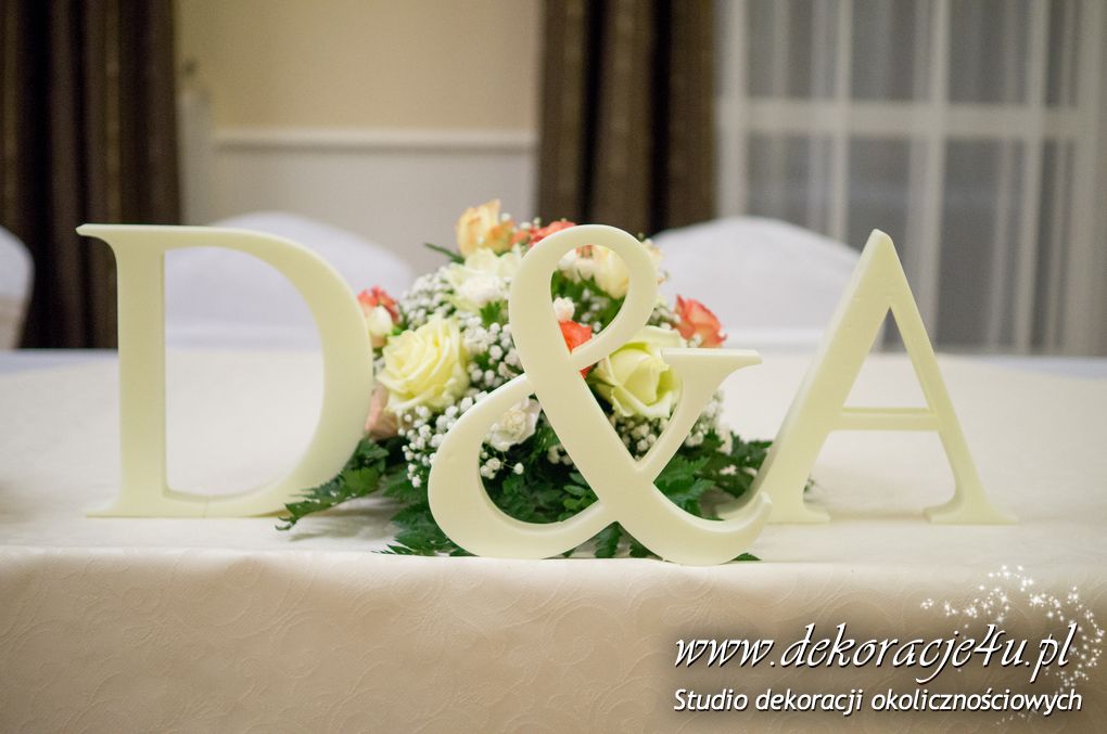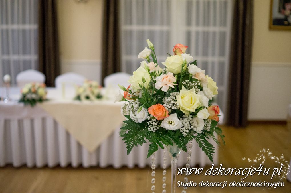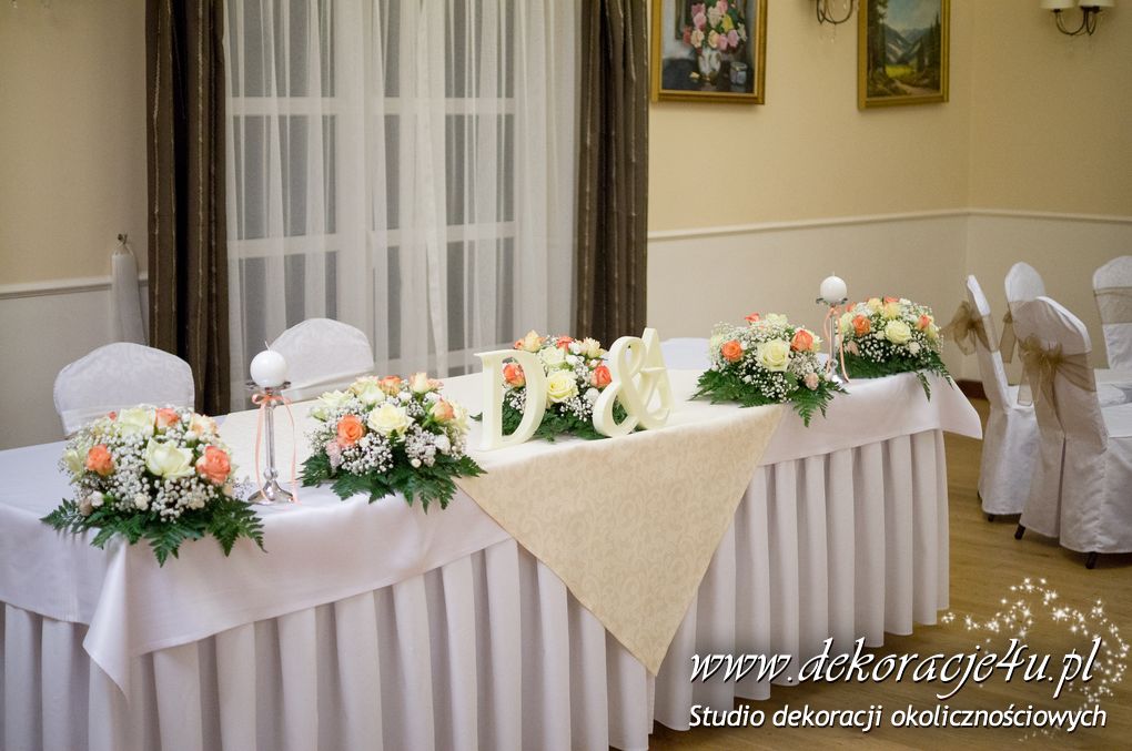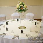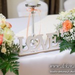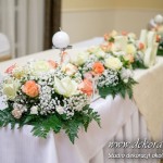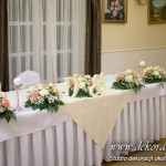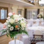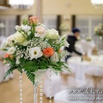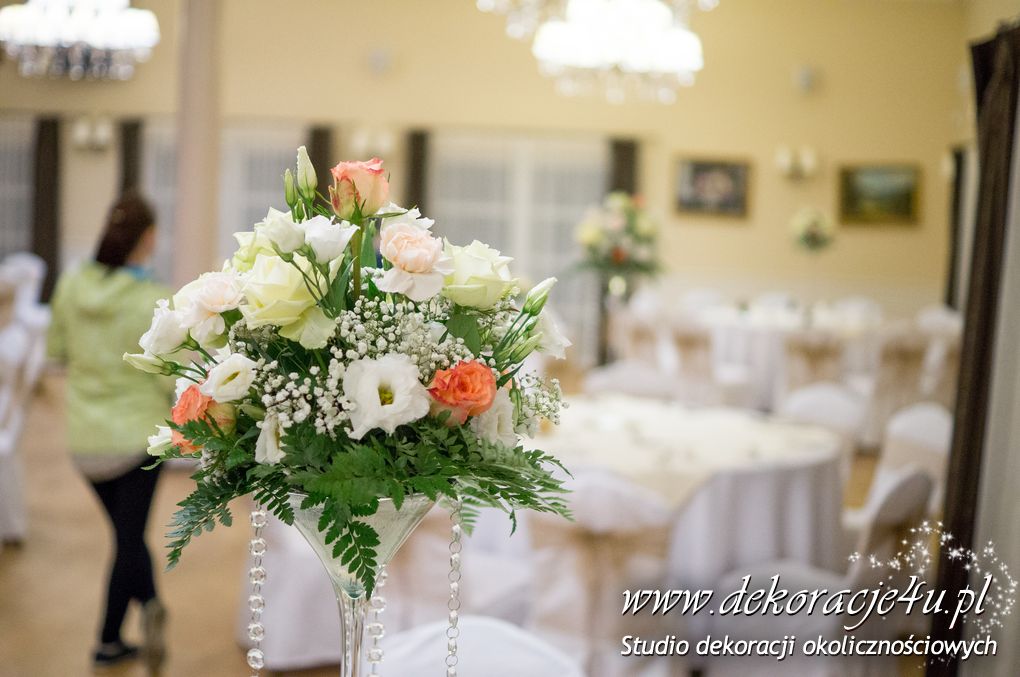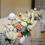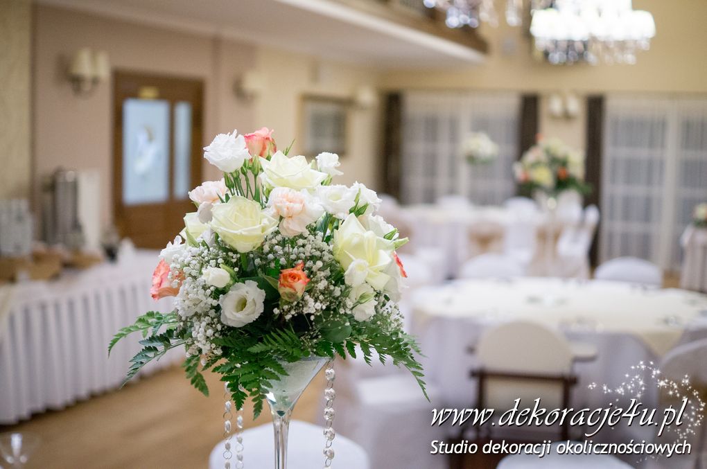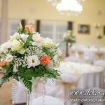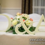 W pięknej białej sali przyozdobiliśmy krzesła i stoły dla gości oraz stół dla młodych, kwiaty w delikatnych kolorach i kryształki zwisające z wazonów oraz inicjały na stole Młodej Pary.