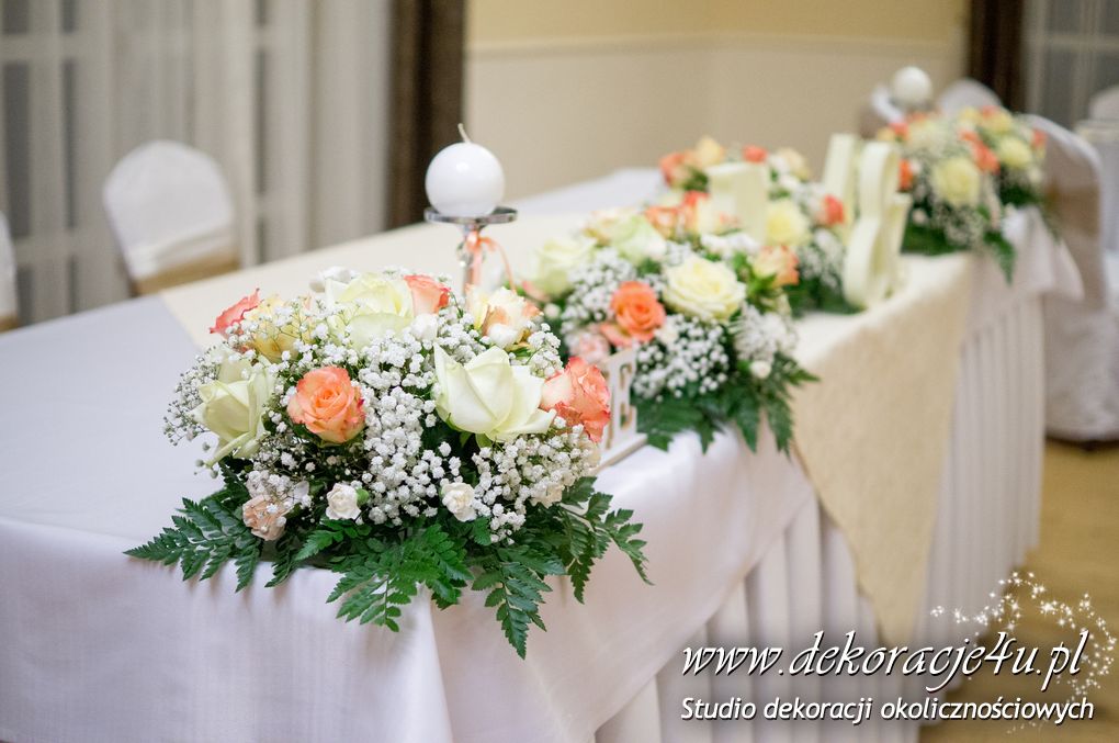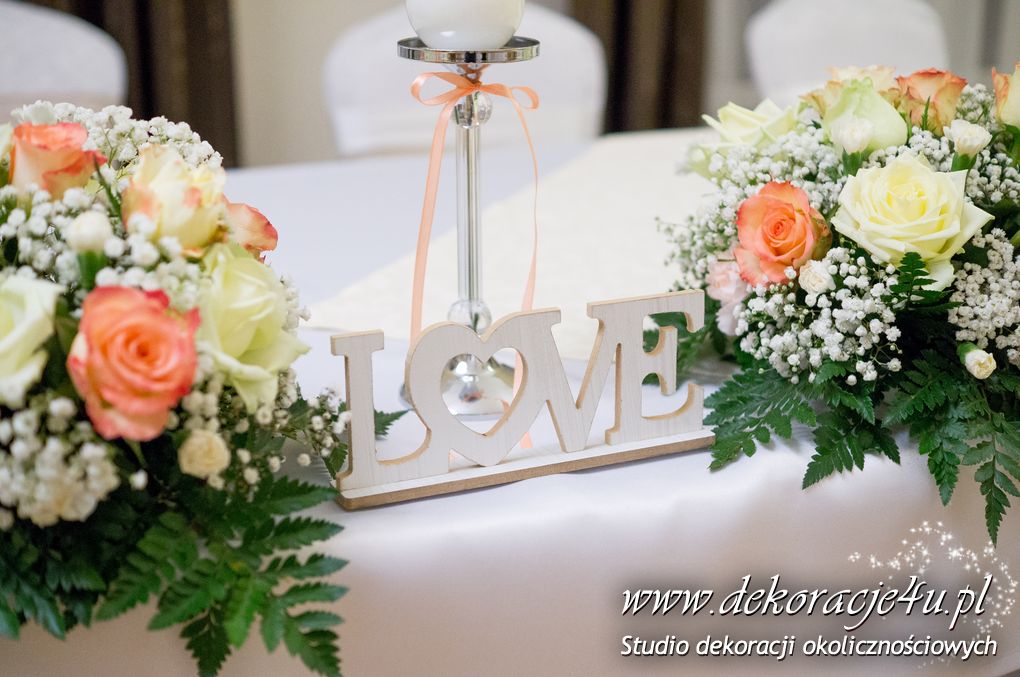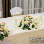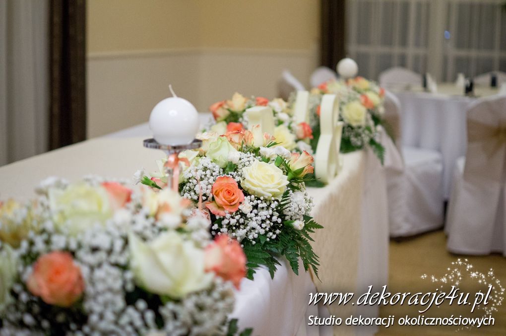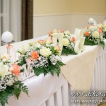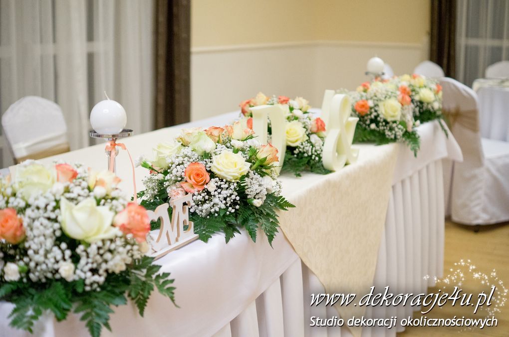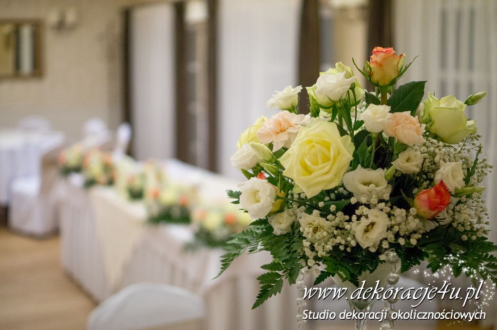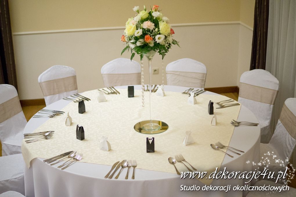 W pięknej białej sali przyozdobiliśmy krzesła i stoły dla gości oraz stół dla młodych, kwiaty w delikatnych kolorach i kryształki zwisające z wazonów oraz inicjały na stole Młodej Pary.