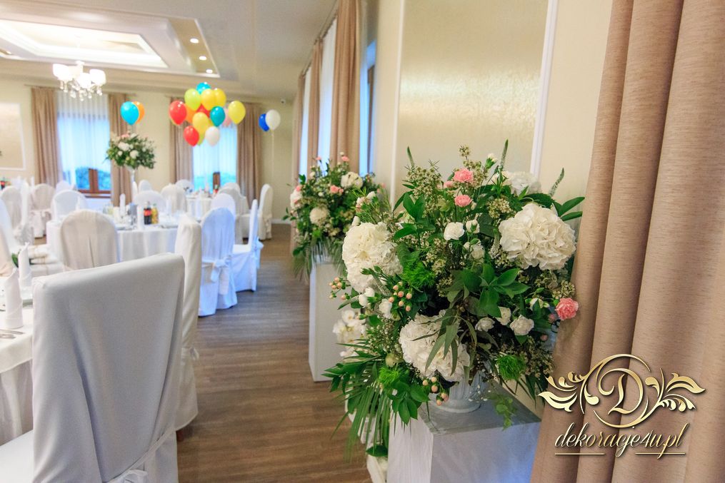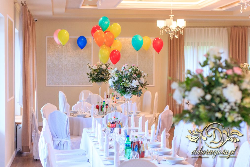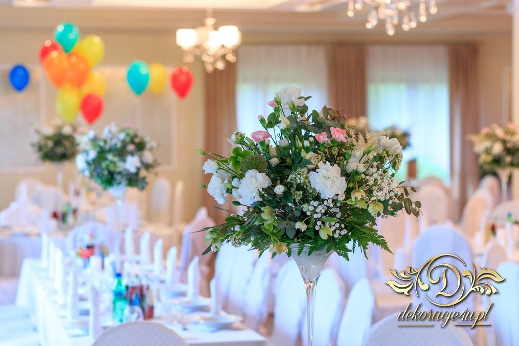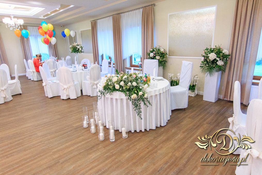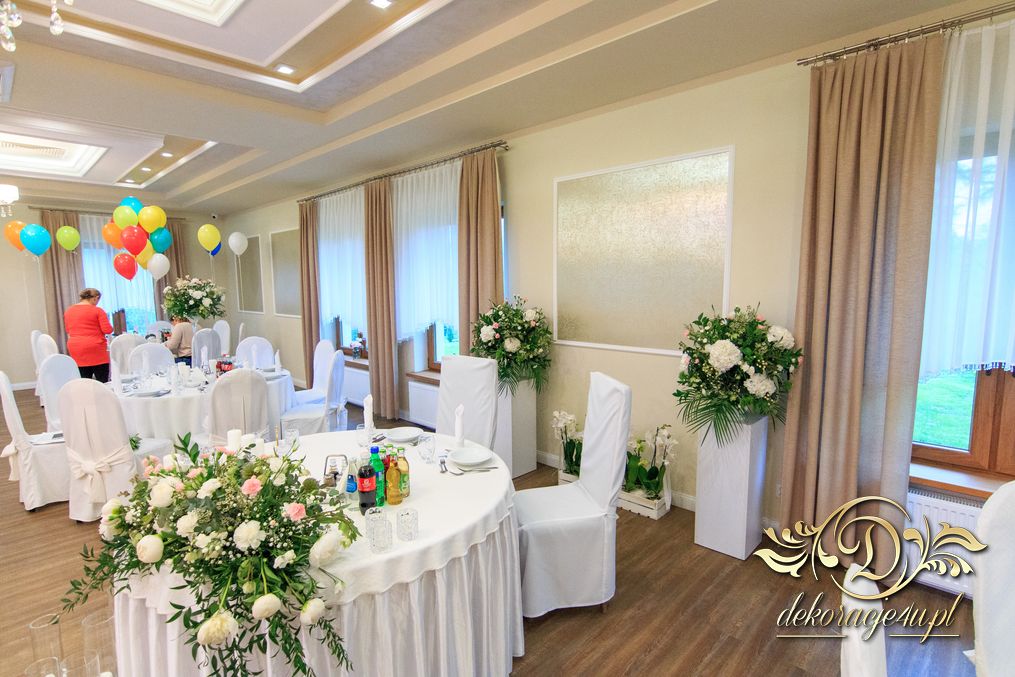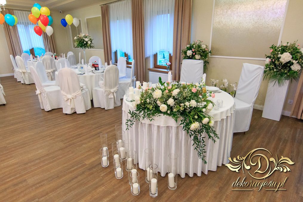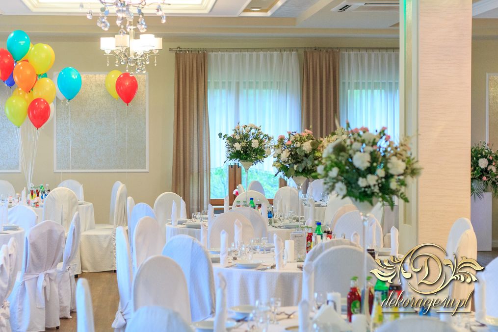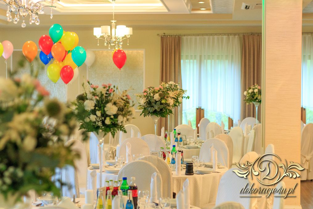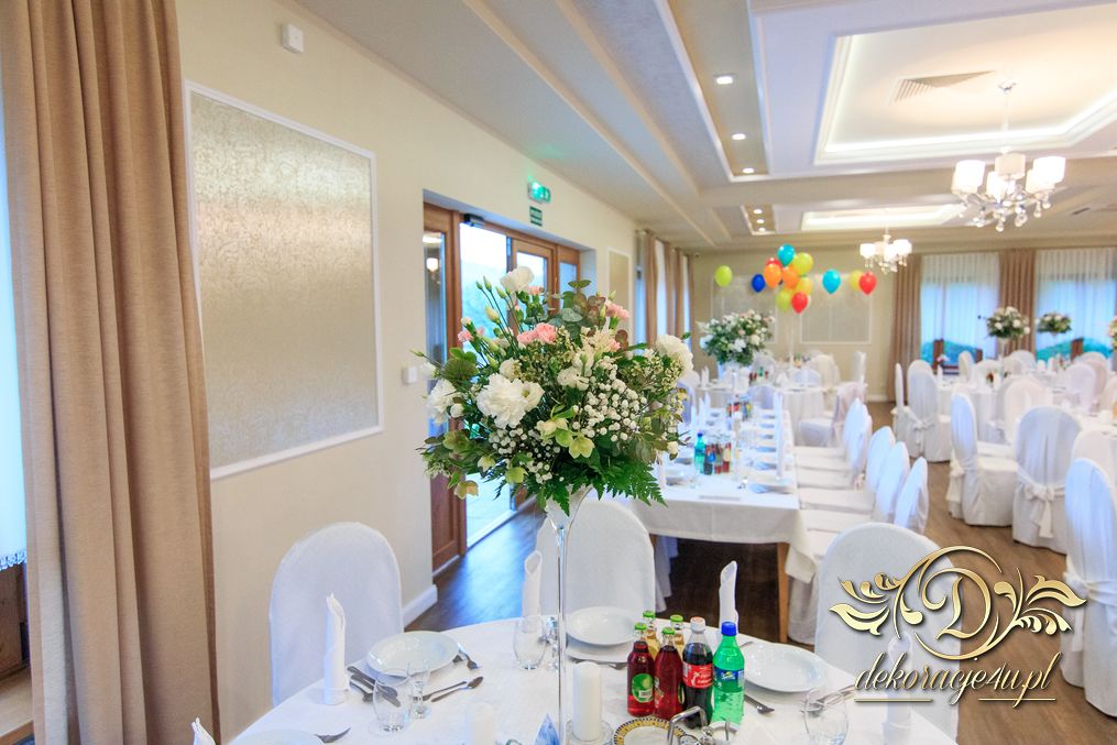 Dekoracja sali w innym stylu. Gospoda Magurska - wielkie bukiety kwiatów, pokażny bukiet na stół główny. Dla dzieci oczywiście nie mogło zabraknąć balonów z helem. Przy każdym bukiecie świeczki, tealighty, a przed stołem Państwa Młodych tuby ze świecami.