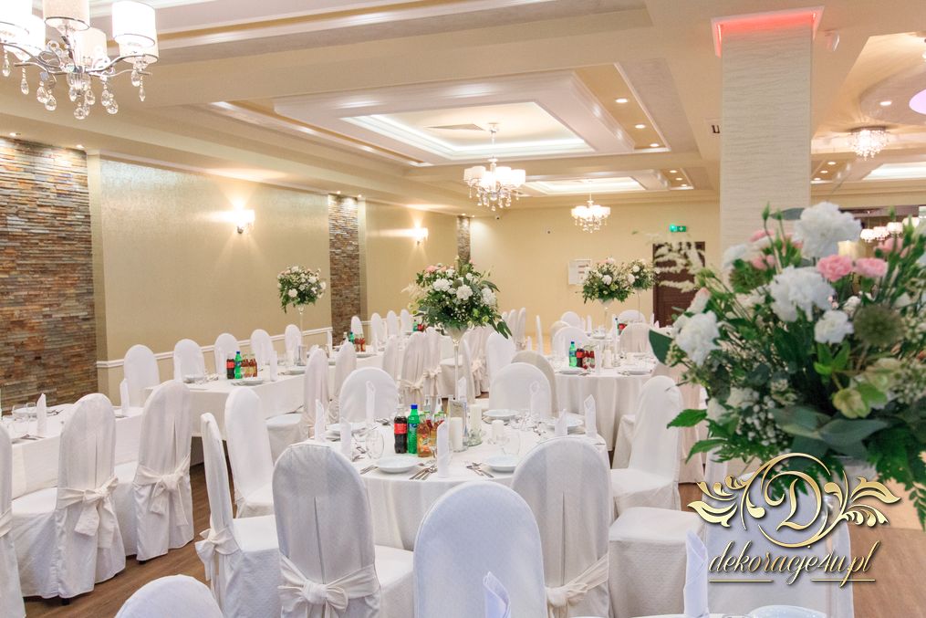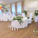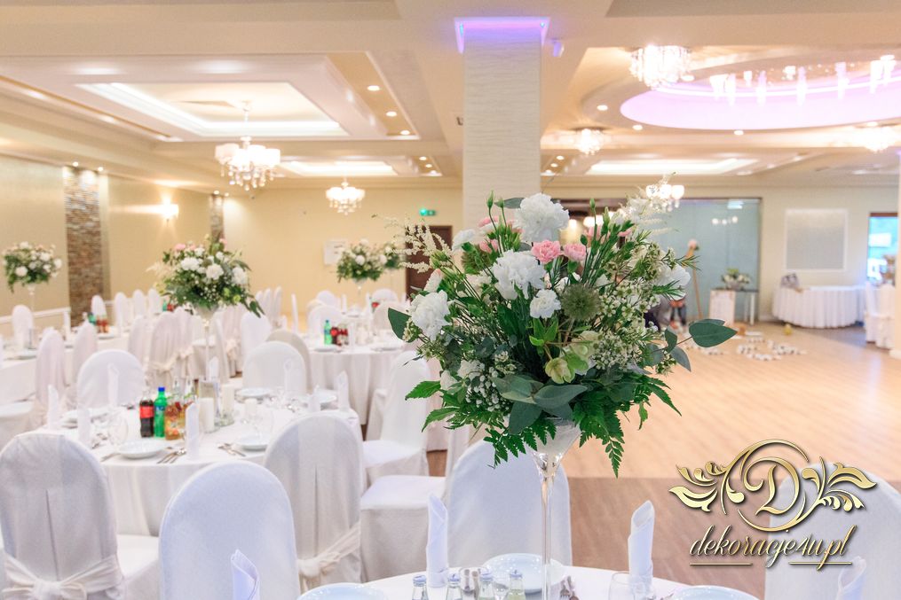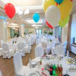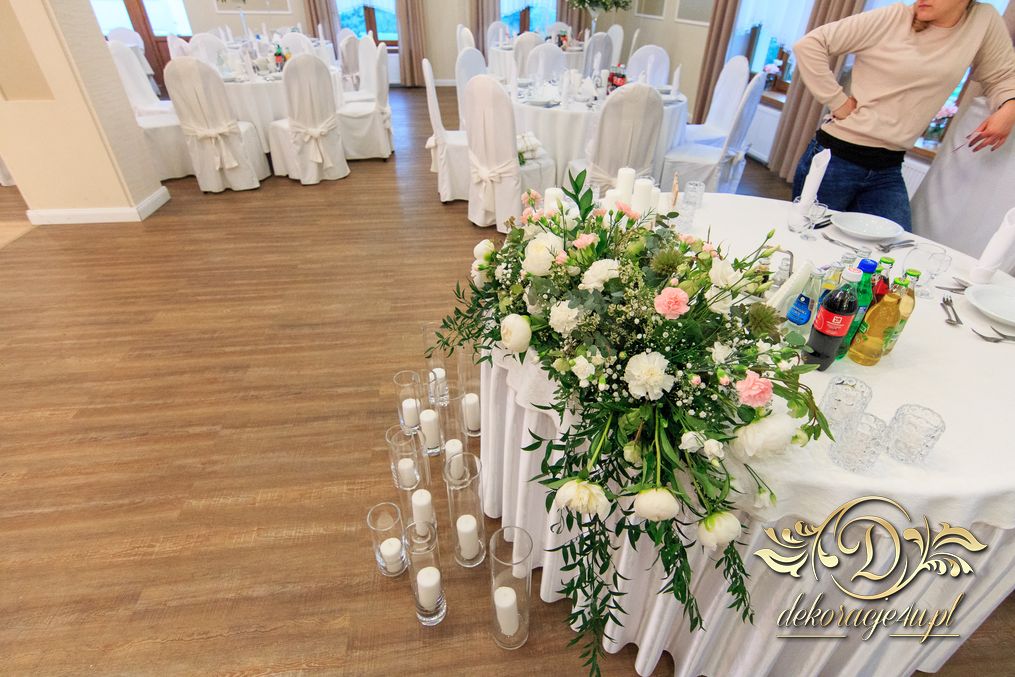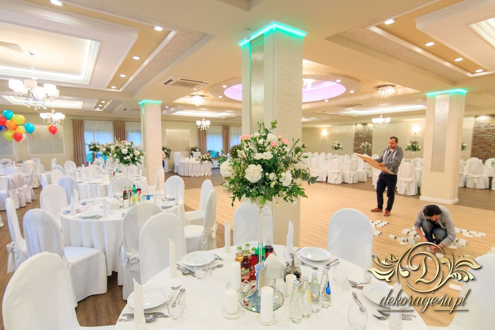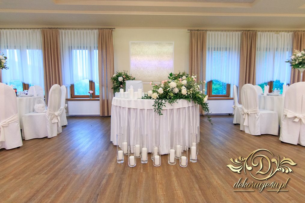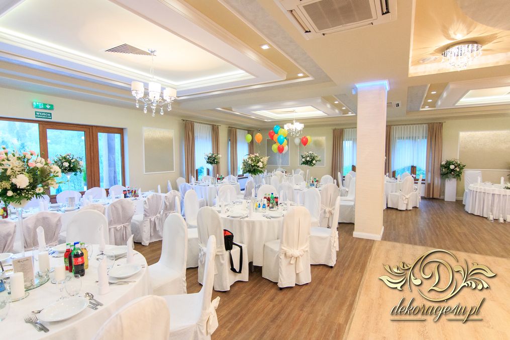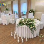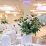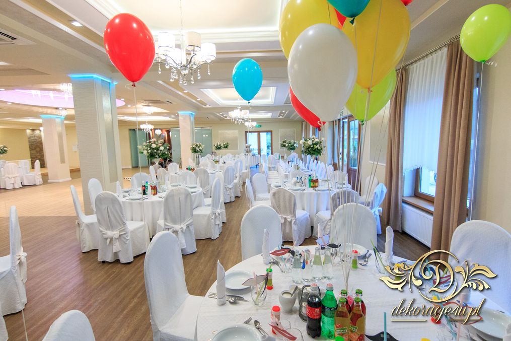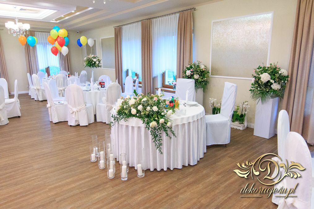 Dekoracja sali w innym stylu. Gospoda Magurska - wielkie bukiety kwiatów, pokażny bukiet na stół główny. Dla dzieci oczywiście nie mogło zabraknąć balonów z helem. Przy każdym bukiecie świeczki, tealighty, a przed stołem Państwa Młodych tuby ze świecami.