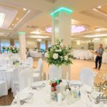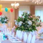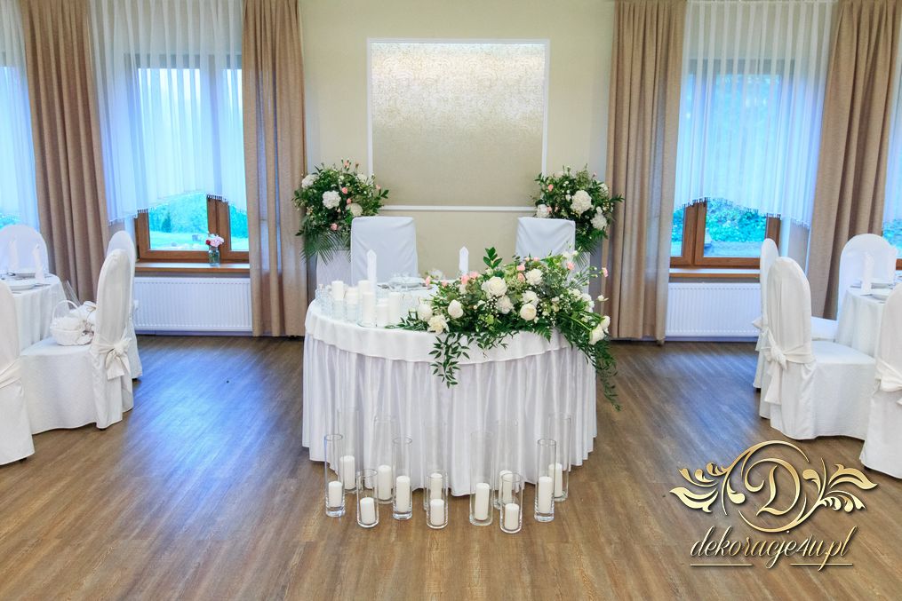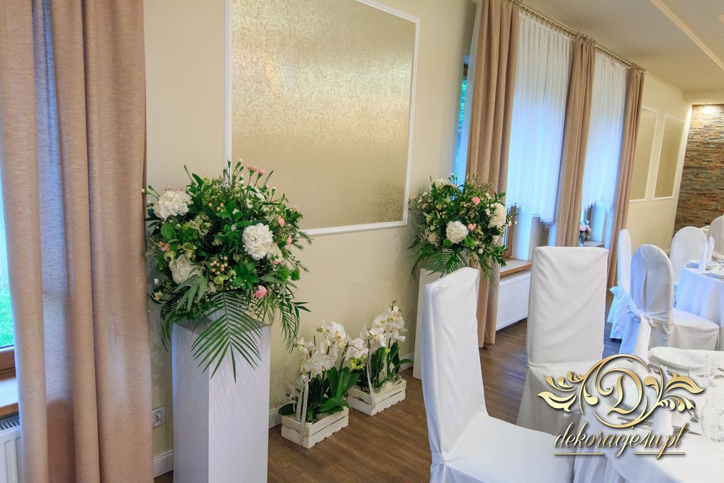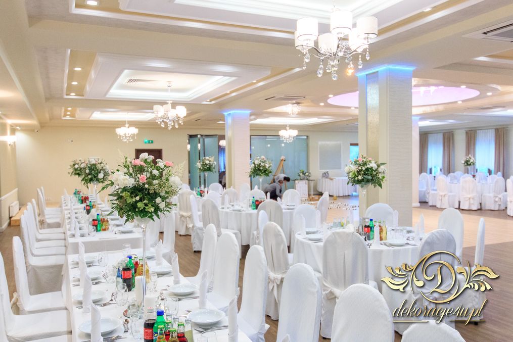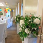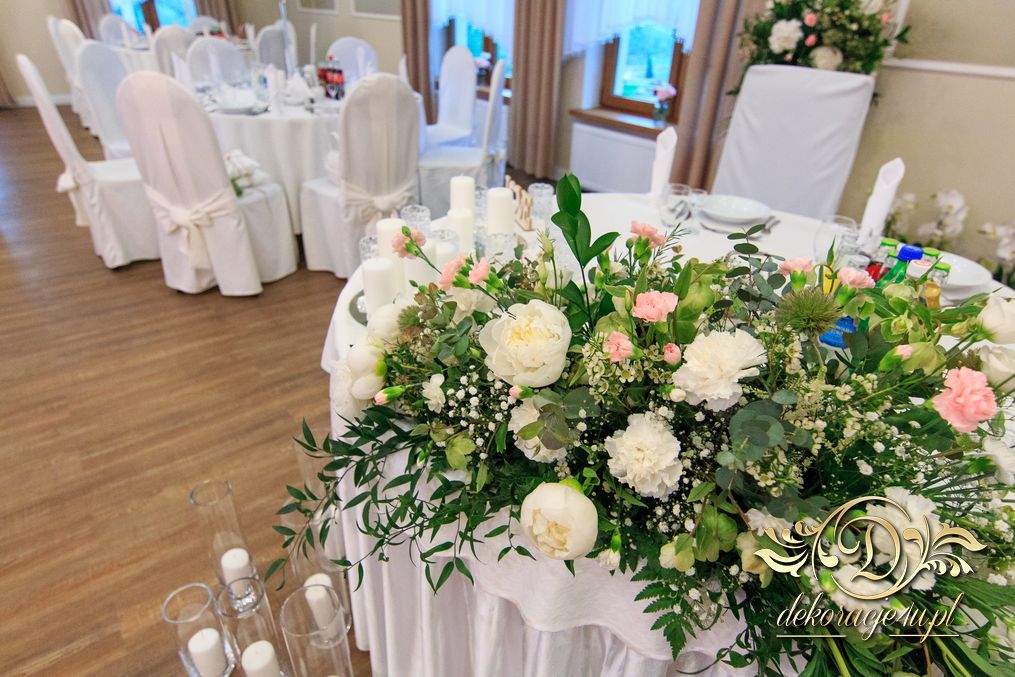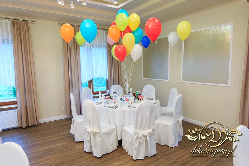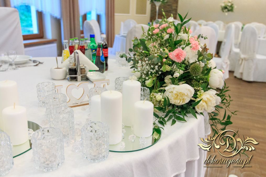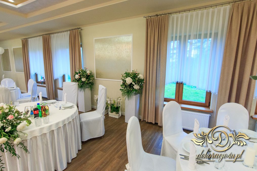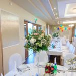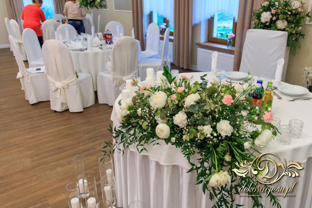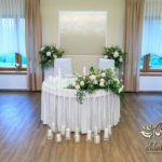 Dekoracja sali w innym stylu. Gospoda Magurska - wielkie bukiety kwiatów, pokażny bukiet na stół główny. Dla dzieci oczywiście nie mogło zabraknąć balonów z helem. Przy każdym bukiecie świeczki, tealighty, a przed stołem Państwa Młodych tuby ze świecami.