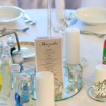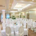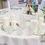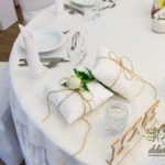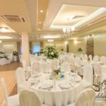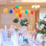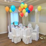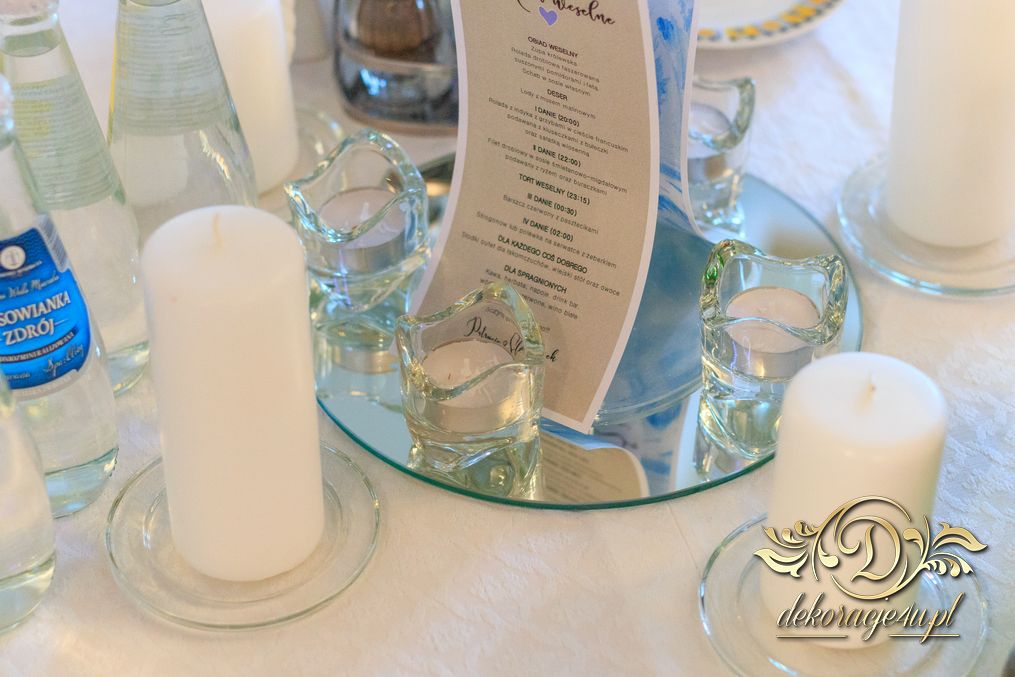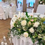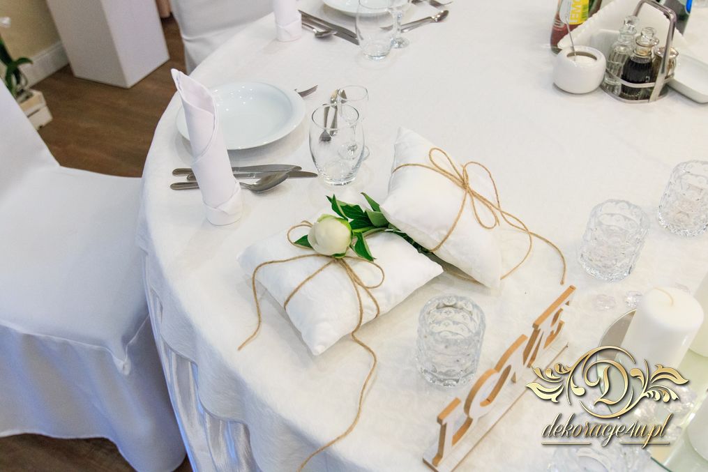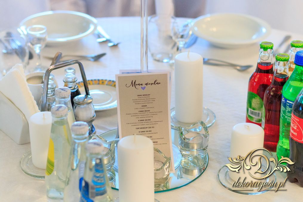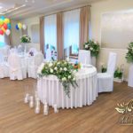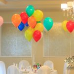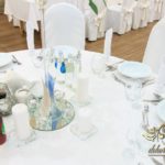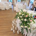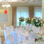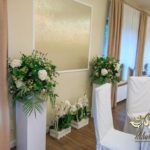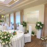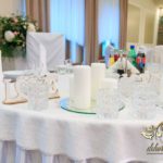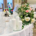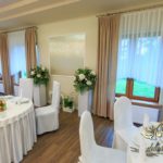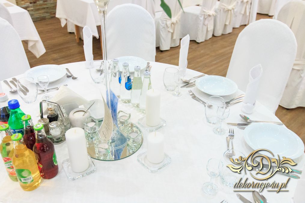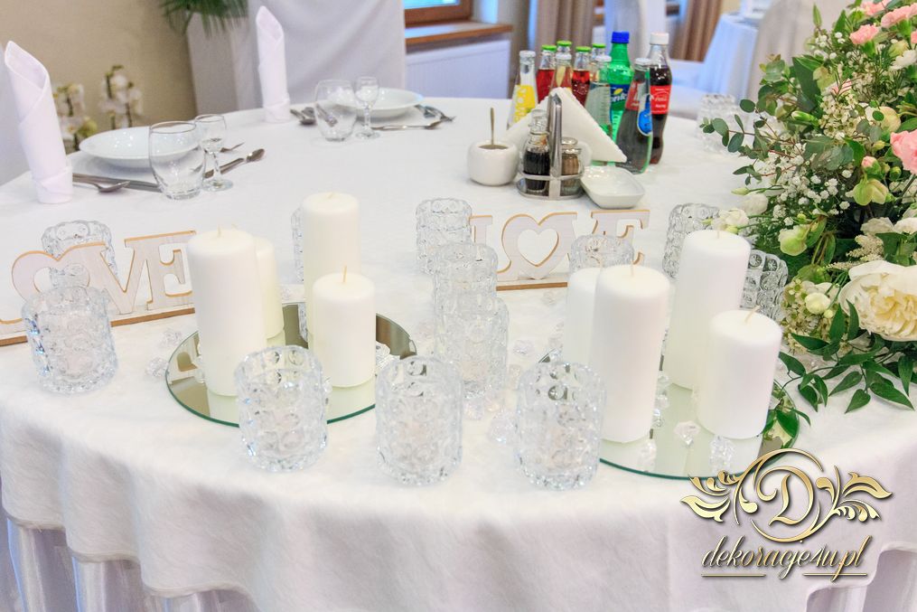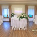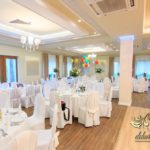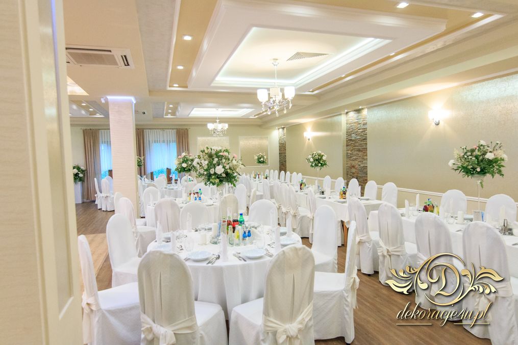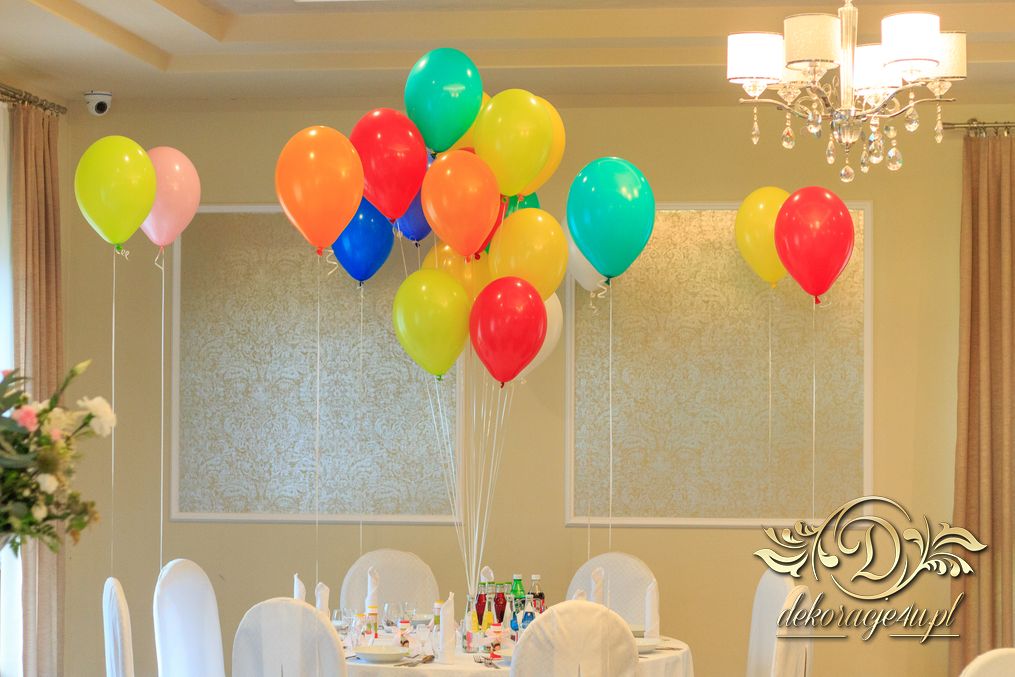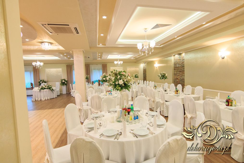 Dekoracja sali w innym stylu. Gospoda Magurska - wielkie bukiety kwiatów, pokażny bukiet na stół główny. Dla dzieci oczywiście nie mogło zabraknąć balonów z helem. Przy każdym bukiecie świeczki, tealighty, a przed stołem Państwa Młodych tuby ze świecami.