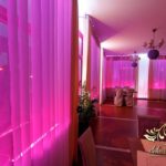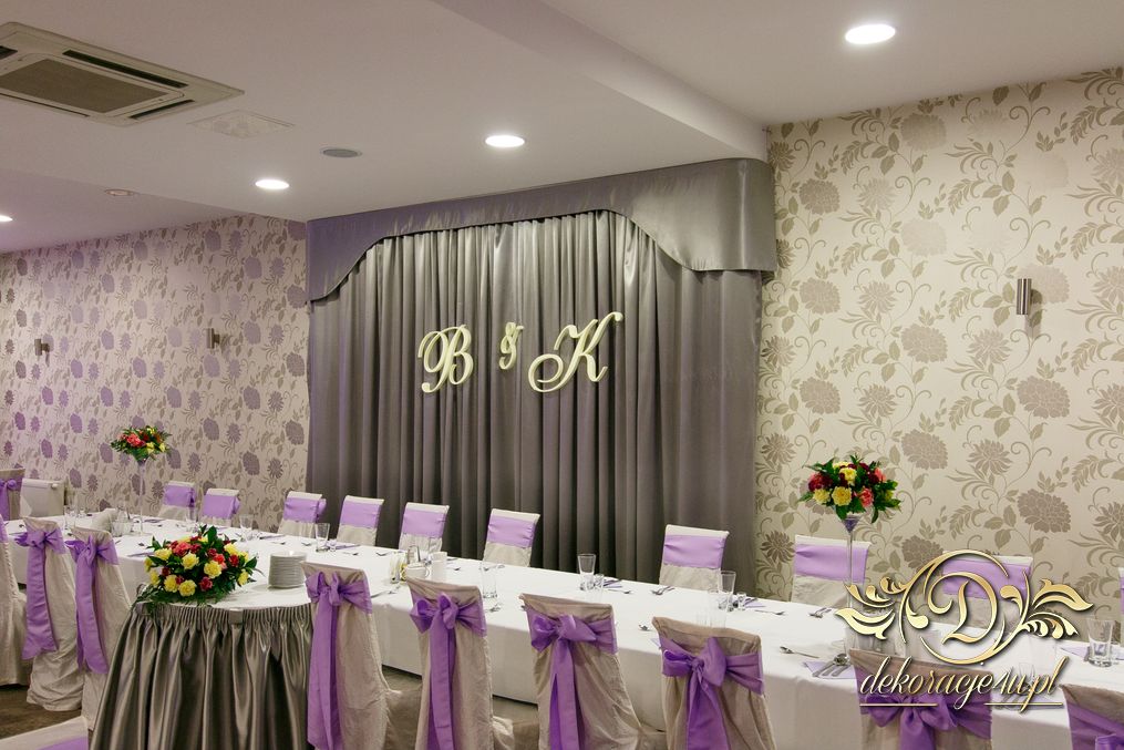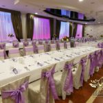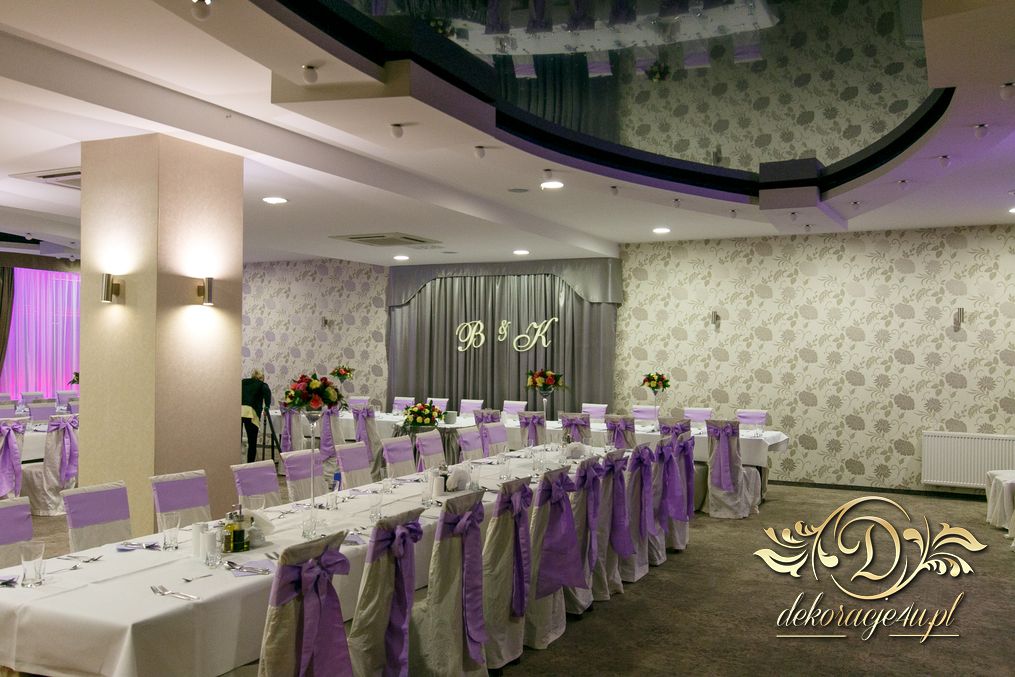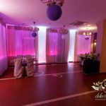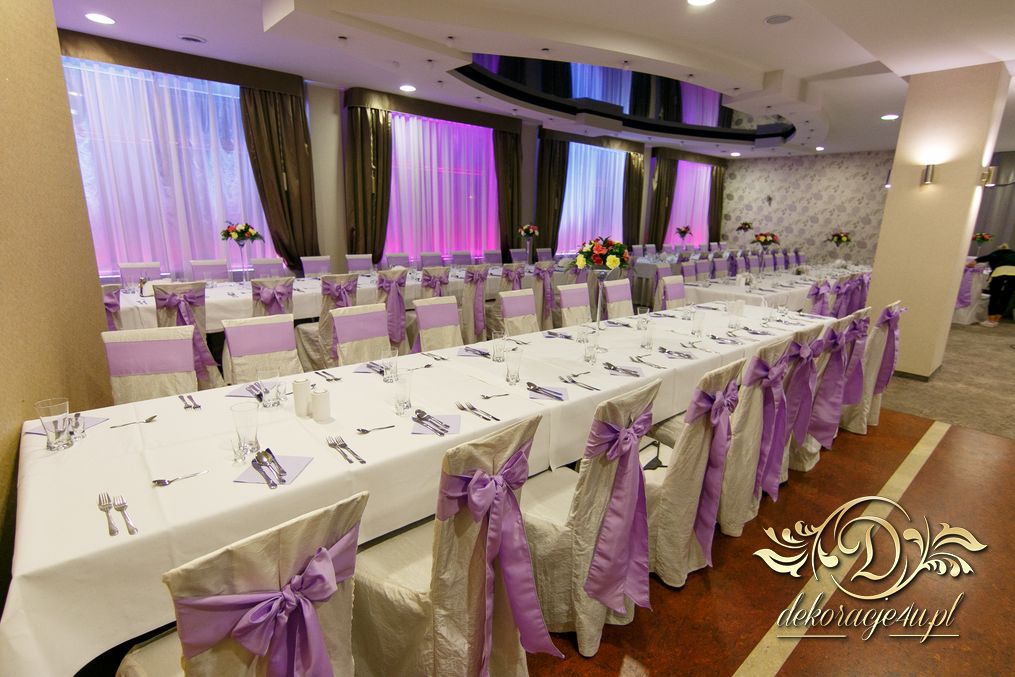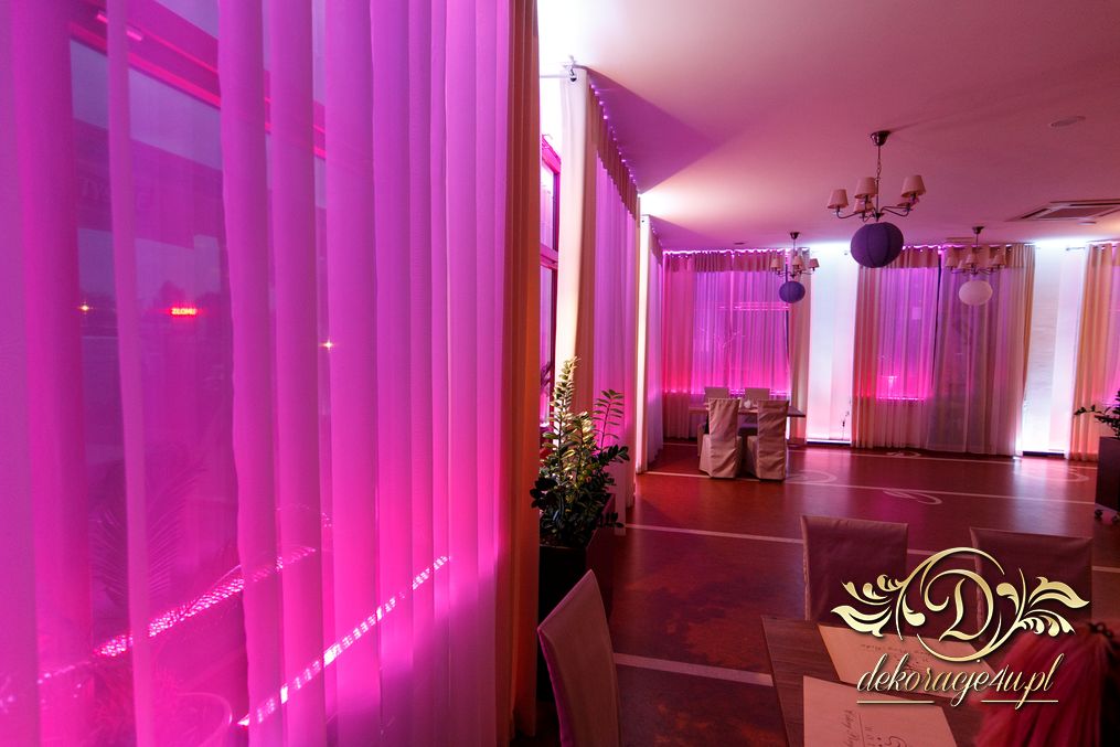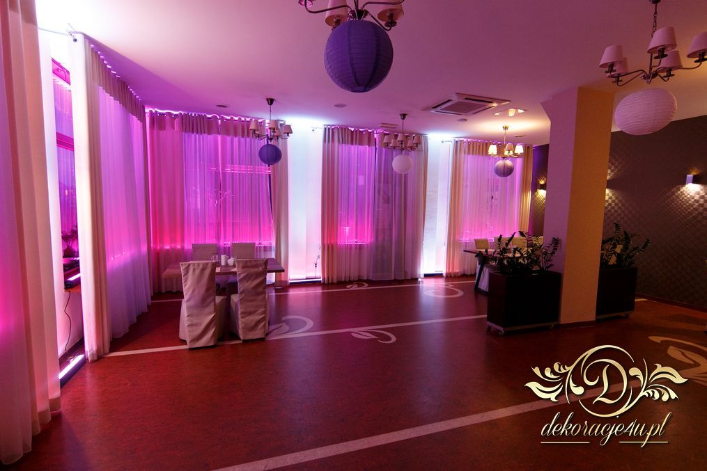 Dekoracja sali w Rudnej Małej Cztery Pory Roku w kokardy na krzesłach, a dodatkowo na dwóch salach podświetlone wszystkie okna lampami ledowymi.