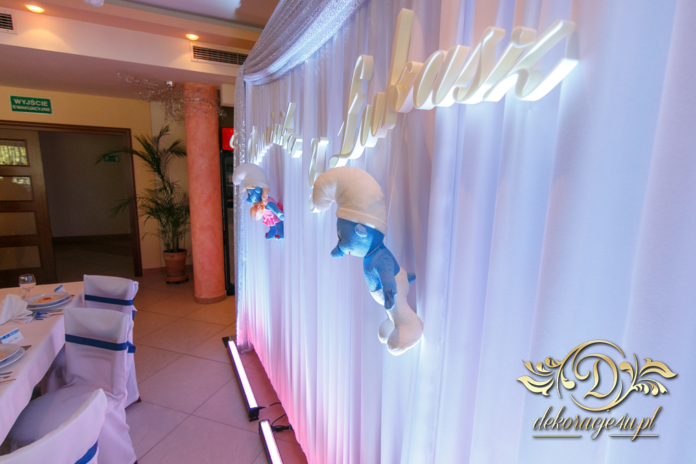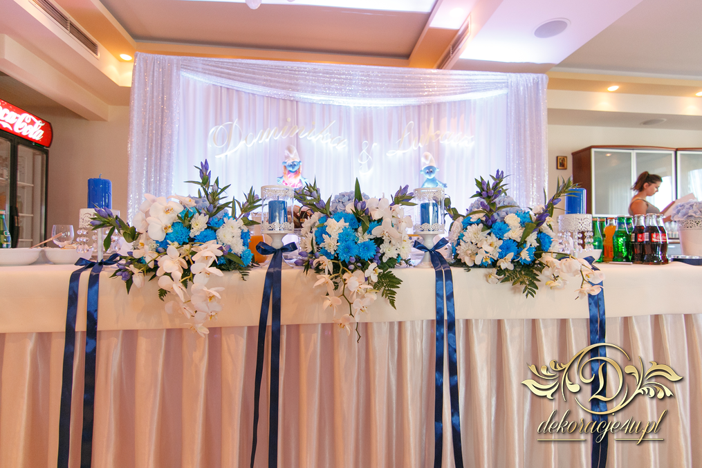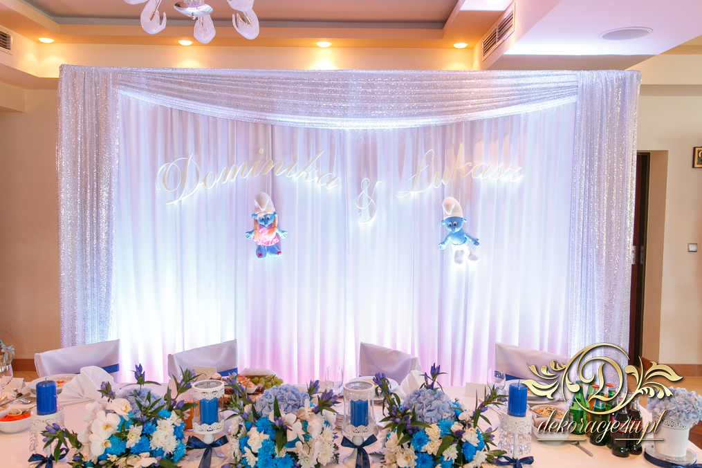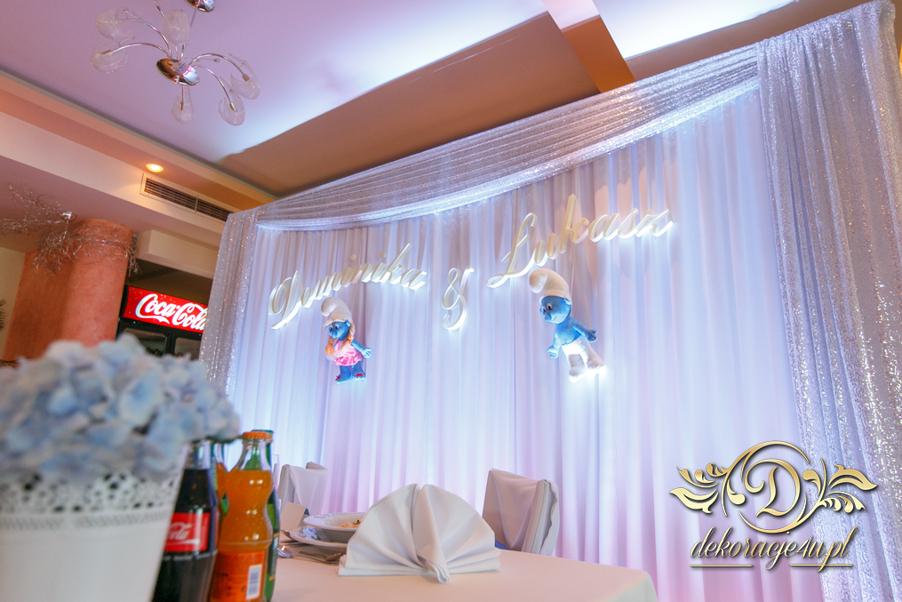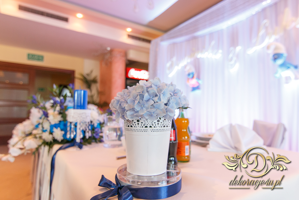 Motyw przewodni - smerfy i kolor niebieski. Efekt naprawdę zapierał dech w piersiach. Kwiaty, ścianka, krzesła, kokardki....