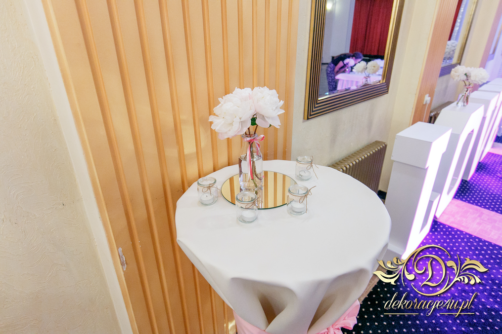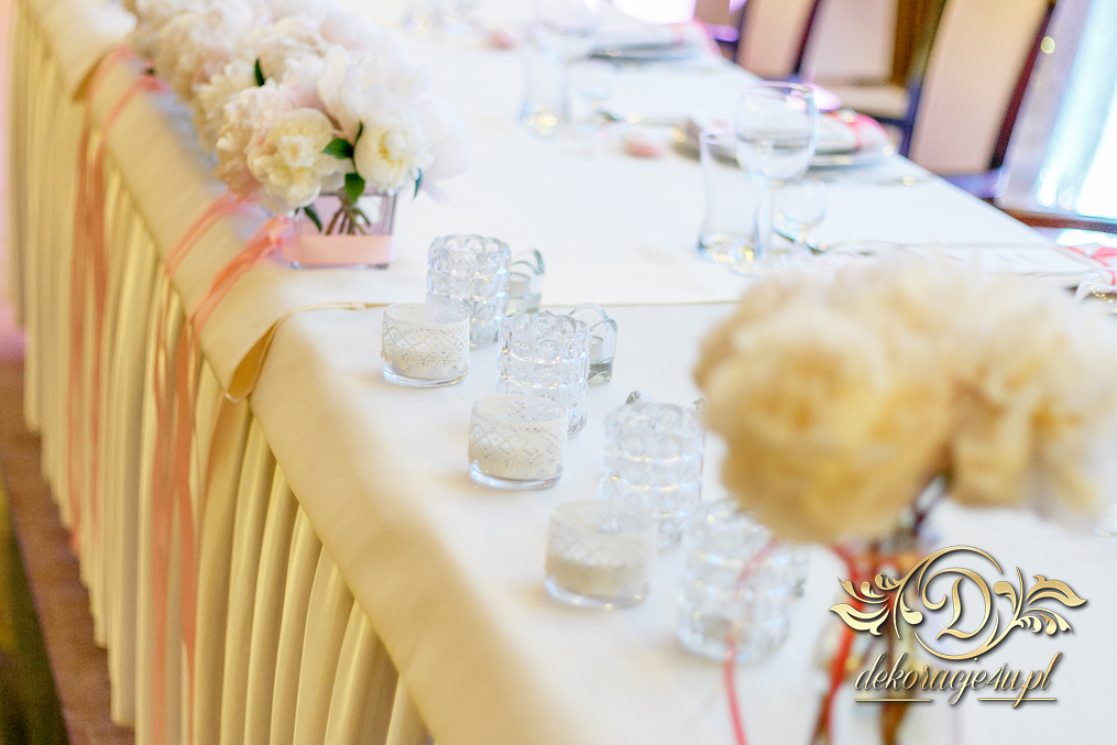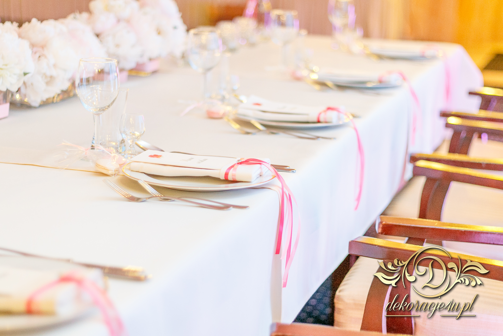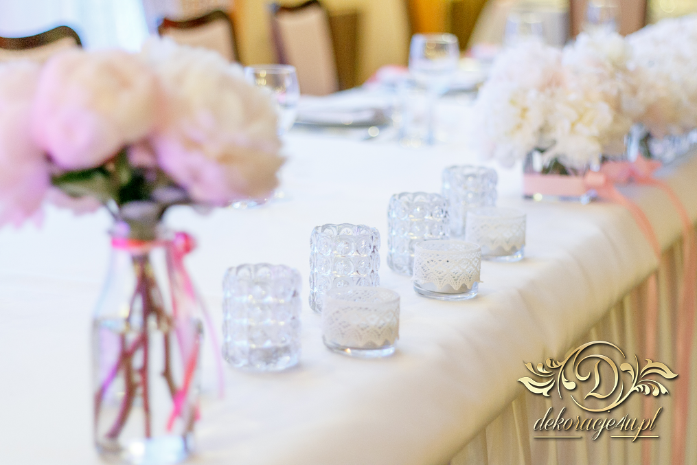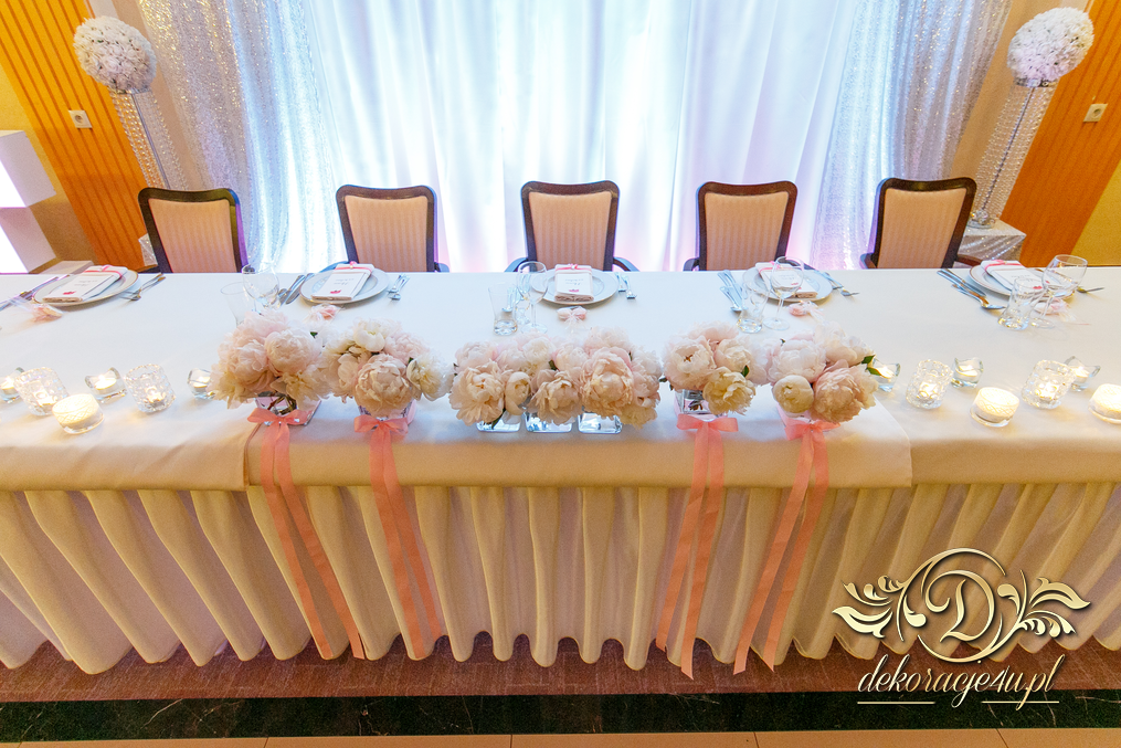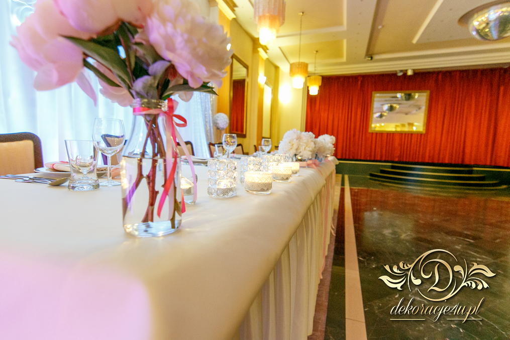 Cała dekoracja sali w piwoniach. Pani Młoda, która uwielbia piwonie postanowiła swój zachwyt przenieść także do bukietów ślubnych jak i na sale weselna. Efekt - zobaczcie sami.